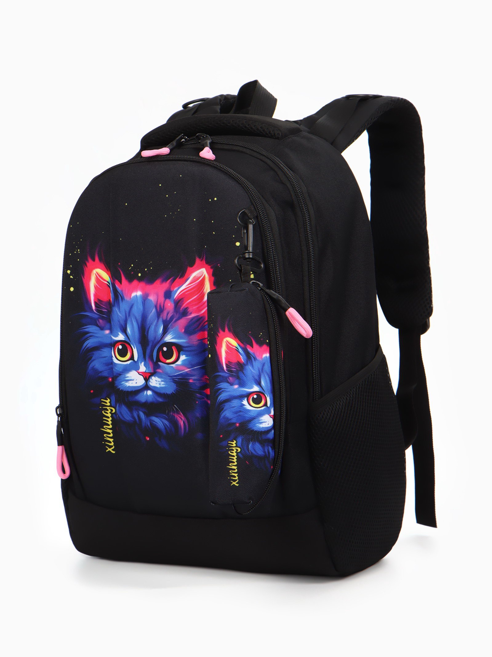 Рюкзак школьный "Котик", эргономичная спинка, с пеналом, 32x17x41 см, чёрный, 17x32x41 см., Китай