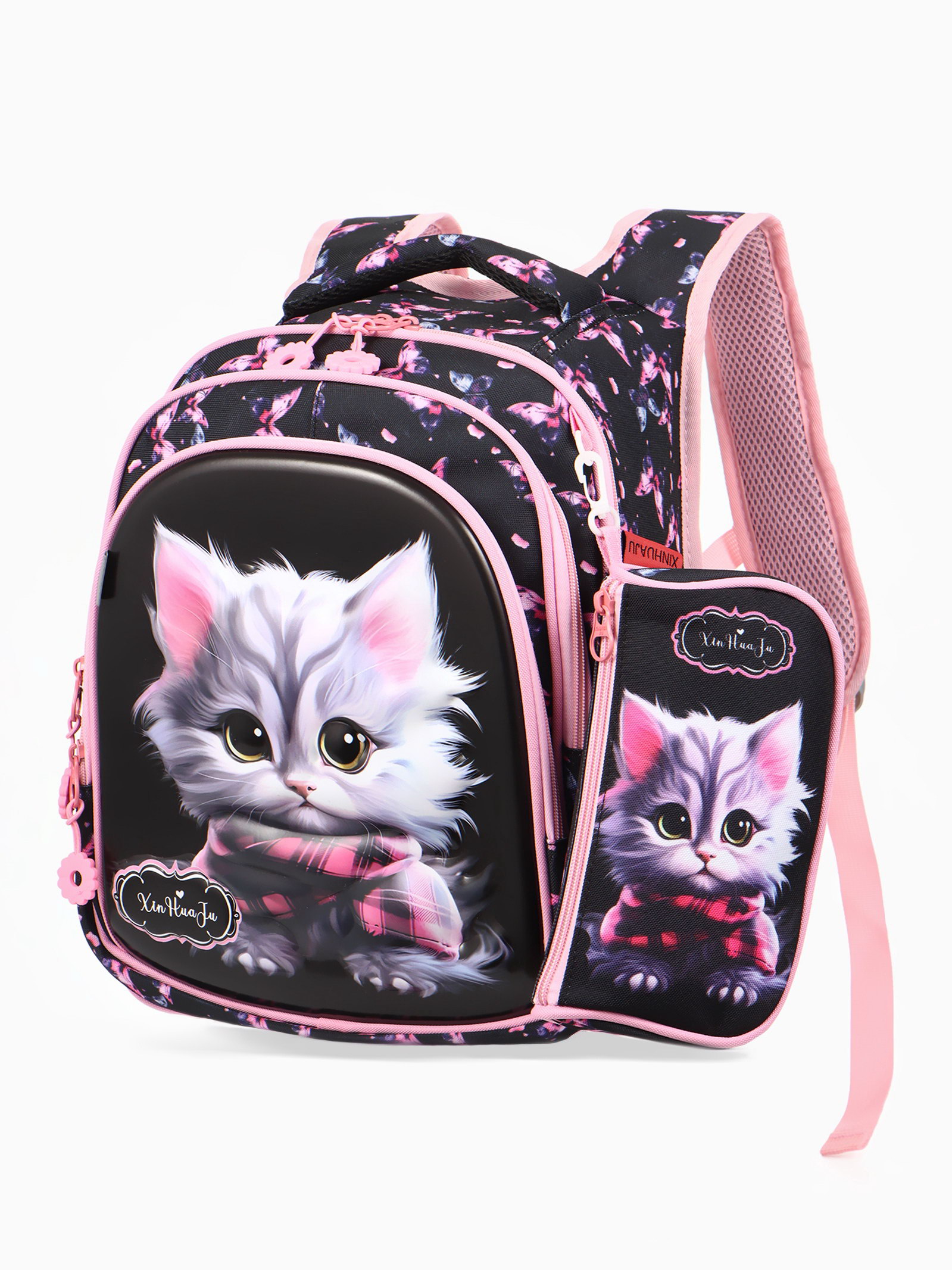 Рюкзак школьный "Кошечка", для девочки, с пеналом, эргономичная спинка, 29x14x38 см, чёрный, розовый, 14x29x38 см., Китай