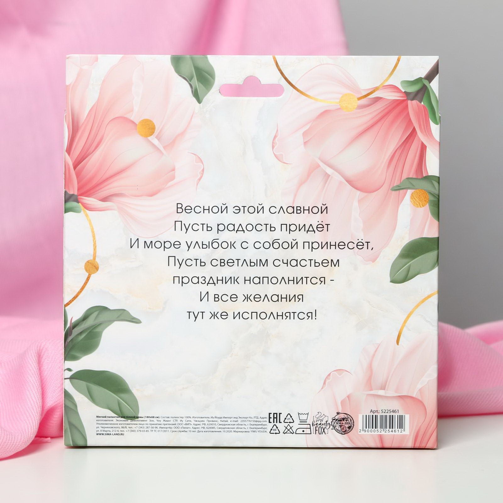 Размер упаковки: 19 x 4 x 18 см. Размер упаковки: 19 x 4 x 18 см. tnved: 6214300000 Тематика праздника: 8 Марта Для кого: Для женщины Составляющие набора: Шарф/платок Цвет: Розовый Сезон: Всесезонный Размер, см: 68 x 180 Состав ткани: Полиэстер | ||