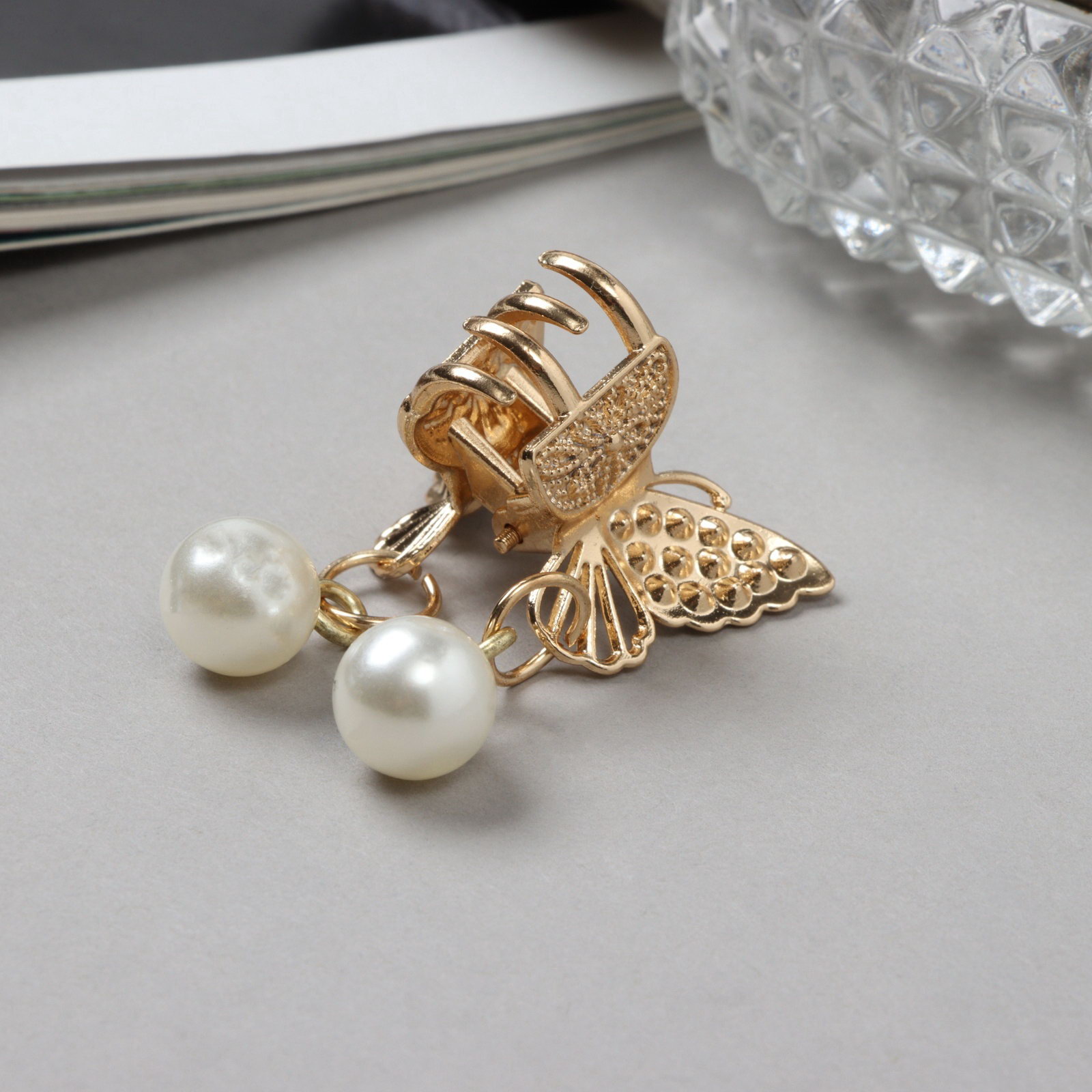 Крабик для волос "Милада", белые бусинки, 2.5 см, золото, 2.5 см., Китай