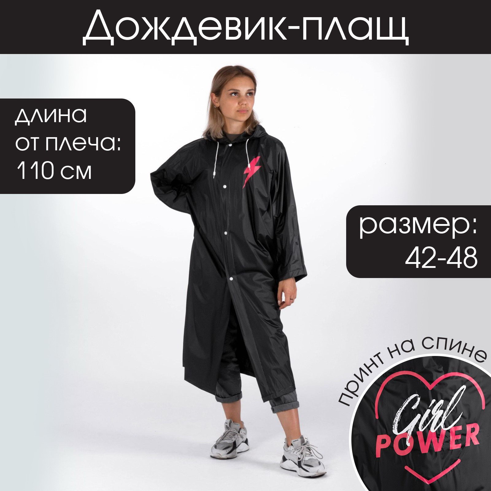 Дождевик-плащ Girl power, размер 42-48, 60x110 см, цвет чёрный, 20x30x2 см., Beauty Fox, Китай