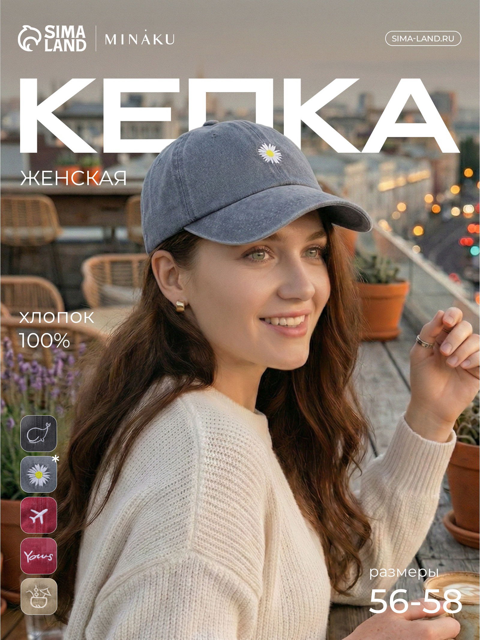 Кепка женская "Ромашка", размер 56-58, серая, вареный деним, 20x25x11 см., MINAKU, Китай