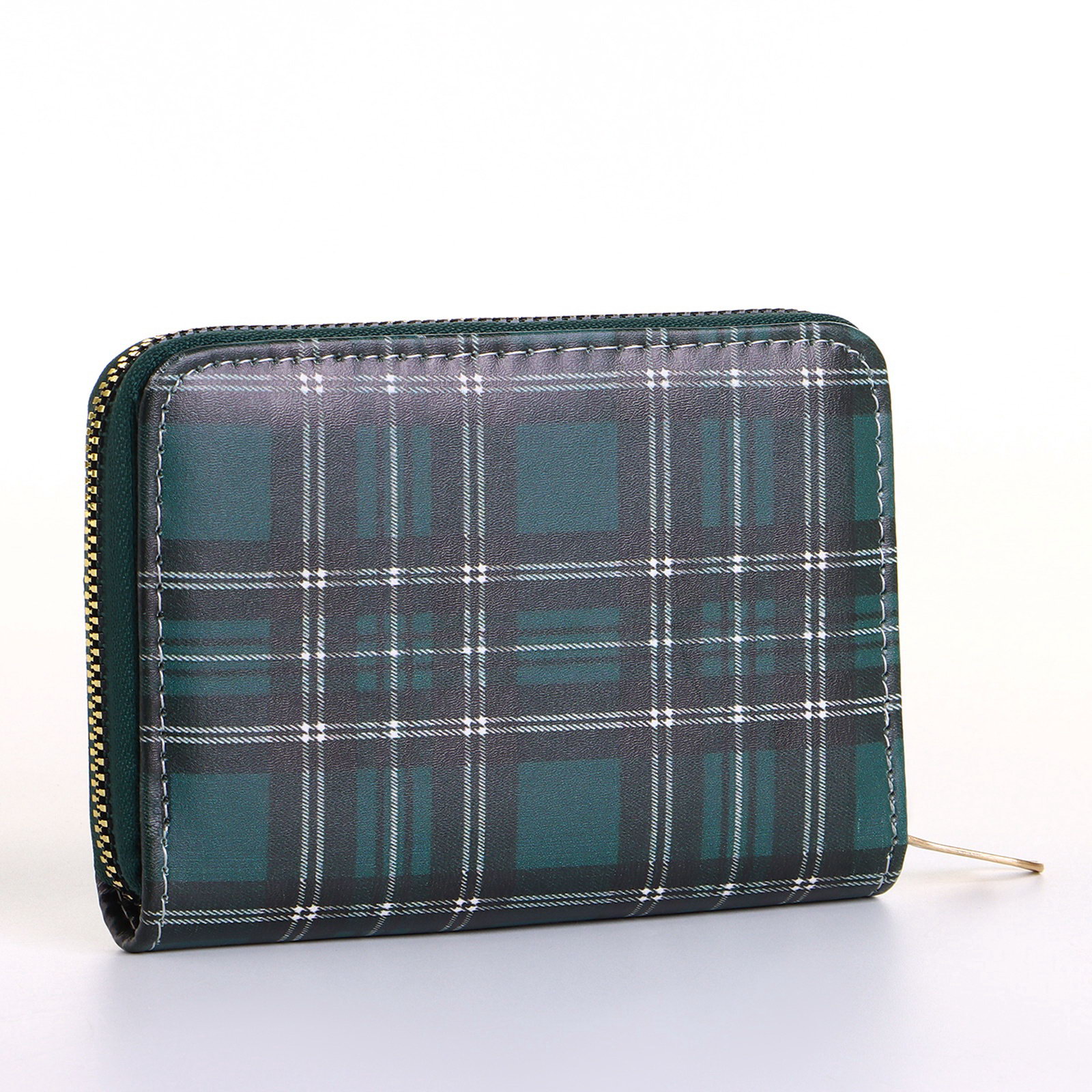 Кошелёк на молнии "Клетка", маленький, 3 отделения, зелёный, 2x13x9 см., Китай