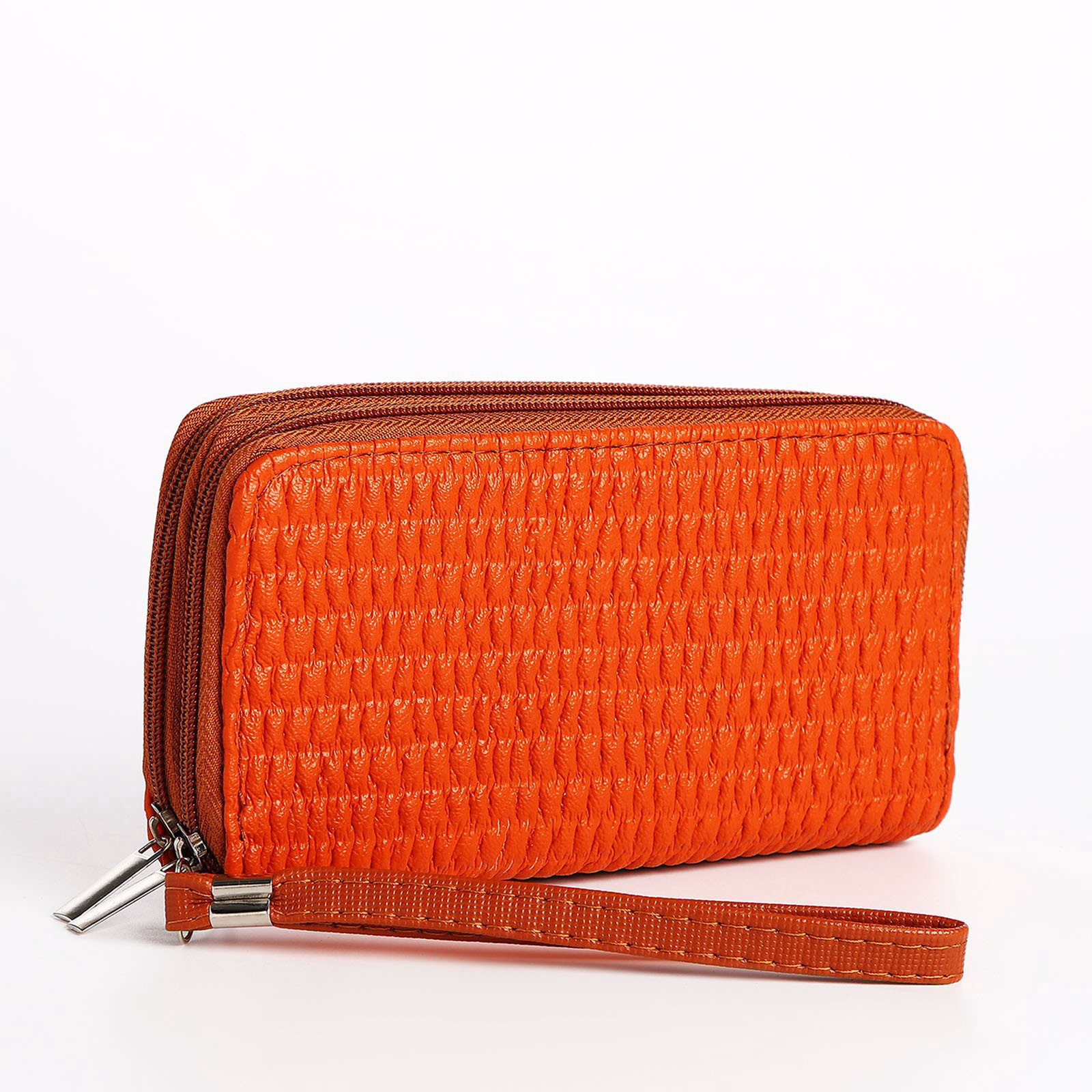 Кошелёк женский на молниях с ремешком, 19x4x9.5 см, текстурный, оранжевый, 4x19x9.5 см., Китай