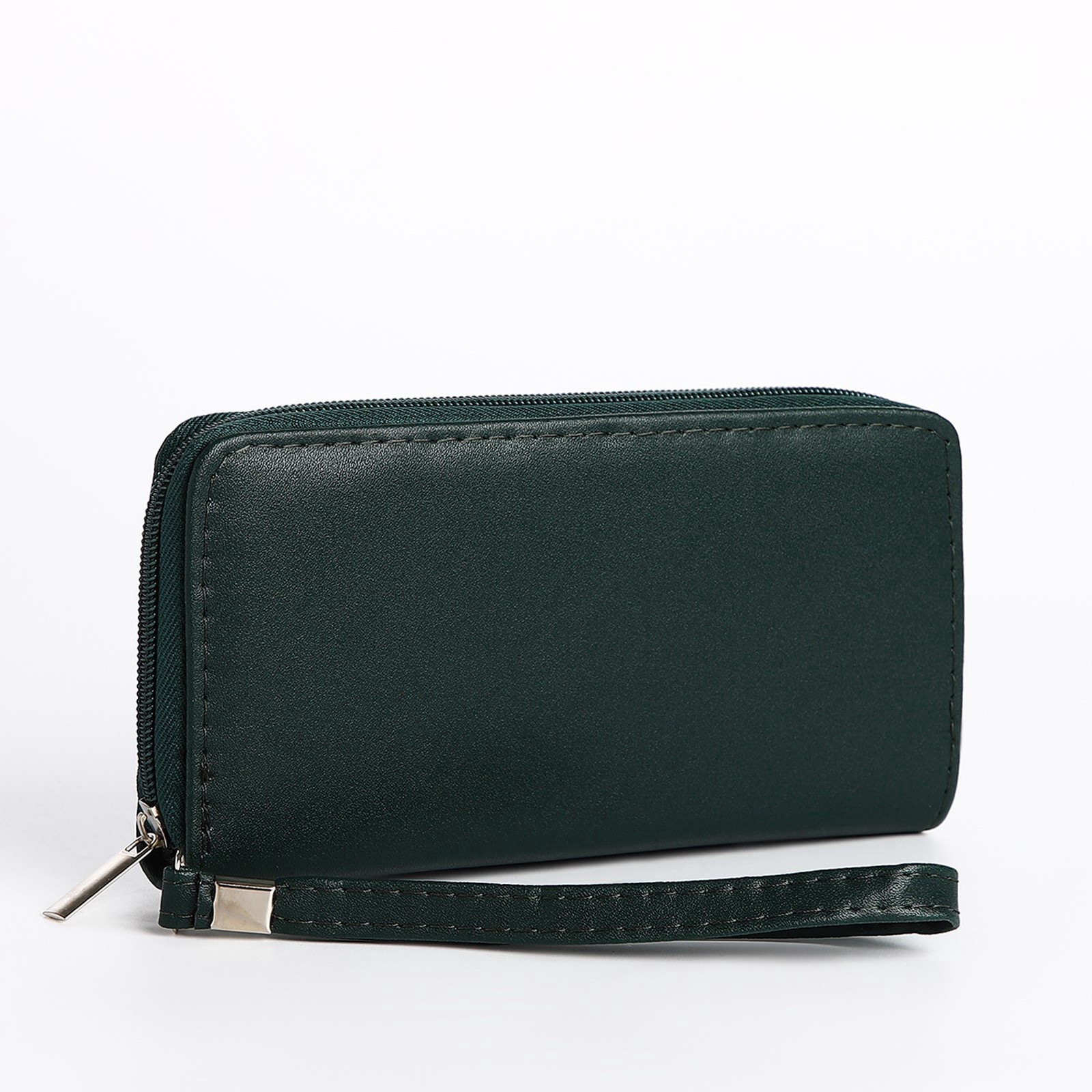 Кошелёк женский на молнии с ремешком, 19.5x2.5x10 см, однотонный, тёмно-зелёный, 2.5x19.5x10 см., Китай
