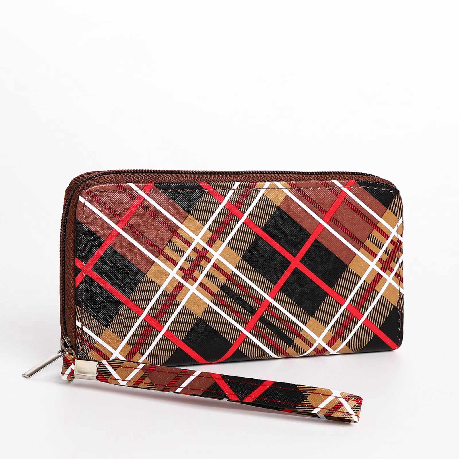 Кошелёк женский на молнии с ремешком, 19.5x2.5x10 см, в клетку, коричневый, 2.5x19.5x10 см., Китай