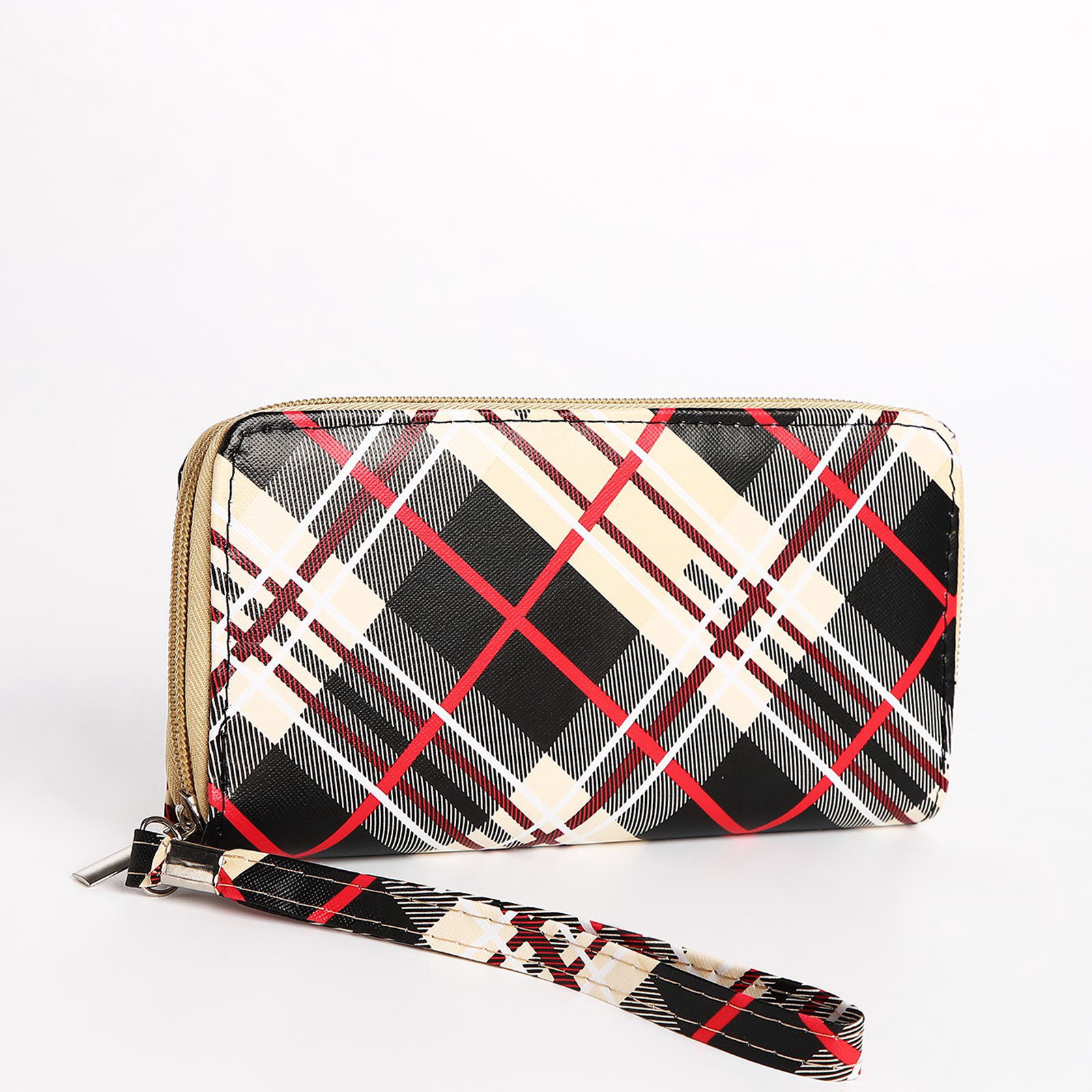 Кошелёк женский на молнии с ремешком, 19.5x2.5x10 см, в клетку, бежевый, 2.5x19.5x10 см., Китай