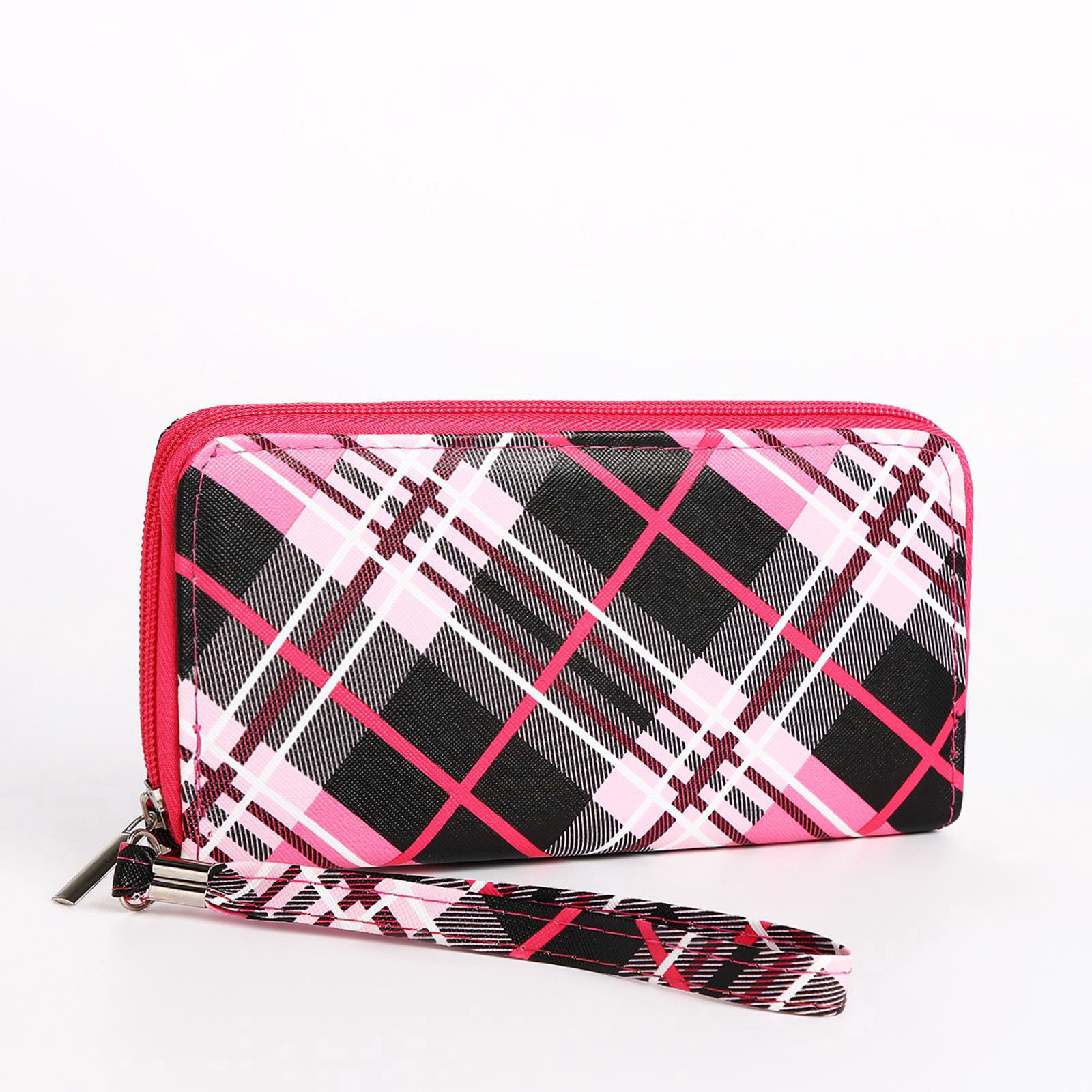 Кошелёк женский на молнии с ремешком, 19.5x2.5x10 см, в клетку, розовый, 2.5x19.5x10 см., Китай
