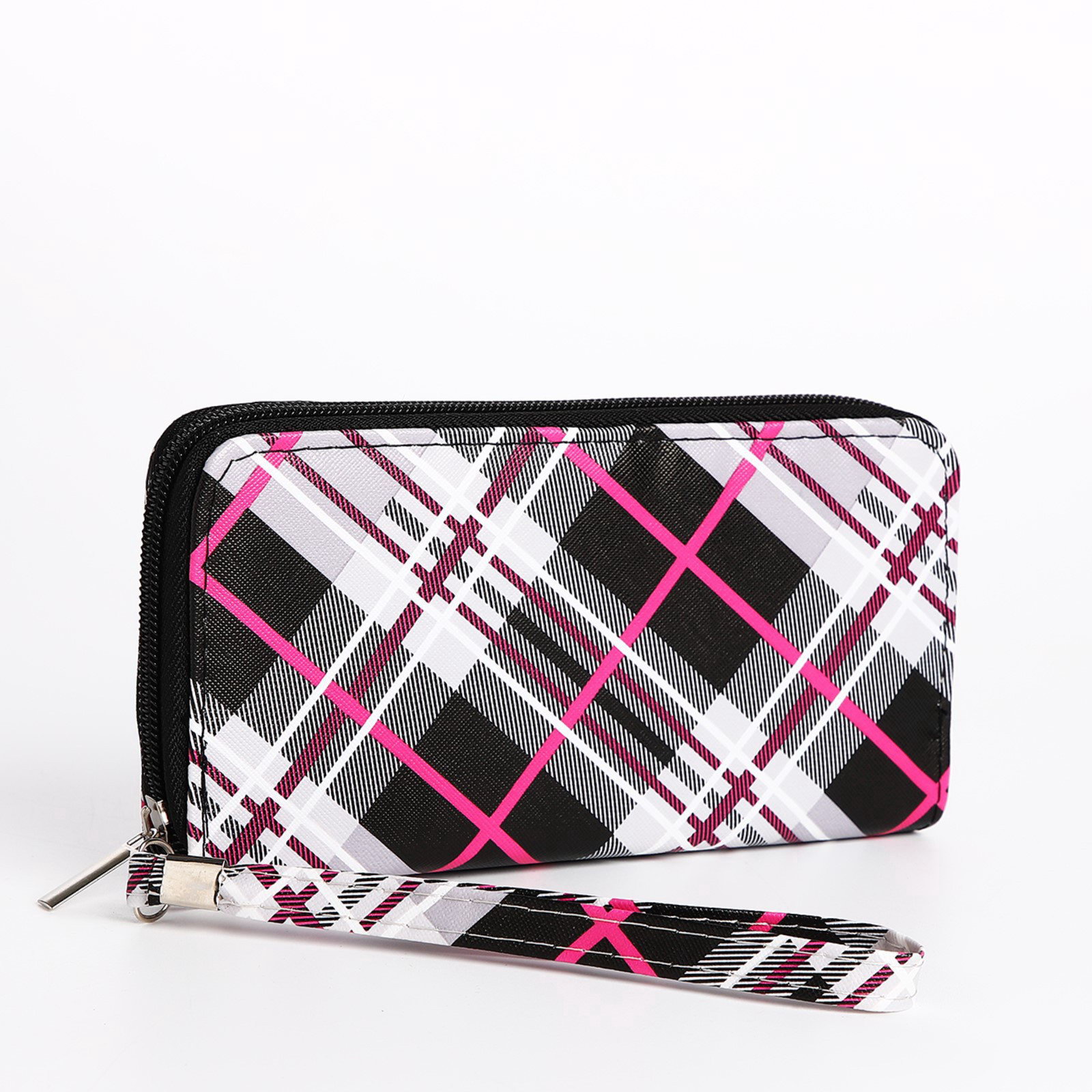 Кошелёк женский на молнии с ремешком, 19.5x2.5x10 см, в клетку, чёрный, 2.5x19.5x10 см., Китай