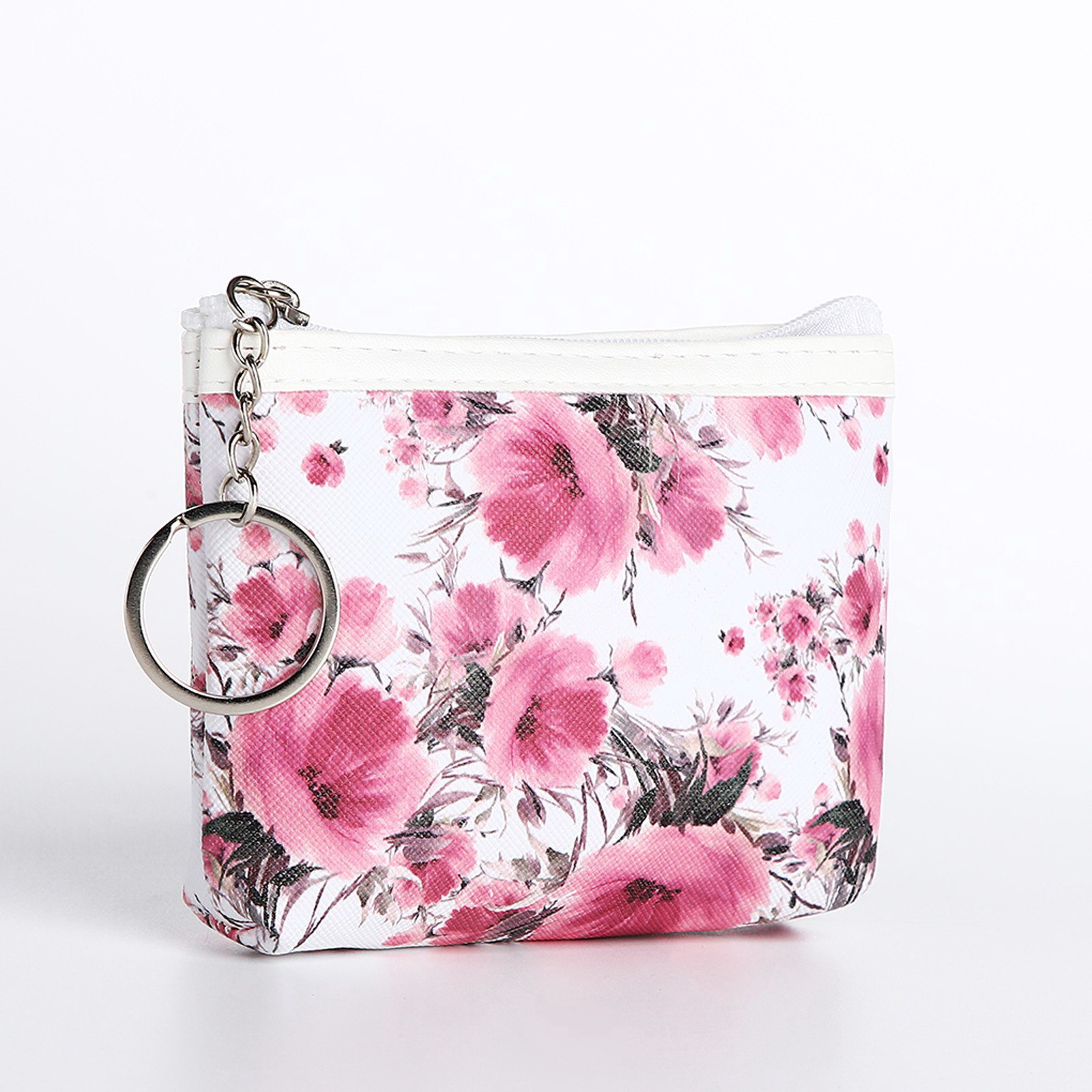 Кошелёк-монетница на молнии 10x3.5x9 см, с цветочным принтом, белый/розовый, 3.5x10x9 см., Китай