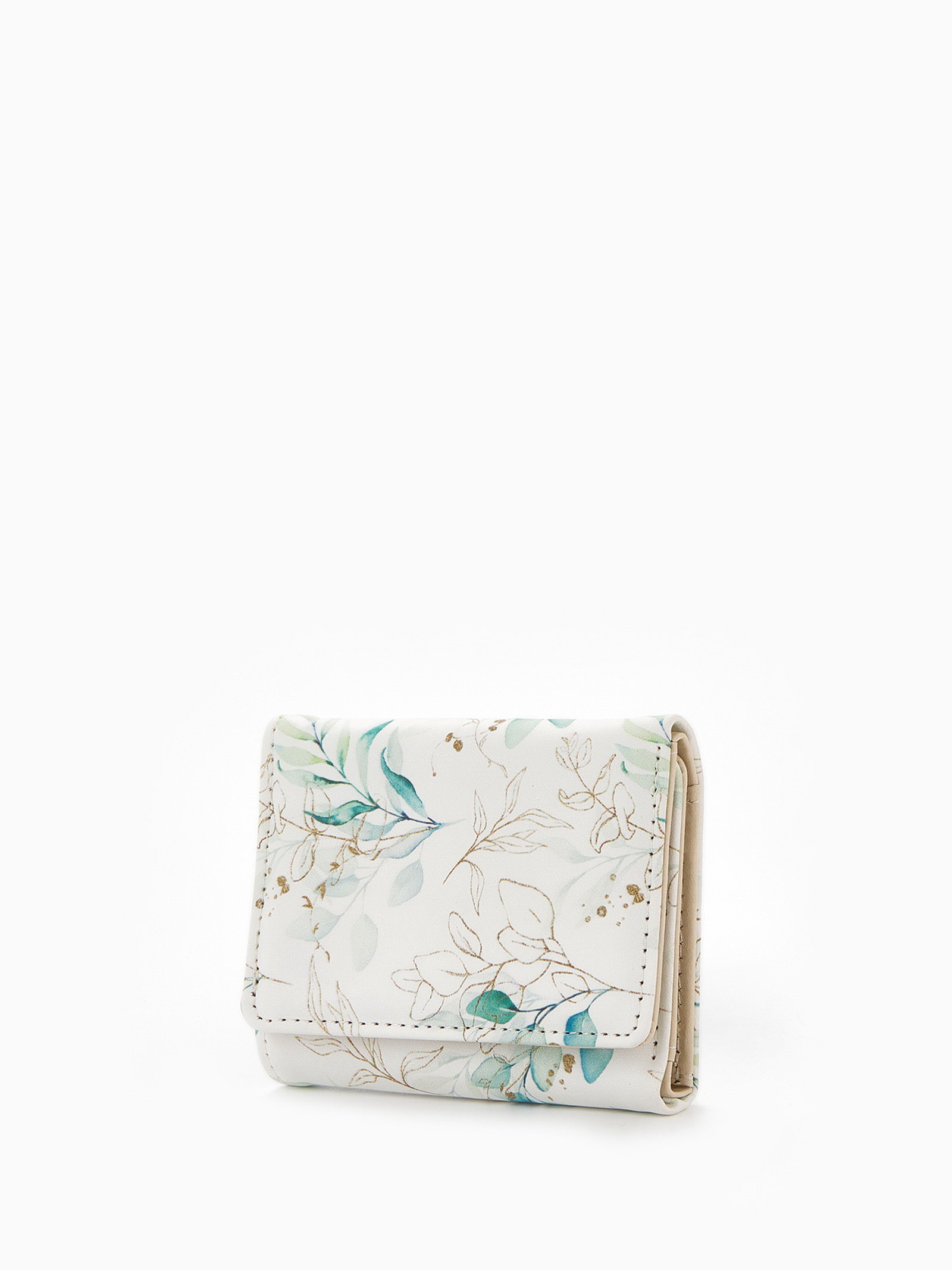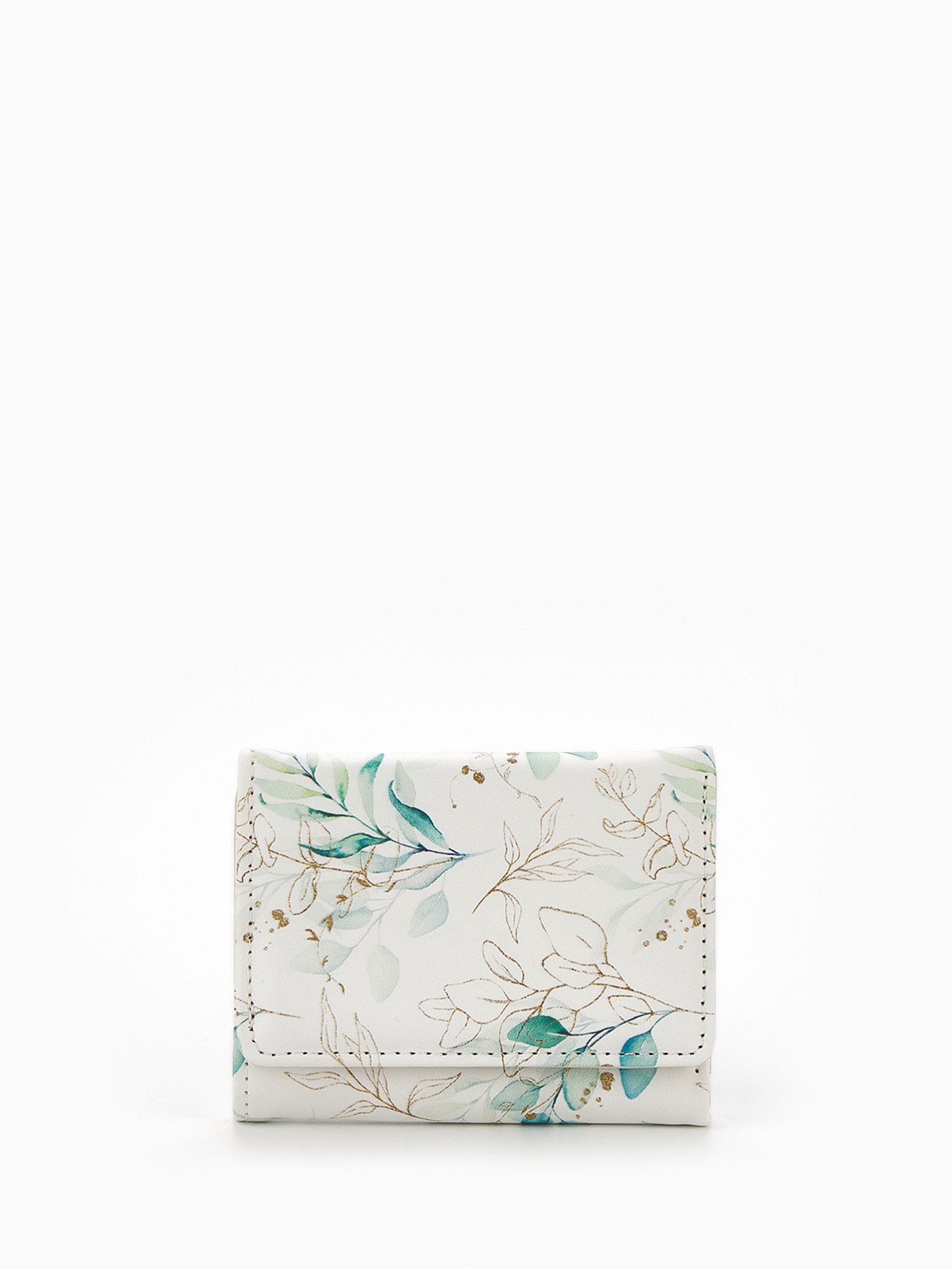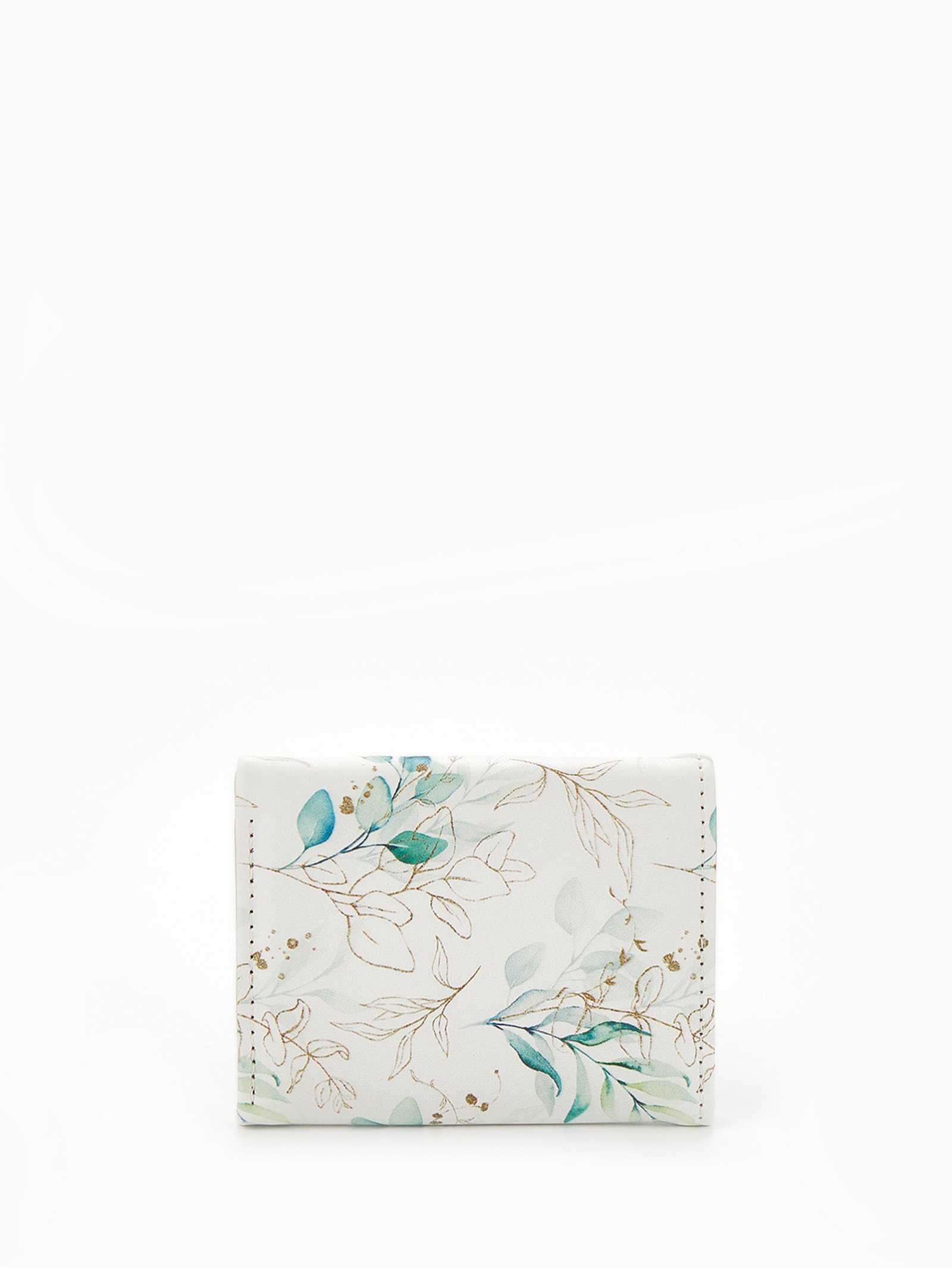 Кошелёк женский на кнопке, 10.5x2.5x8.5 см, с растительным принтом, белый/зелёный, 2.5x10.5x8.5 см., Китай