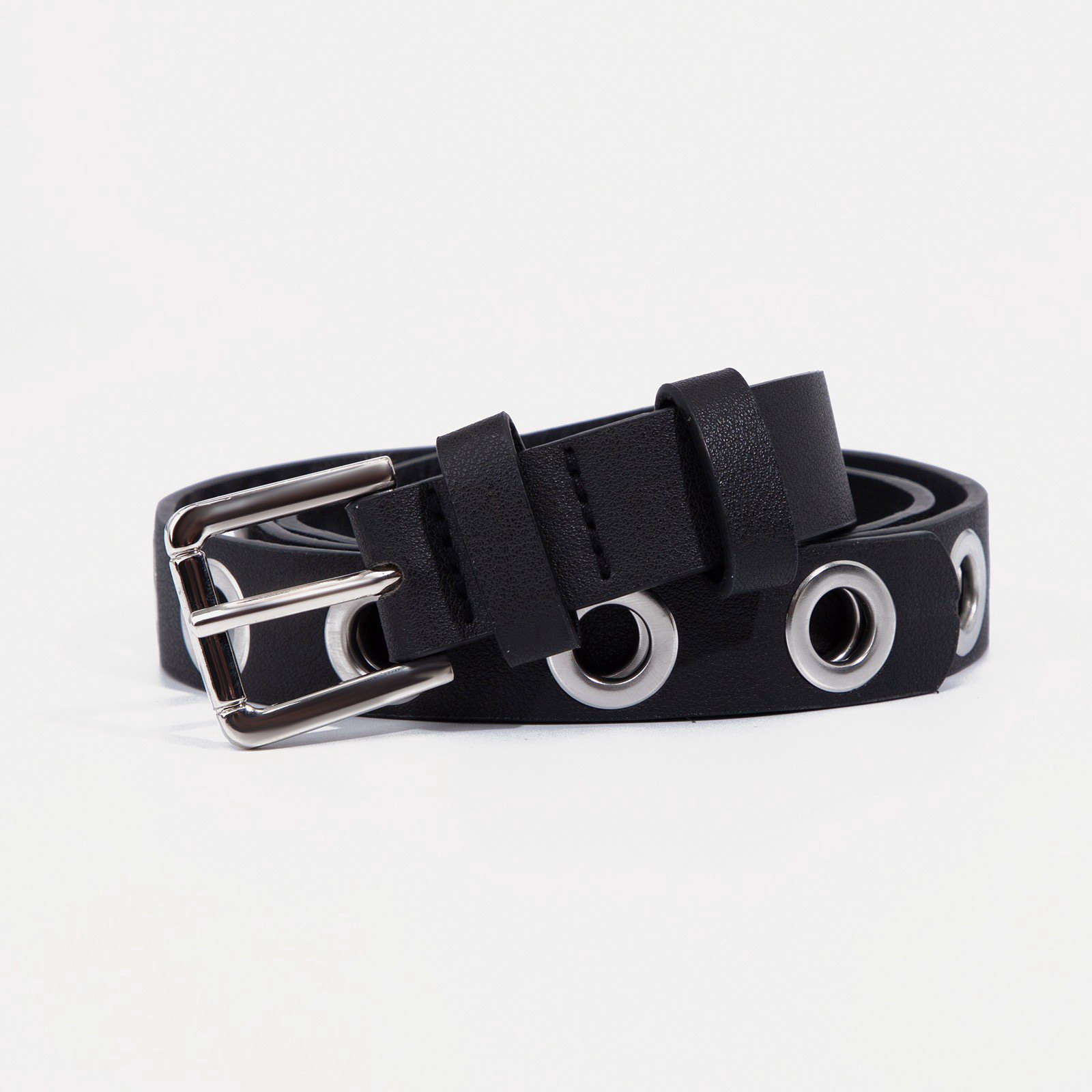 Ремень женский с люверсами, 106x2.4 см, классическая пряжка металл, серебристая, чёрный, 2.4x106 см., Китай