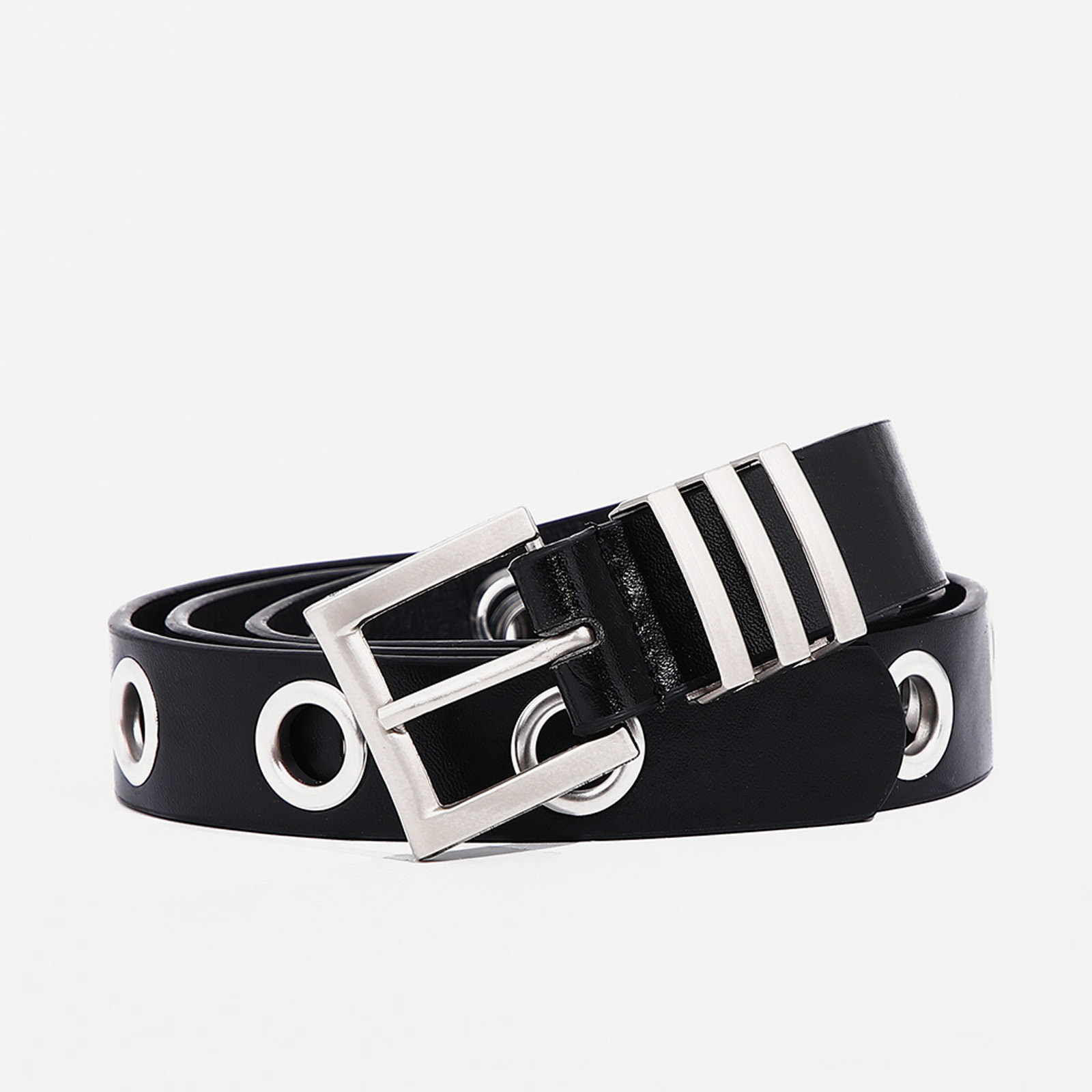 Ремень женский с люверсами, 100x2 см, пряжка металл, серебристая, чёрный, 2x100x0.2 см., Китай