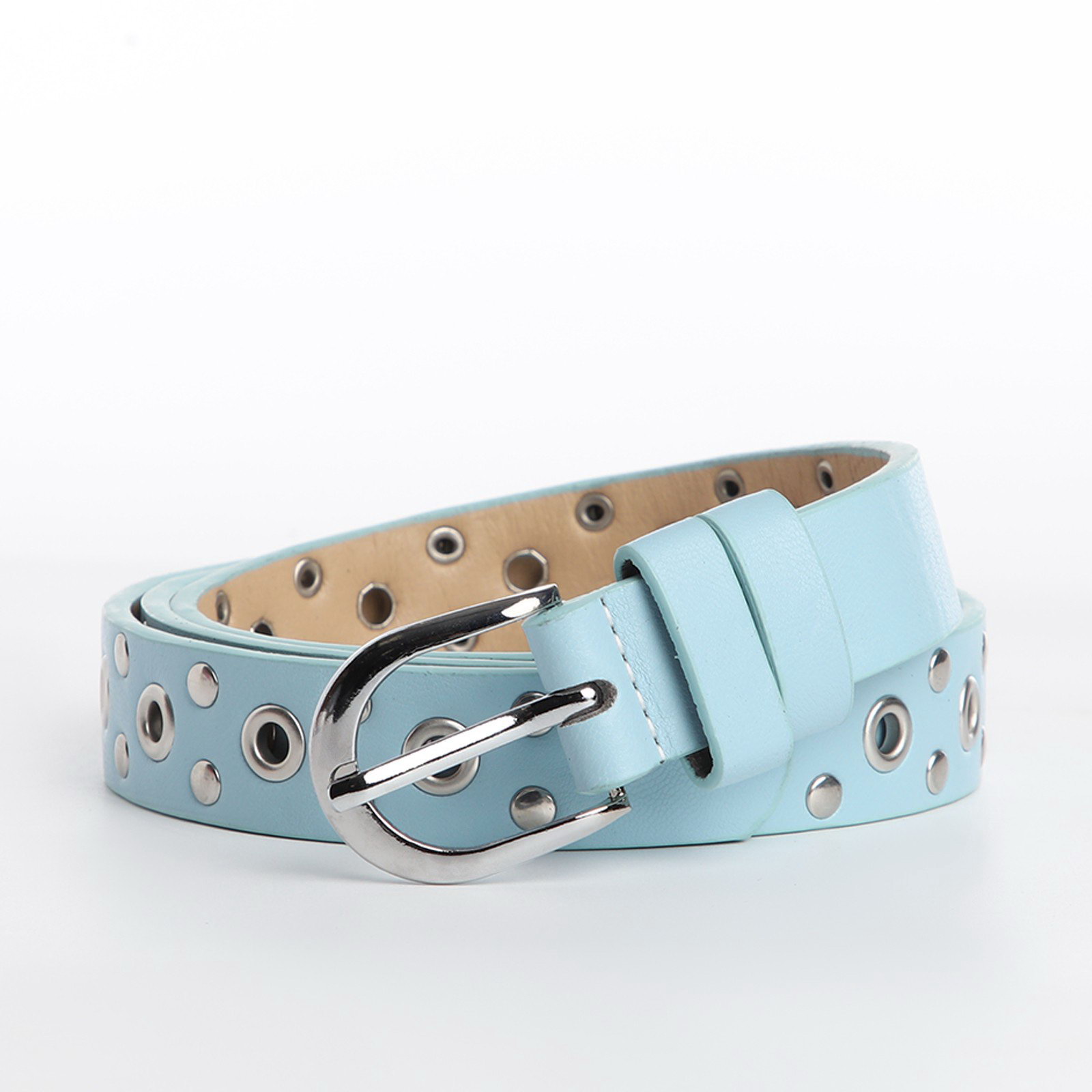 Ремень женский с люверсами, 105x2.3 см, пряжка металл, серебристая, голубой, 2.3x105x0.2 см., Китай
