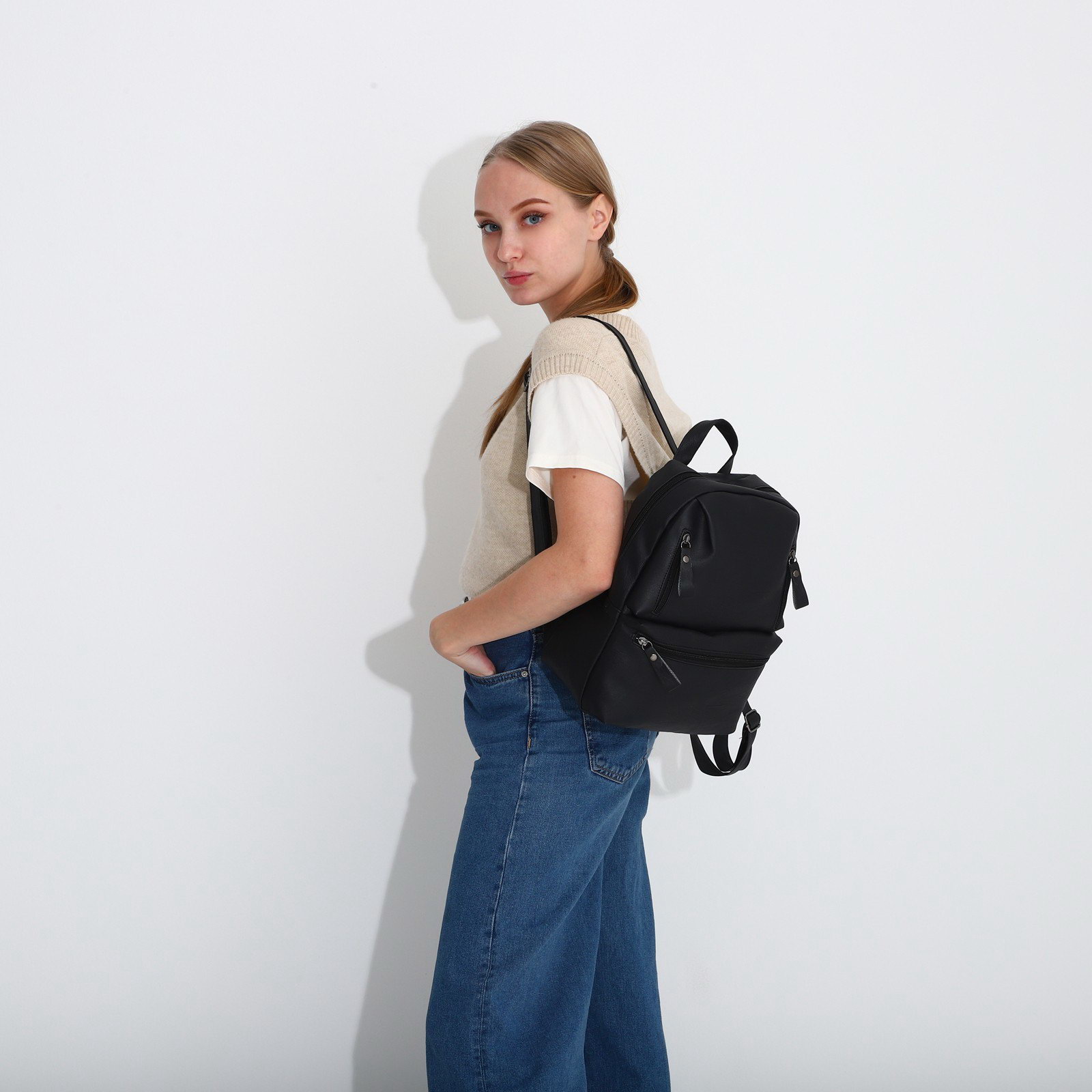 Особенности ранцев: Мягкая спинка, Система роста Размер упаковки: 2 x 32 x 30 см. tnved: 4202921200 Количество лямок: 2 Рисунок: Нет Набор: Нет Тематика: Однотонная Для кого: Для женщины Размер: До 15 литров (маленький) см Стиль: Активный образ жизни Вид: Рюкзак Цвет: Чёрный Вид застёжки: Молния Этот черный кожаный рюкзак создан для динамичной жизни в городе. Он легко вмещает все необходимое для дня вне дома, оставляя руки свободными, а спину комфортной благодаря эргономичному дизайну. Ключевые преимущества