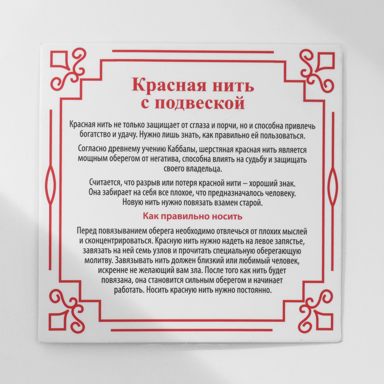 Вид: Браслет, Браслет с подвеской, Оберег Тематика праздника: 14 Февраля, 8 Марта, День рождения, Универсальная тематика Размер упаковки: 7 x 0.5 x 7 см. Для кого: Унисекс Составляющие набора: Браслет Бижутерия с открыткой: Да tnved: 7117900000 Тематика: Знаки, символы, обереги Цвет: Красный Цвет фурнитуры: Серебряный Вставка/Подвеска: Металл Длина, см: 23 Материал основы: Текстиль С подвеской: Да Назначение: На удачу Набор: Нет " Листок со словами, который прилагается к нити, необходимо прочесть при надевании и завязывании браслета. Люди верят, что браслету с красной силой под силу защитить человека от негативной энергии и положительно влиять на судьбу хозяина браслета. Считается также, что такой браслет передает любовь прародительницы и помогает в осуществлении желаний. Моряки также верят, что красная нить способна привлечь попутный ветер и удачу. " | ||