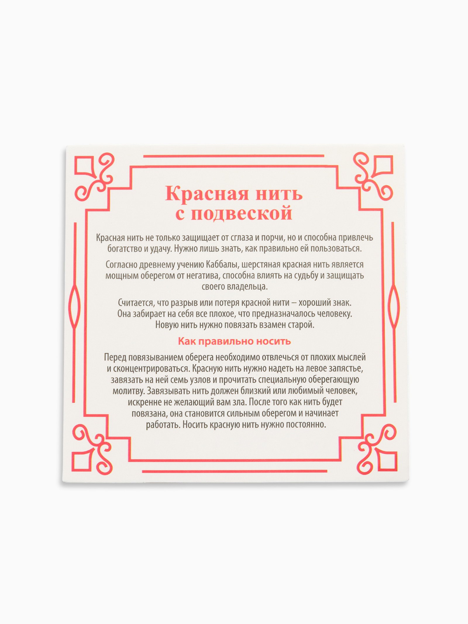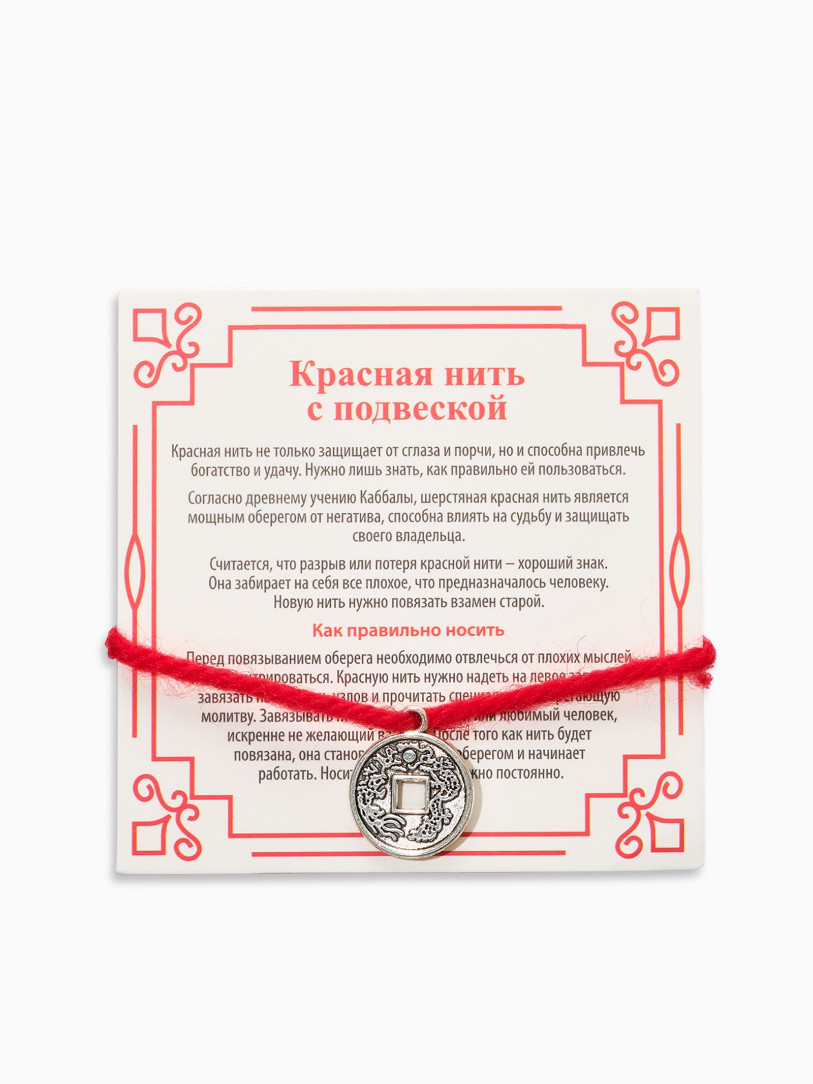 Вид: Браслет, Браслет с подвеской, Оберег Размер упаковки: 7 x 0.4 x 7 см. Бижутерия с открыткой: Да Тематика праздника: Универсальная тематика Материал основания: Текстиль Для кого: Унисекс tnved: 7117190000 tnved: 7117190000 Вид застёжки: Без застёжки Тематика: Знаки, символы, обереги Температурное ограничение: Нет Вставка/Подвеска: Металл Цвет: Красный Цвет фурнитуры: Серебряный Материал основы: Текстиль Длина, см: 35 Назначение: На изобилие С подвеской: Да Набор: Нет Этот браслет с красной нитью не просто стильный аксессуар, а мощный оберег, символизирующий приток изобилия и благополучия. Текстильная основа длиной 35 см позволяет удобно носить браслет на запястье любого размера, а отсутствие застёжки делает его максимально комфортным и практичным в повседневной жизни. Изящная металлическая подвеска в виде монетки с серебристым оттенком служит не только декоративным элементом, но и мощным символом богатства и процветания. Такой аксессуар станет универсальным подарком и дополнением к любому образу, подчёркивая вашу уверенность и стремление к успеху.