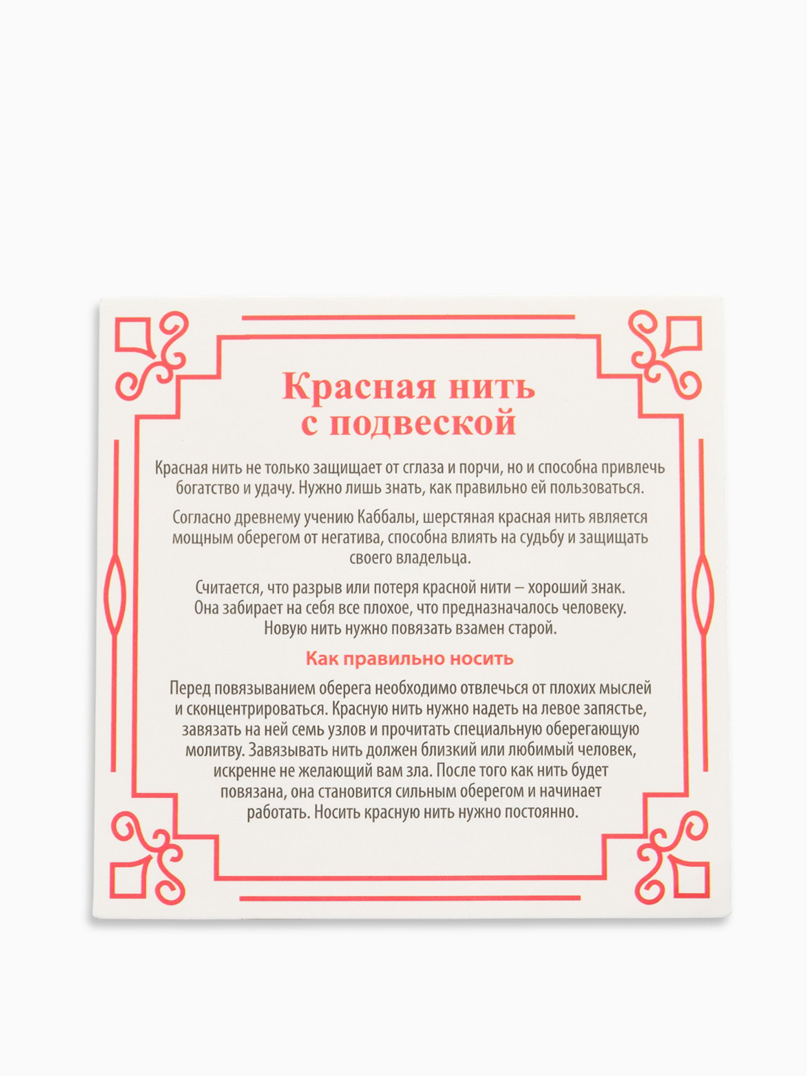 Тематика праздника: 8 Марта, День рождения, Новый год, Универсальная тематика Вид: Браслет, Браслет с подвеской, Оберег Тематика: Знаки, символы, обереги, Цветы и растения Размер упаковки: 6.5 x 0.4 x 6.5 см. Материал основания: Текстиль Для кого: Унисекс Вид застёжки: Складная застёжка tnved: 7117190000 tnved: 7117190000 Температурное ограничение: Нет Материал основы: Текстиль Длина, см: 30 Цвет фурнитуры: Серебряный Цвет: Красный Вставка/Подвеска: Металл С подвеской: Да Назначение: На удачу Набор: Нет " Листок со словами, который прилагается к нити, необходимо прочесть при надевании и завязывании браслета. Люди верят, что браслету с красной силой под силу защитить человека от негативной энергии и положительно влиять на судьбу хозяина браслета. Считается также, что такой браслет передает любовь прародительницы и помогает в осуществлении желаний. Моряки также верят, что красная нить способна привлечь попутный ветер и удачу. " | ||