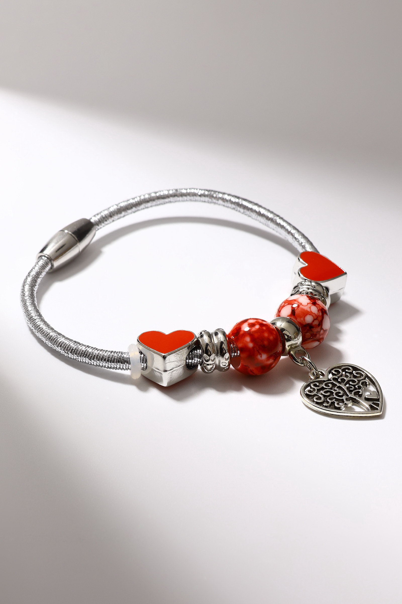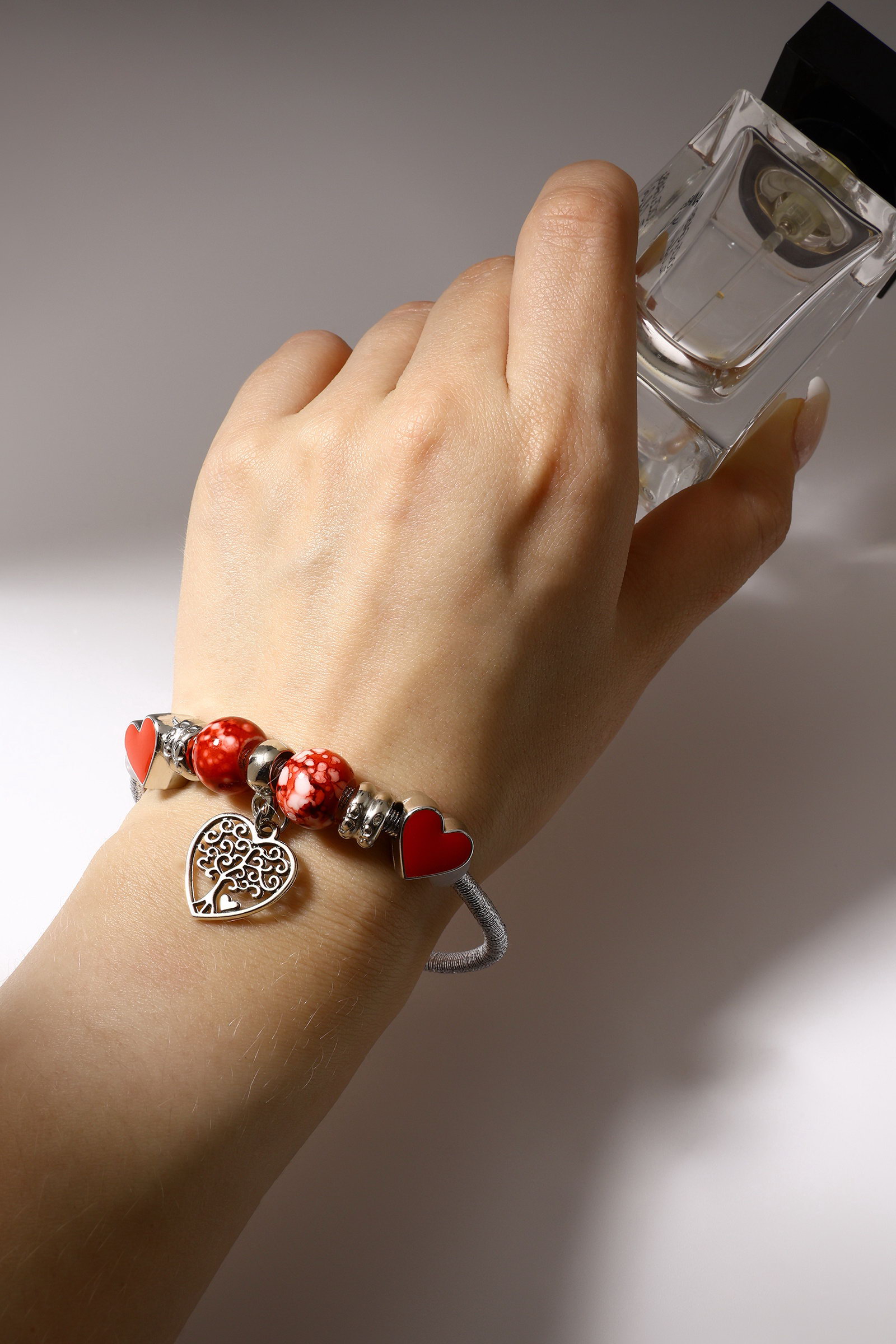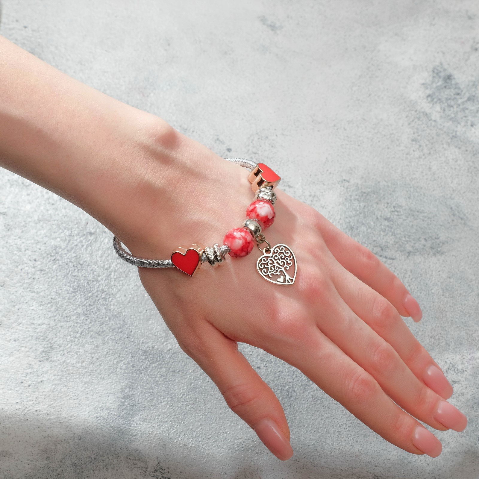 Браслет с шармами "Марджери" на нити, дерево в сердце, L=18 см, красный в серебре, 2.8x18x1.3 см., QF, Китай