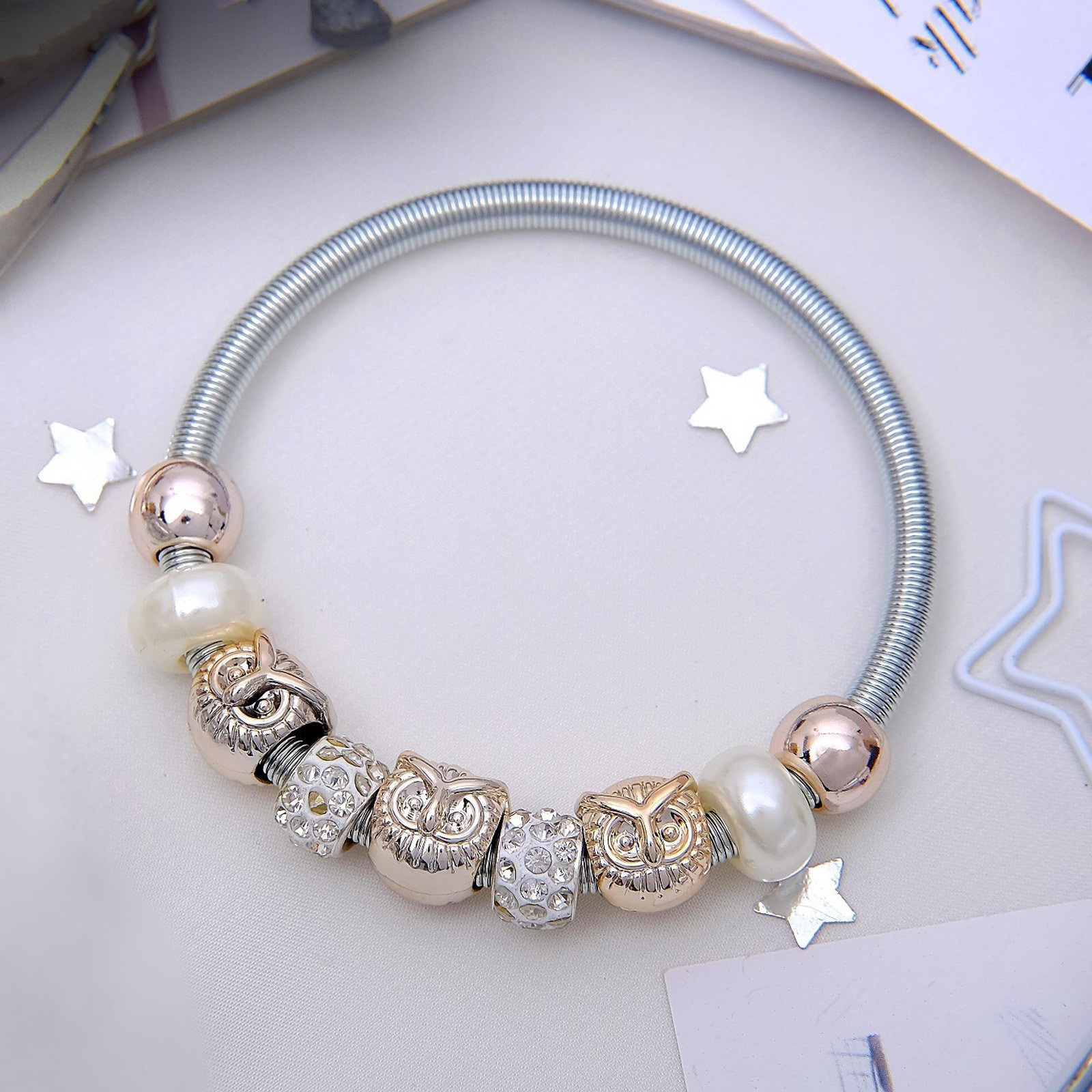 Браслет жемчуг "Марджери" сова, цвет белый в серебре, d=6.5 см, 1.5x6.5x1.5 см., QF, Китай