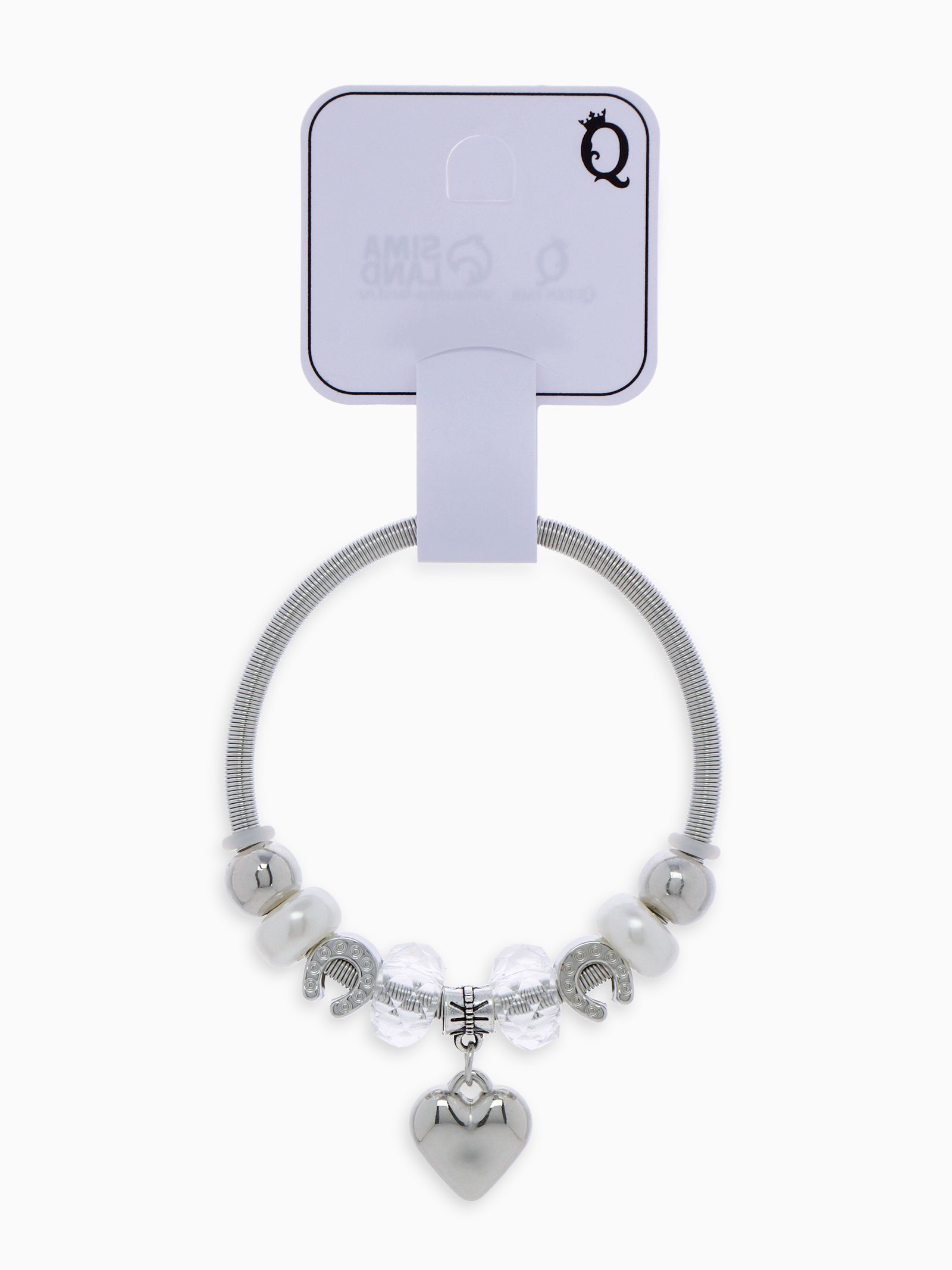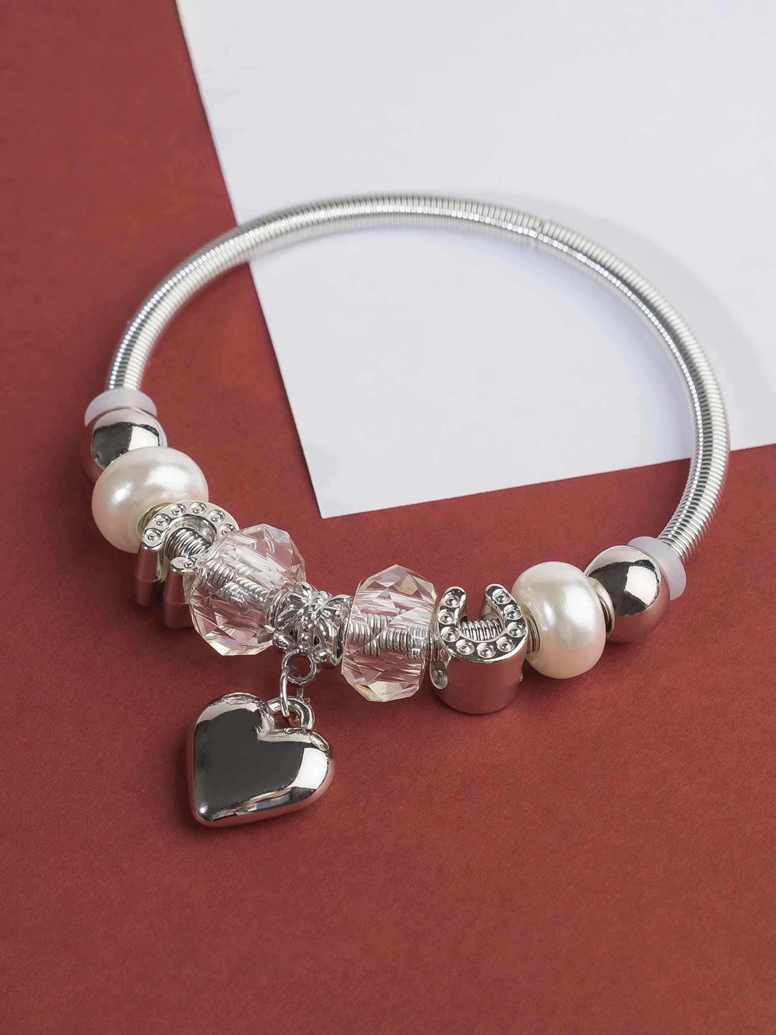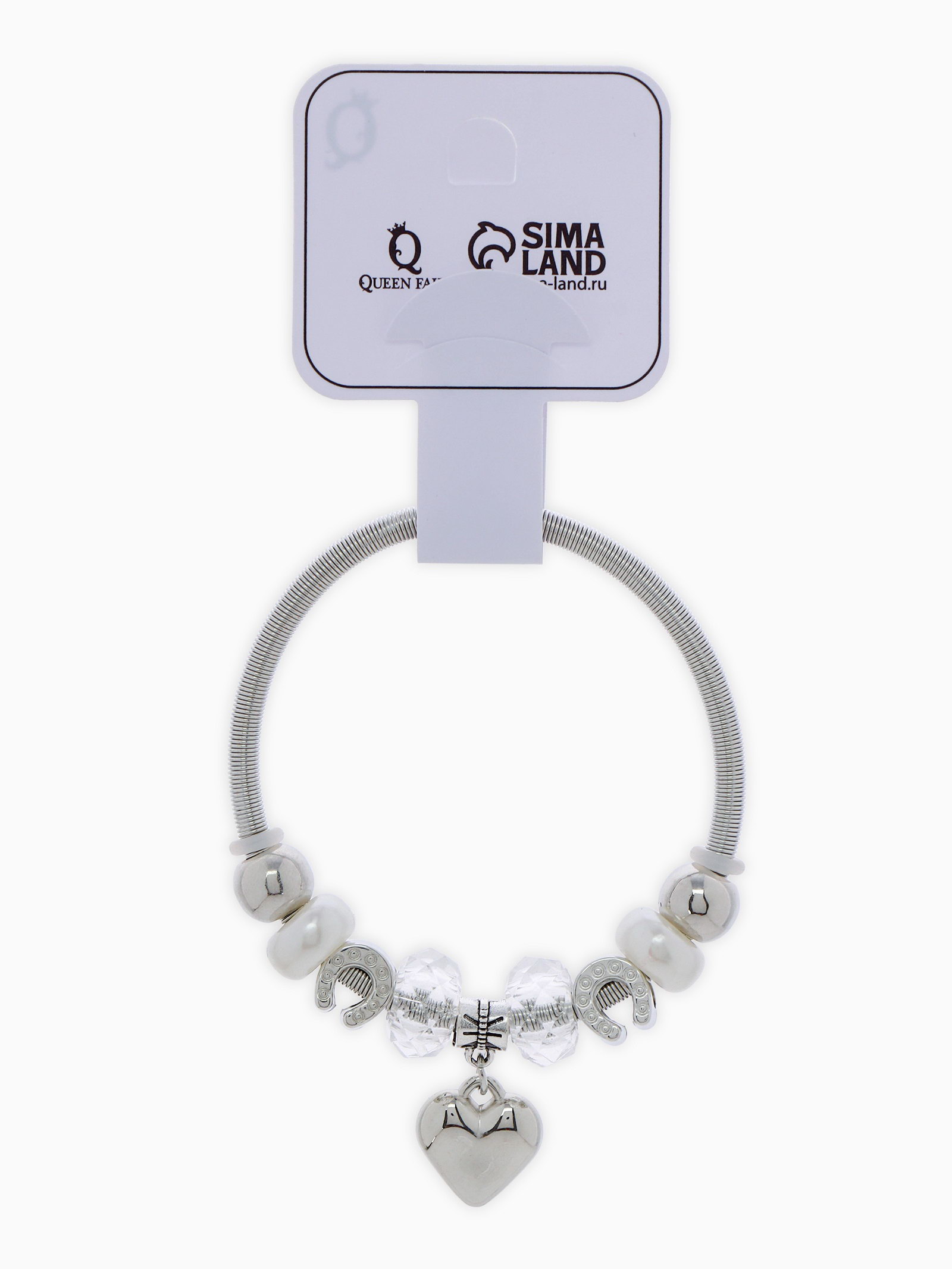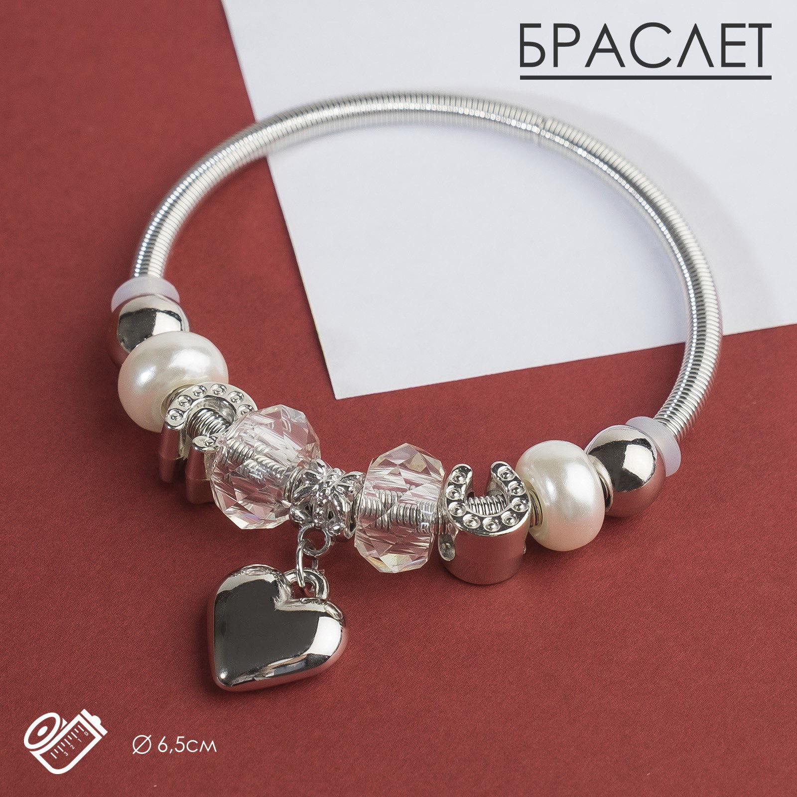 Браслет с шармами "Марджери" сердце, жемчуг, белый в серебре, d=6.5 см, 1.5x6.5x1 см., QF, Китай