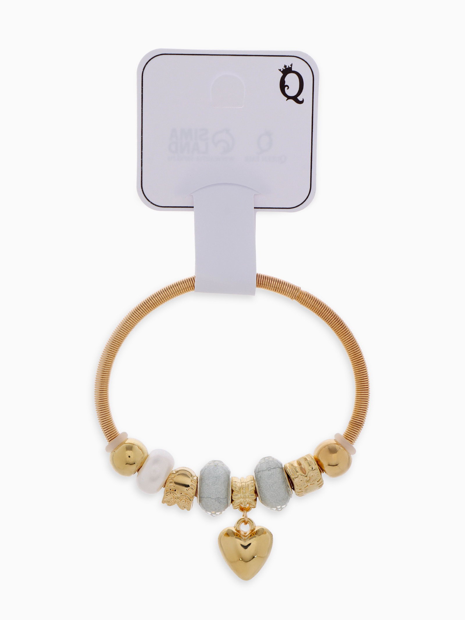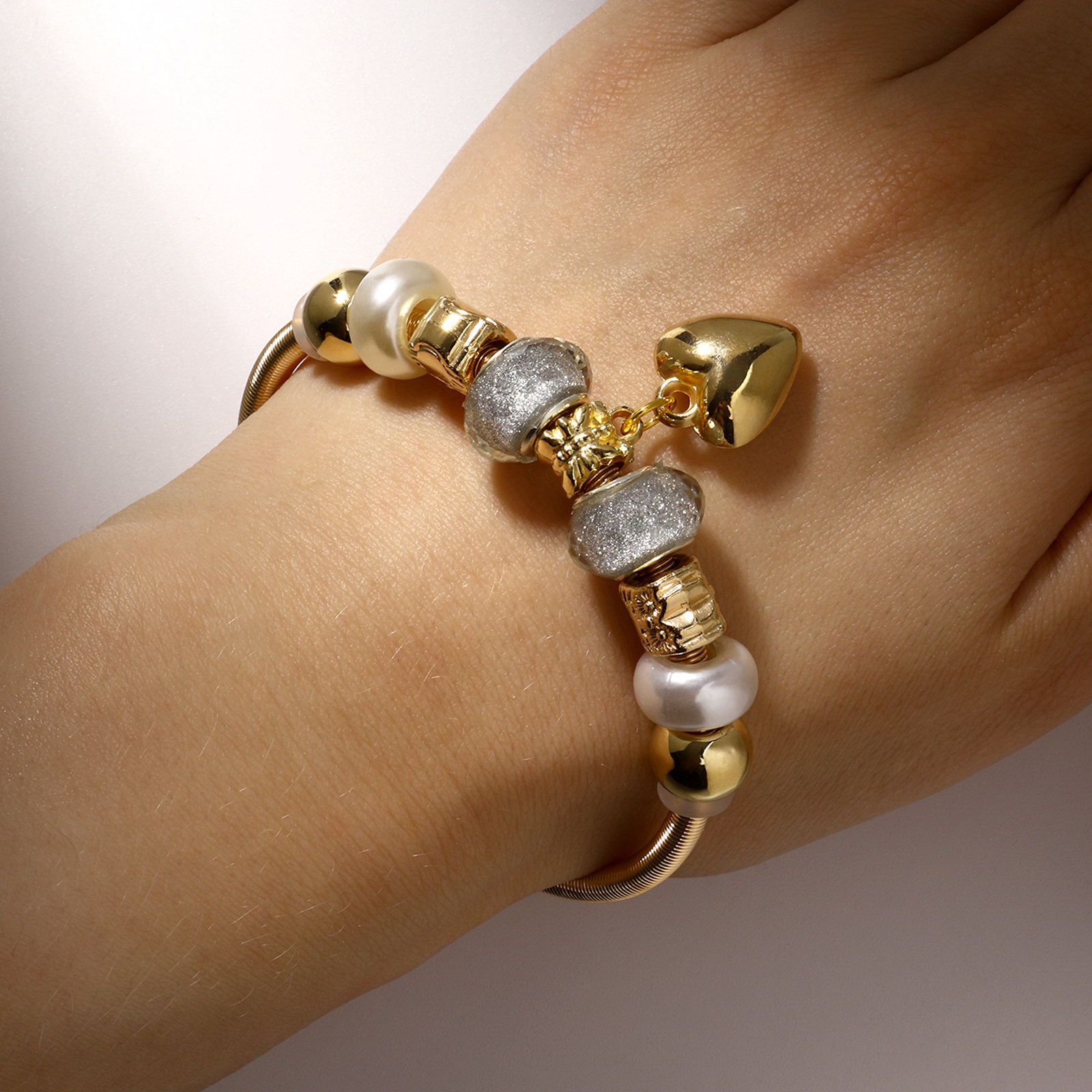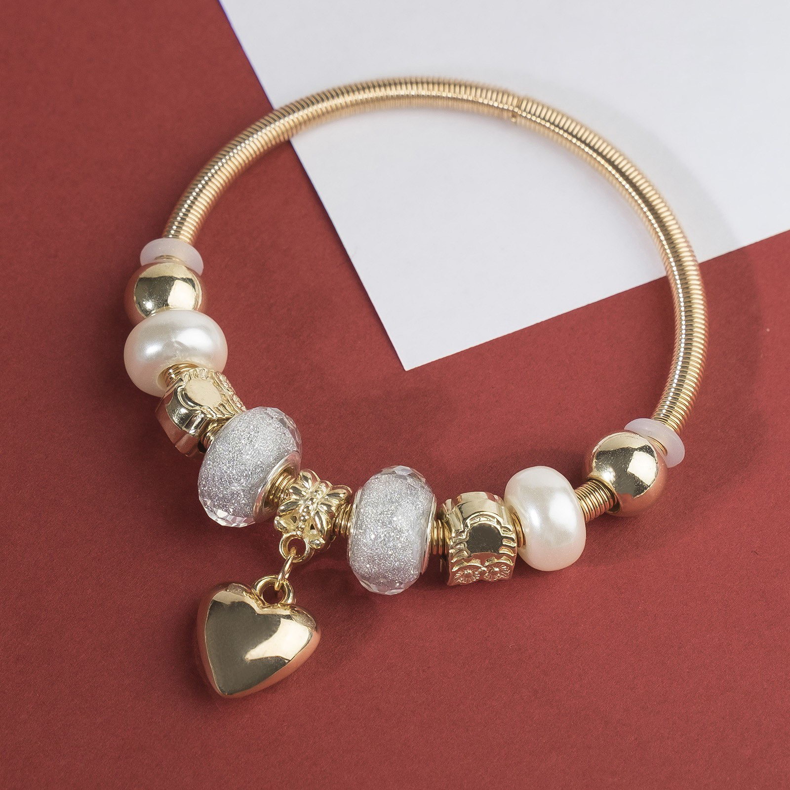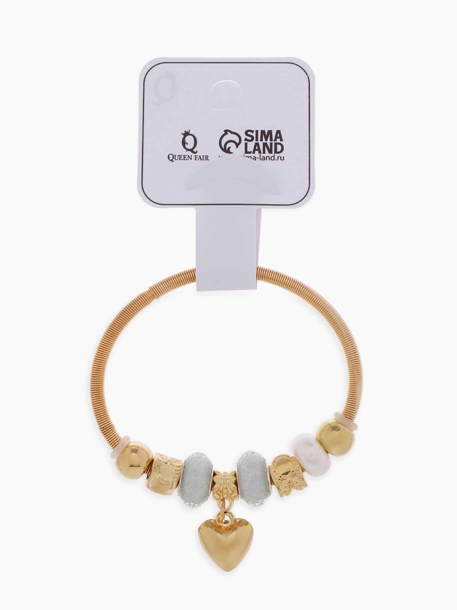 Браслет с шармами "Марджери" сердце, жемчуг, серебристо-белый в розовом золоте, d=6.5 см, 1.5x6.5x1 см., QF, Китай