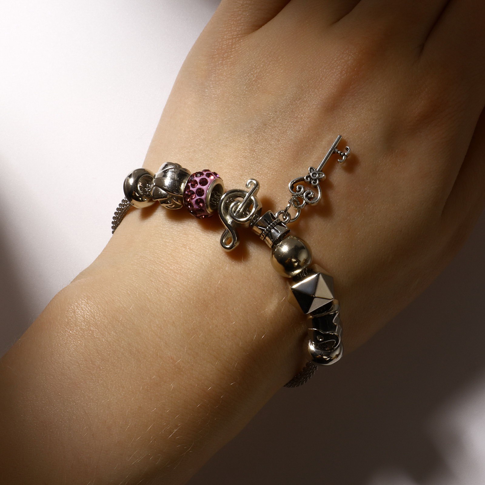 Вид: Браслет, Браслет с шармами, Браслеты Тематика: Музыка, Хобби, профессии, увлечения Размер упаковки: 6 x 0.8 x 7 см. Цвет фурнитуры: Серебряный Длина, см: 18 Температурное ограничение: Нет Для кого: Для женщины Материал основания: Металл В наборе, шт.: 1 Количество нитей: 1 Цвет: Серебристый Тематика праздника: Универсальная тематика Бижутерия с открыткой: Нет Цвет вставки: Розовый Вид застёжки: Карабин tnved: 7117190000 Вставка/Подвеска: Стразы Набор: Нет Материал основы: Металл Этот утончённый браслет с изящным ключиком в фиолетовом цвете станет стильным дополнением образа современной женщины, стремящейся подчеркнуть свою индивидуальность. Металлическая основа серебристого оттенка придаёт украшению благородство и прочность, а длина 18 см обеспечивает комфортную посадку на запястье. Декоративные вставки из страз и нежный розовый оттенок создают эффект лёгкого сияния, делая браслет заметным, но при этом изящным аксессуаром. Карабин надёжно фиксирует украшение, гарантируя удобство и безопасность в повседневном использовании.