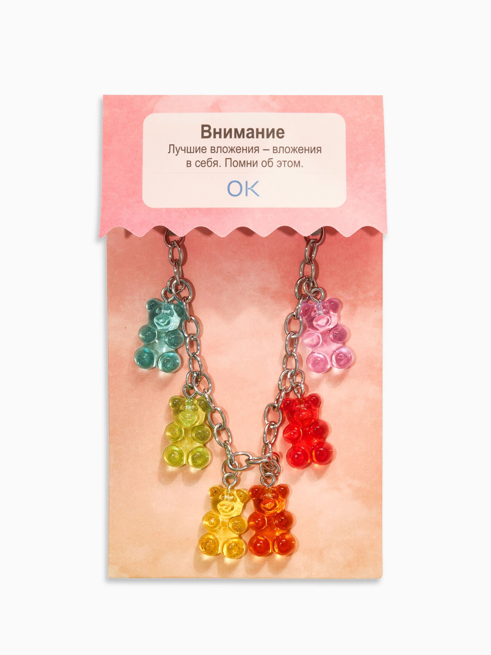 Вид: Браслет, Браслеты, Цепочка Для кого: Для девочки, Для женщины Тематика праздника: 8 Марта, День рождения, Универсальная тематика Тематика: Еда, Яркая Размер упаковки: 7 x 1 x 12.5 см. Материал основания: Металл Температурное ограничение: Нет В наборе, шт.: 1 Бижутерия с открыткой: Нет Составляющие набора: Браслет Вид застёжки: Карабин tnved: 7117190000 Цвет: Разноцветный Материал основы: Металл Цвет фурнитуры: Серебряный Длина, см: 17 Набор: Нет Вставка/Подвеска: Акрил Металлический браслет длиной 17 см, украшенный яркими акриловыми элементами в виде милых мармеладных мишек, станет выразительным дополнением к образу девочки или женщины, ценящей игривость и оригинальность. Серебристый оттенок фурнитуры гармонично сочетается с насыщенной цветовой палитрой оранжевым, жёлтым, зелёным, голубым, фиолетовым и красным, создавая настроение радости и легкости. Этот аксессуар не только привлекает внимание своей жизнерадостной тематикой, но и отличается продуманной конструкцией с застёжкой-карабином, обеспечивающей надежную фиксацию и удобство использования. Благодаря универсальному дизайну браслет отлично подходит как для повседневного ношения, так и для праздничных событий дня рождения, 8 Марта или просто для поднятия настроения.