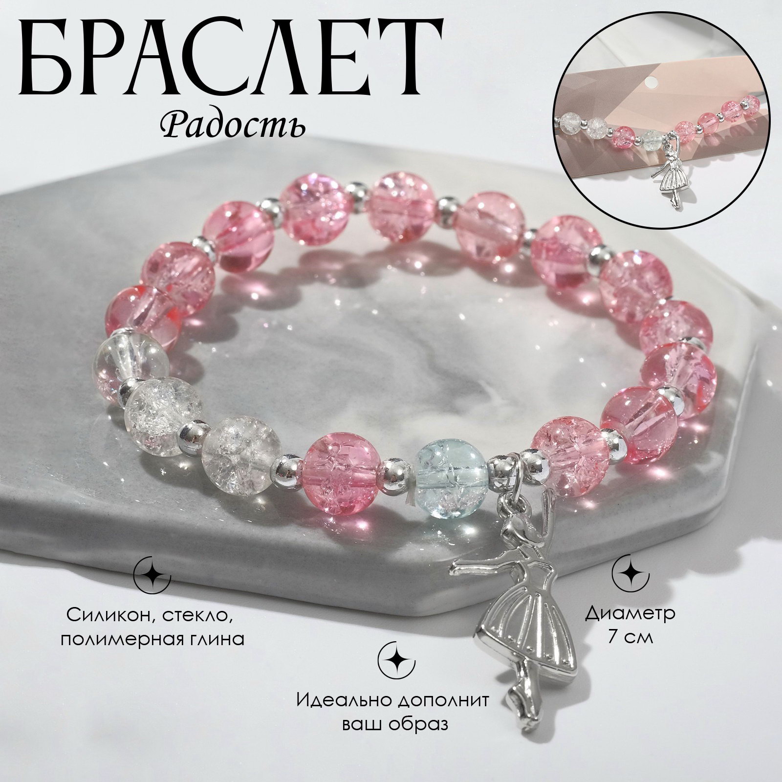 Вид: Браслет, Браслет из бусин, Браслет с подвеской, Браслеты Для кого: Для девочки, Для женщины Тематика: Балерины, гимнастки, Люди, Яркая Цвет: Белый, Розовый Адресат: Дочке, Маме, Подруге, Сестре Вставка/Подвеска: Полимерная глина, Стекло Размер упаковки: 5 x 1 x 7 см. Материал основания: Силикон Бижутерия с открыткой: Нет Тематика праздника: Универсальная тематика В наборе, шт.: 1 С подвеской: Да Составляющие набора: Браслет Тематика подарка: Бижутерия Тематика подарка: Бижутерия tnved: 7117190000 Вид застёжки: Без застёжки Длина, см: 7 Материал основы: Силикон Цвет фурнитуры: Серебряный Набор: Нет Лёгкость и изящество воплощены в этом браслете с нежной балериной, выполненном в бело-розовой гамме. Диаметр 7 см и мягкий силиконовый материал основы обеспечивают комфортное и удобное ношение, идеально подходя как для девочек, так и для взрослых женщин, ценящих утончённость и символизм в аксессуарах. Изящная подвеска из полимерной глины и стекла придаёт украшению неповторимый шарм и уникальность, подчёркивая тематику балерин и гимнасток символ лёгкости, грации и радости движения. Отсутствие застёжки делает браслет универсальным и простым в использовании, а серебристая фурнитура гармонично дополняет общий образ.