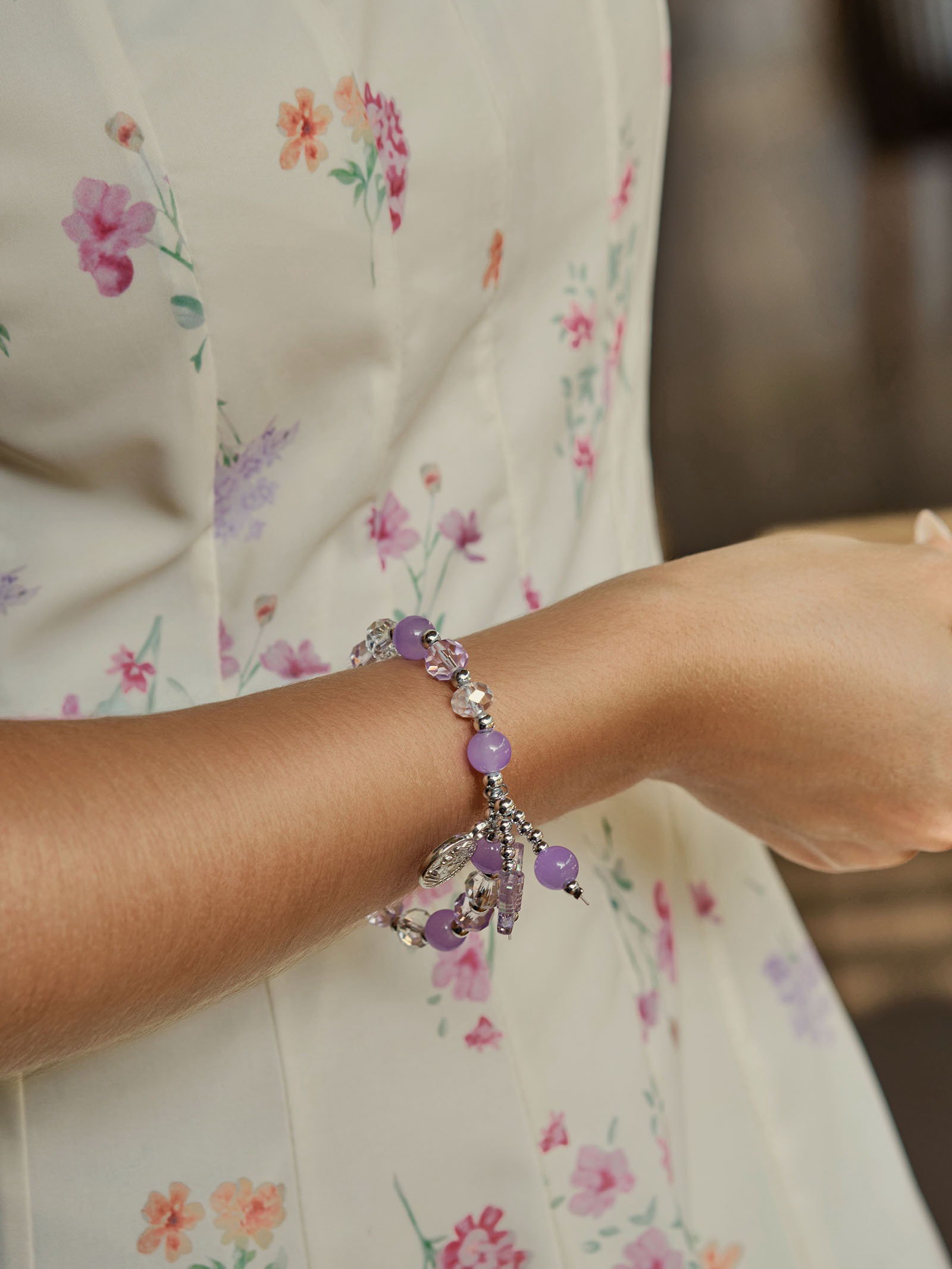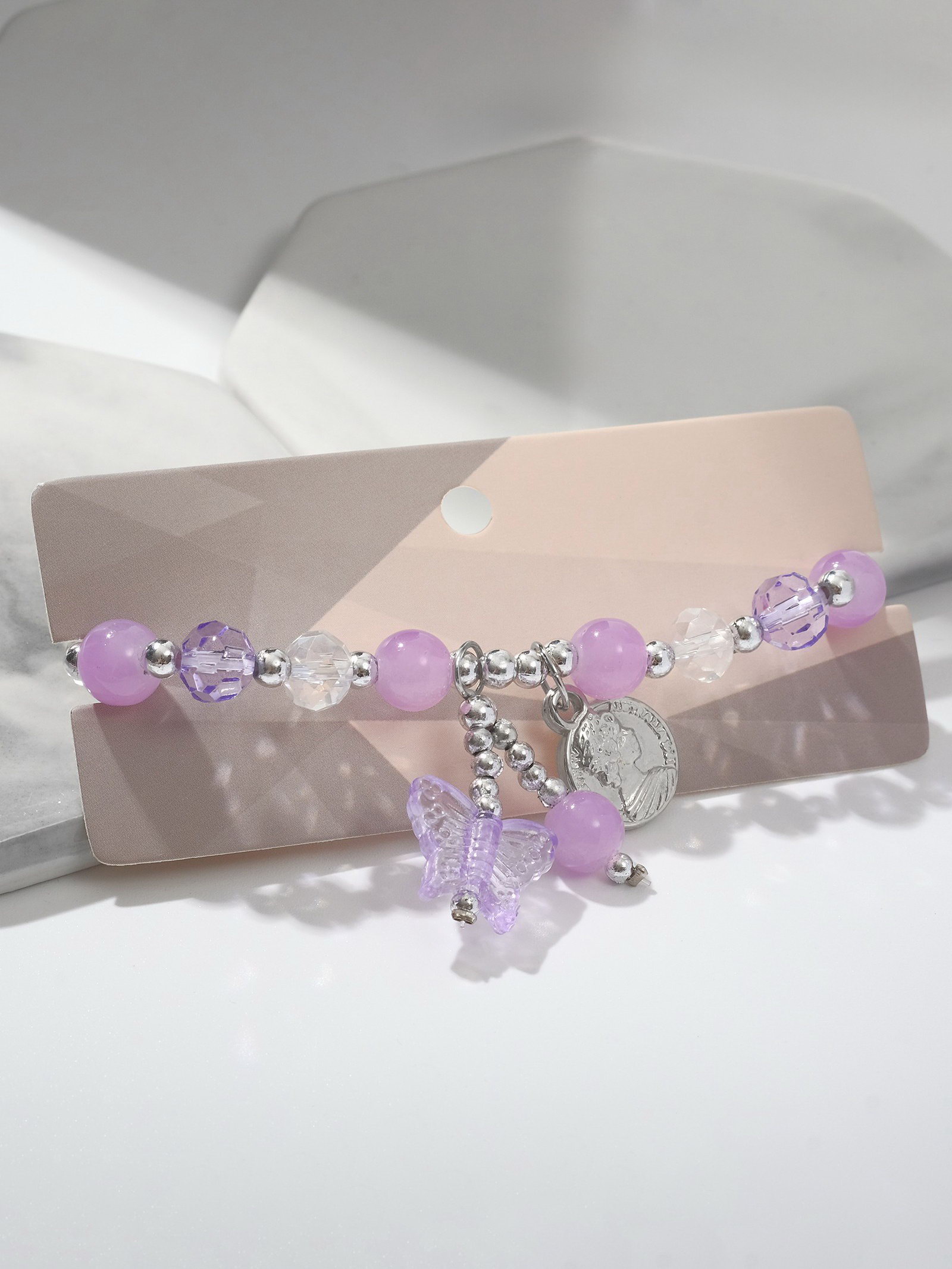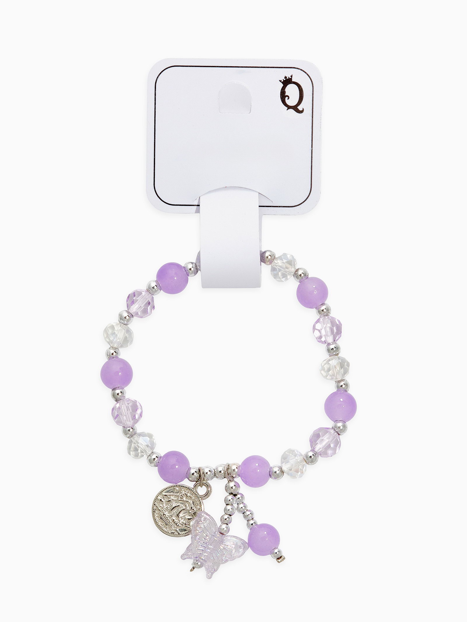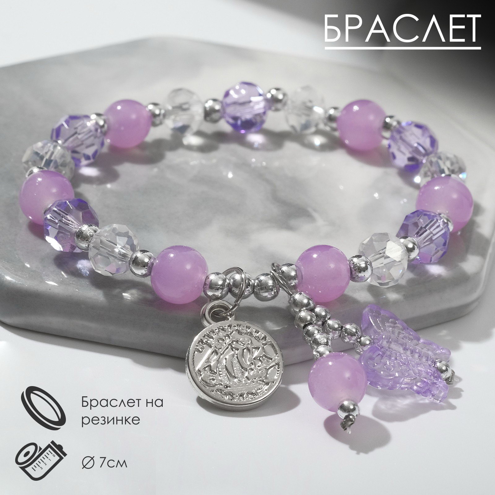 Браслет "Радость" монетка и бабочки, цвет бело-сиреневый в серебре, d=7 см, 2.5x7x0.8 см., QF, Китай