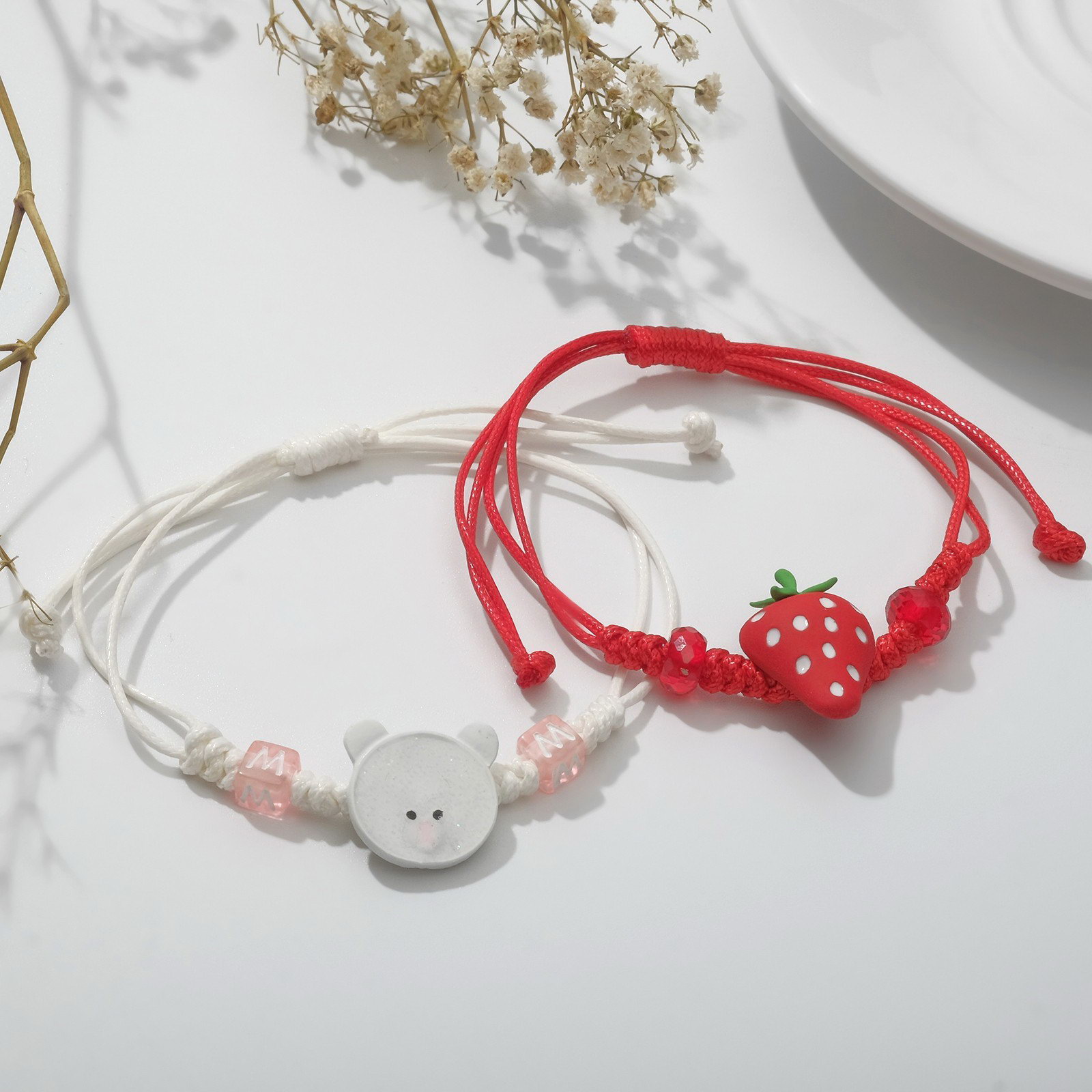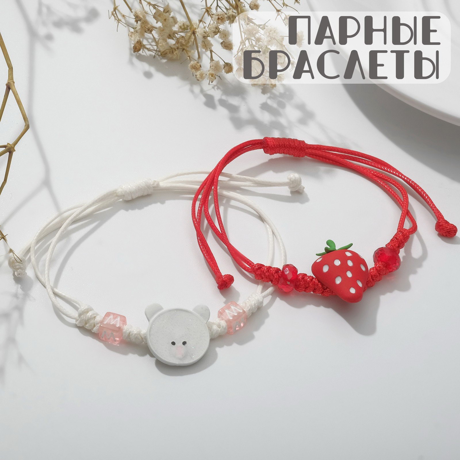 Браслеты "Неразлучники" мишка и клубника, цвет красно-белый, 8 см, 2.2x8x1 см., Tell your story, Китай