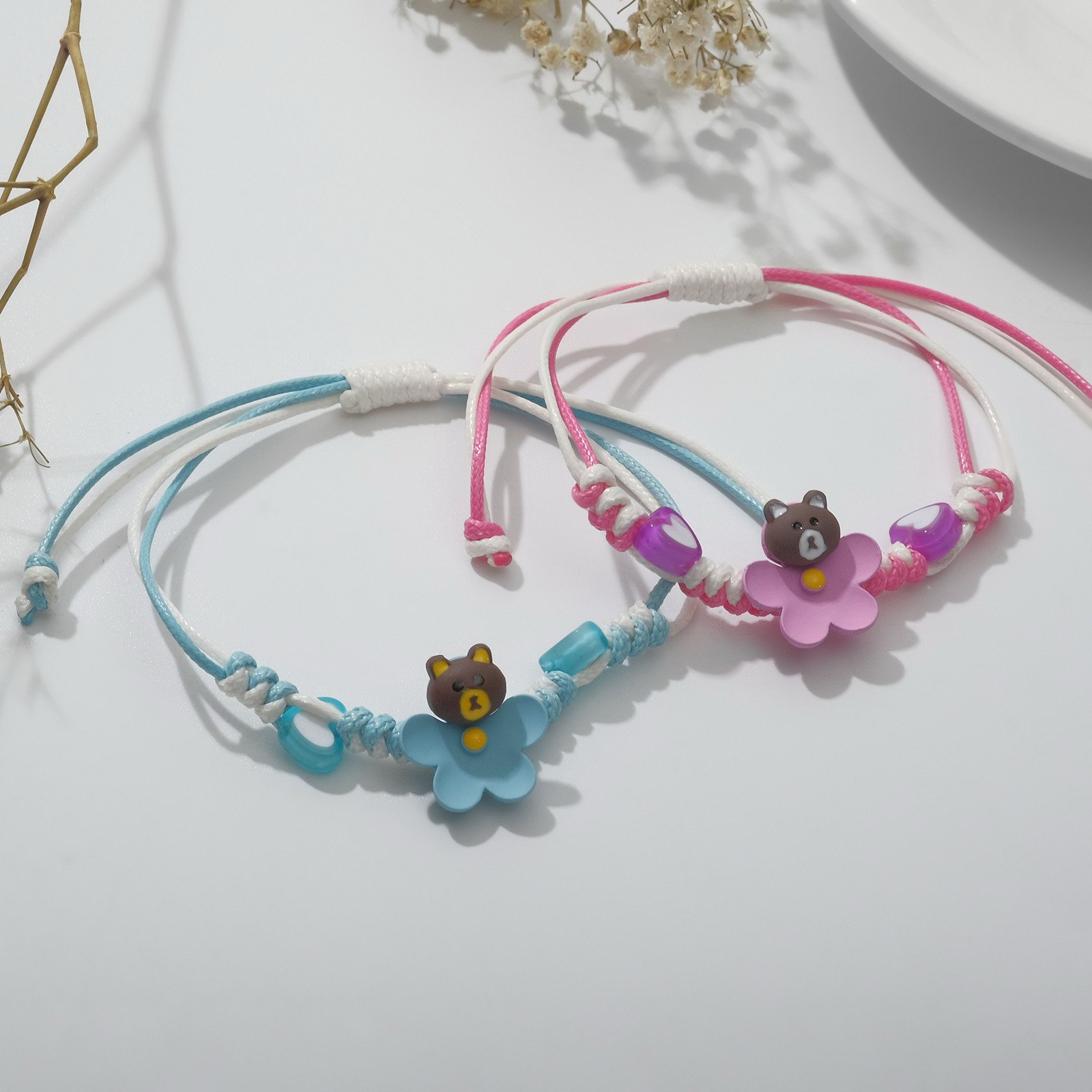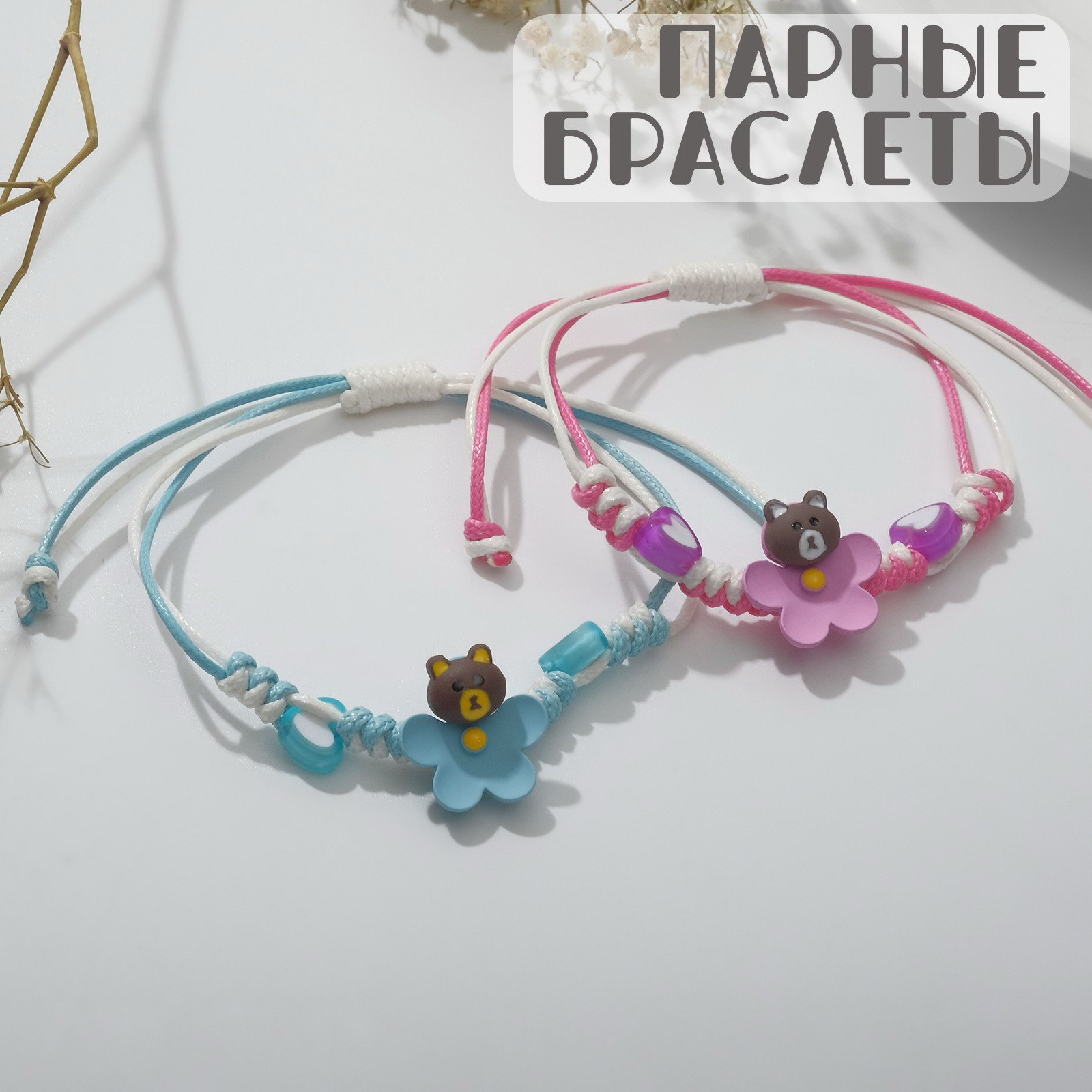 Браслеты "Неразлучники" плетёные, мишки на цветочках, цвет розово-голубой, 8см, 1.8x8x1 см., Tell your story, Китай
