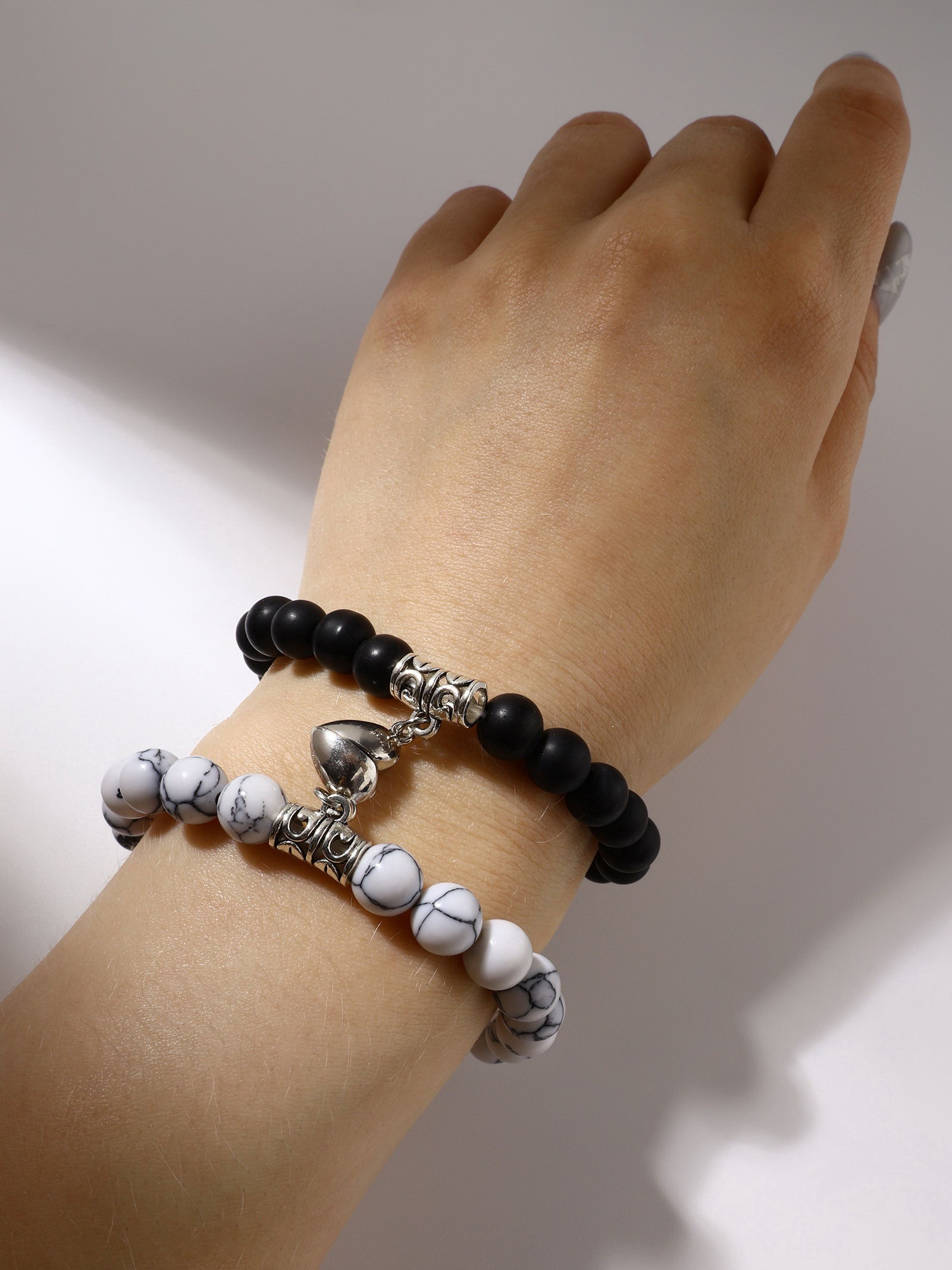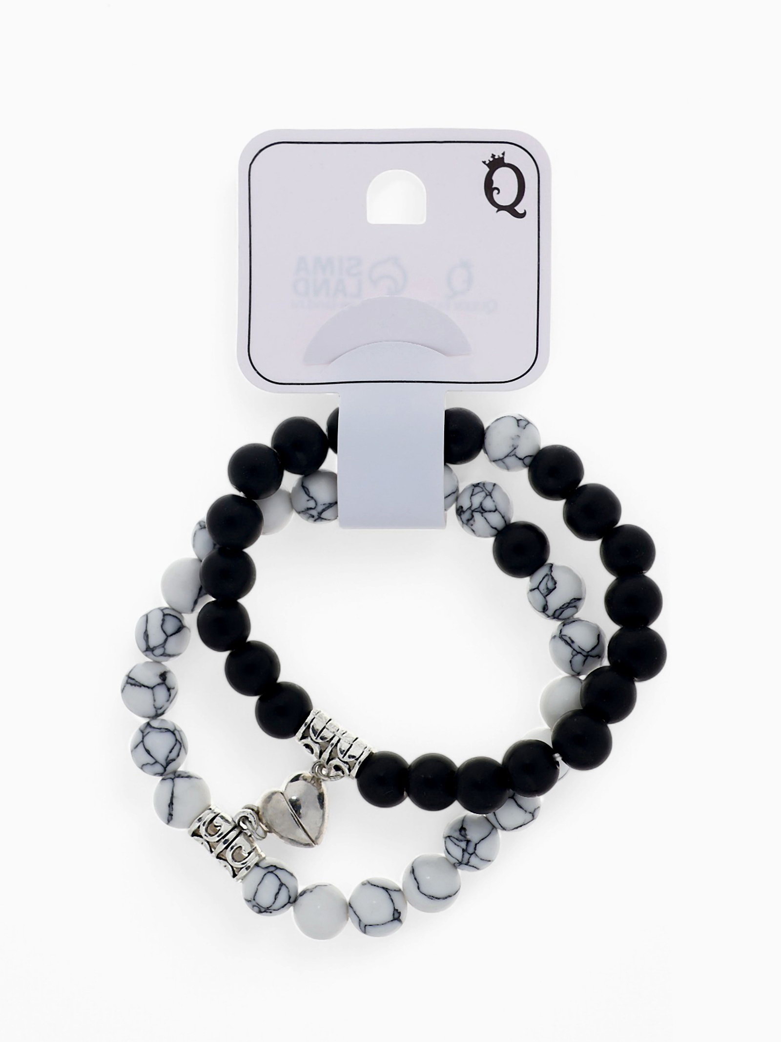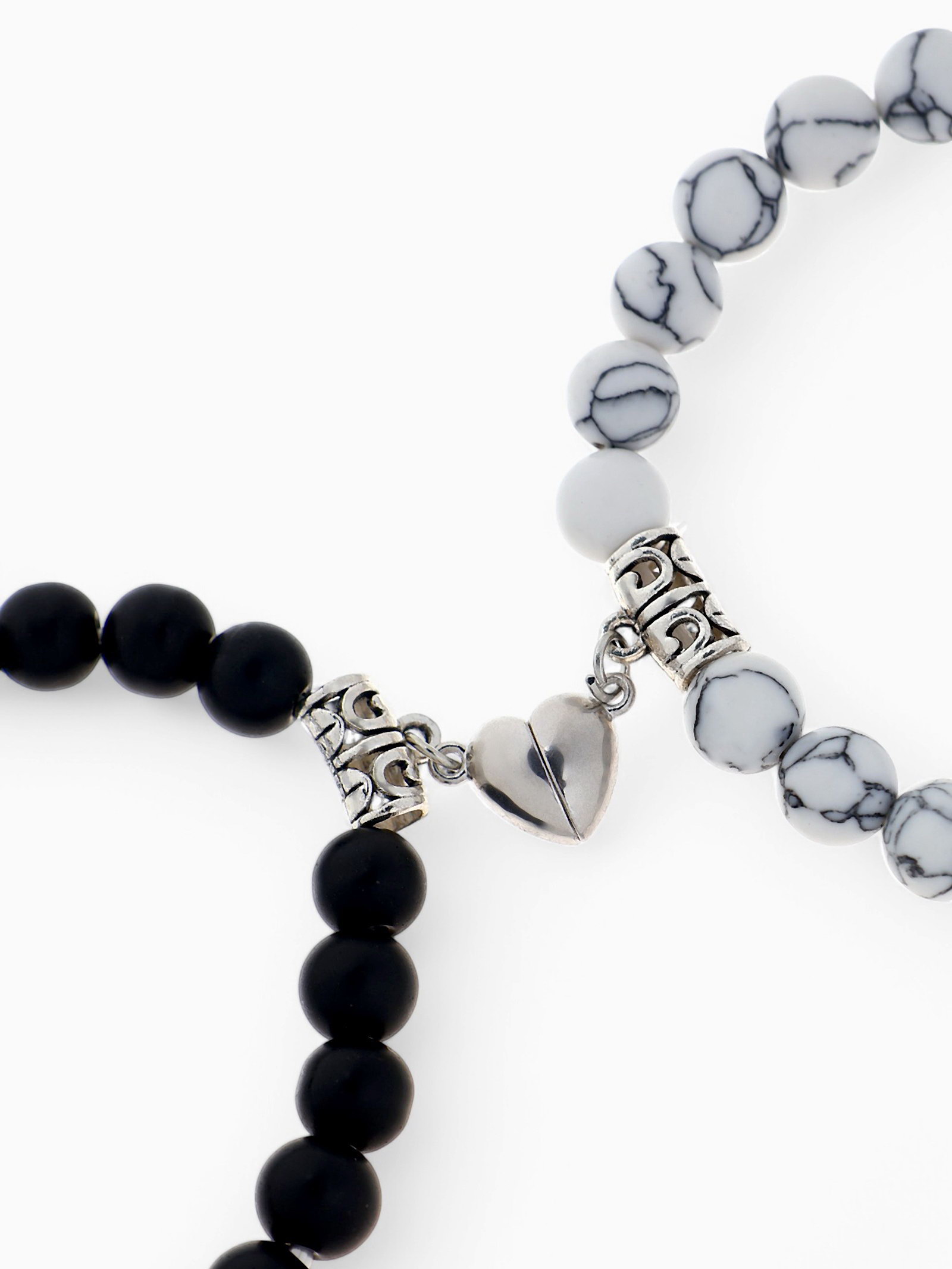 Браслеты парные "Неразлучники" на магните, сердце, чёрно-белые в серебре, d=6 см, 0.8x6x1 см., QF, Китай
