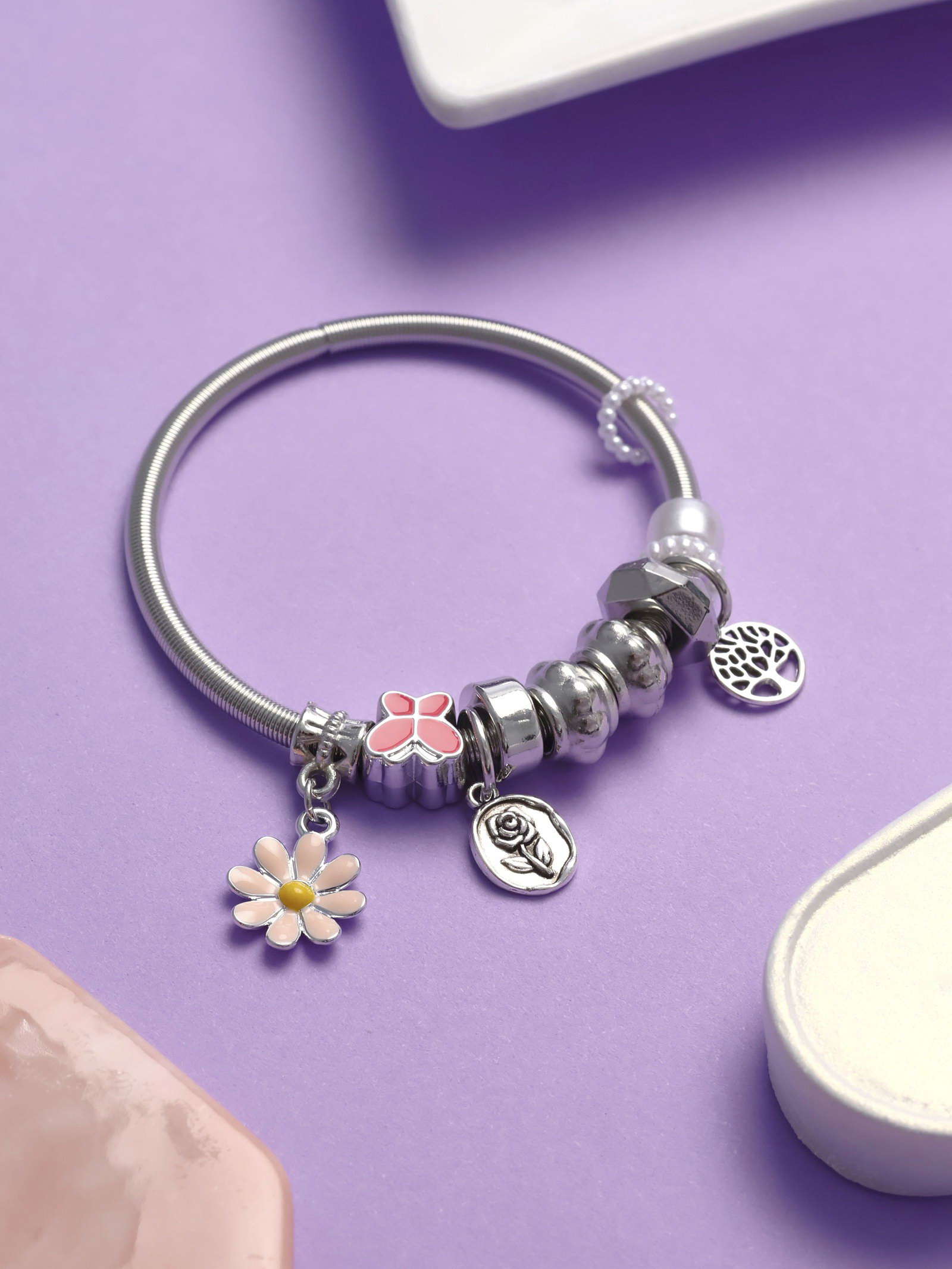 Браслет с шармами "Марджери" одинарный, цветочек, розовый в серебре, 2.5x6.5x1.5 см., QF, Китай