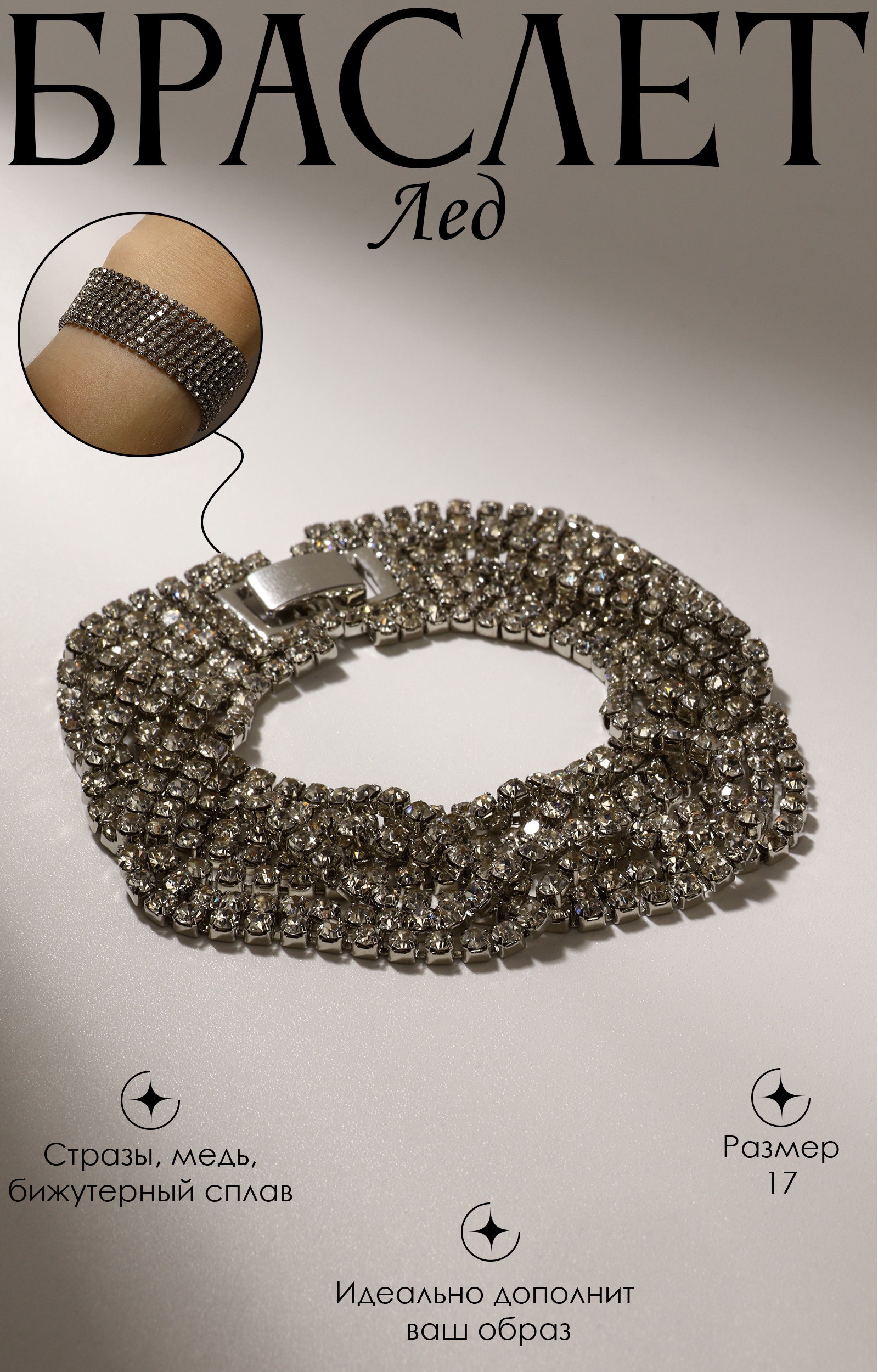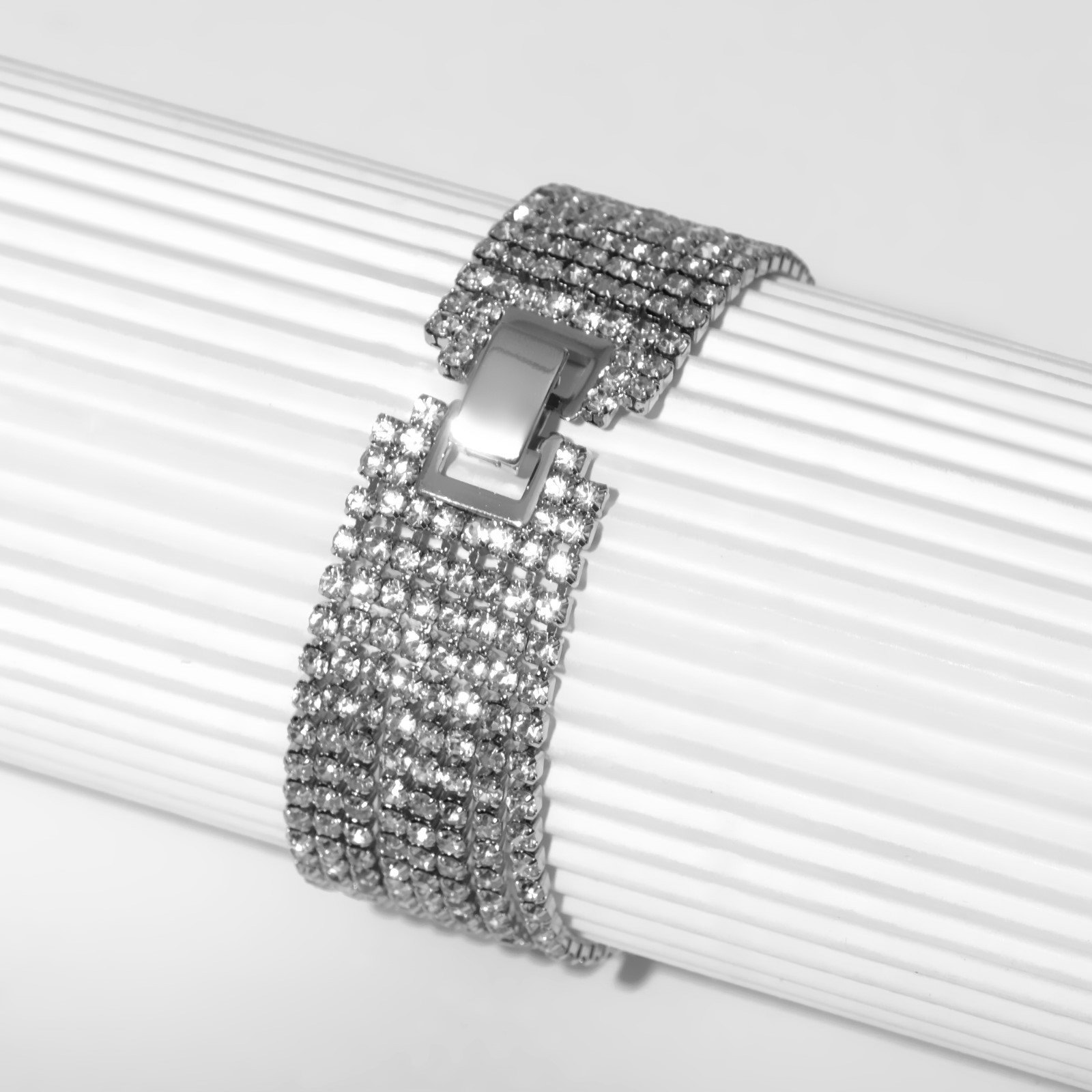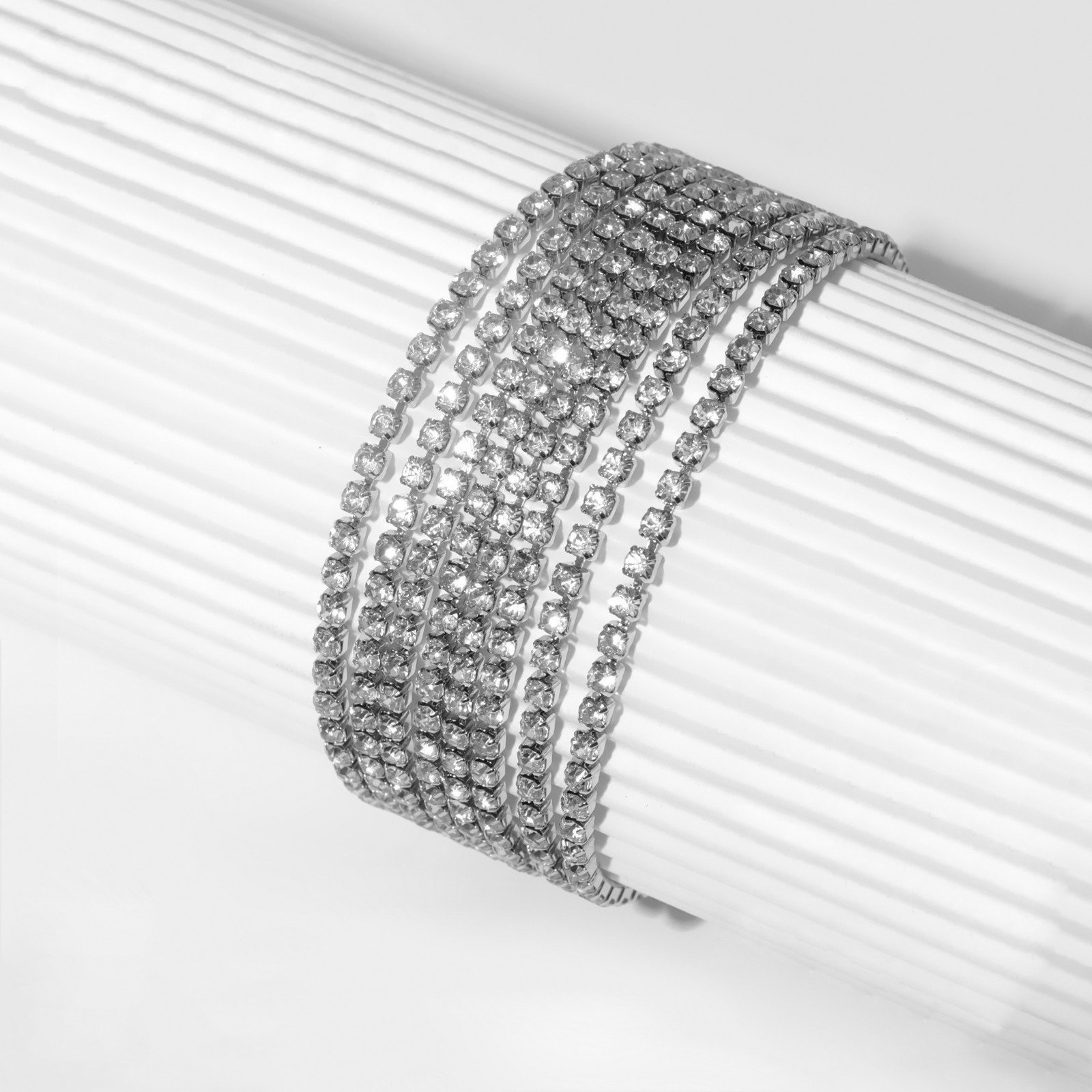 Браслет со стразами "Лёд", 8 рядов, цвет белый в серебре, 17 размер, 2.5x17x0.2 см., QF, Китай