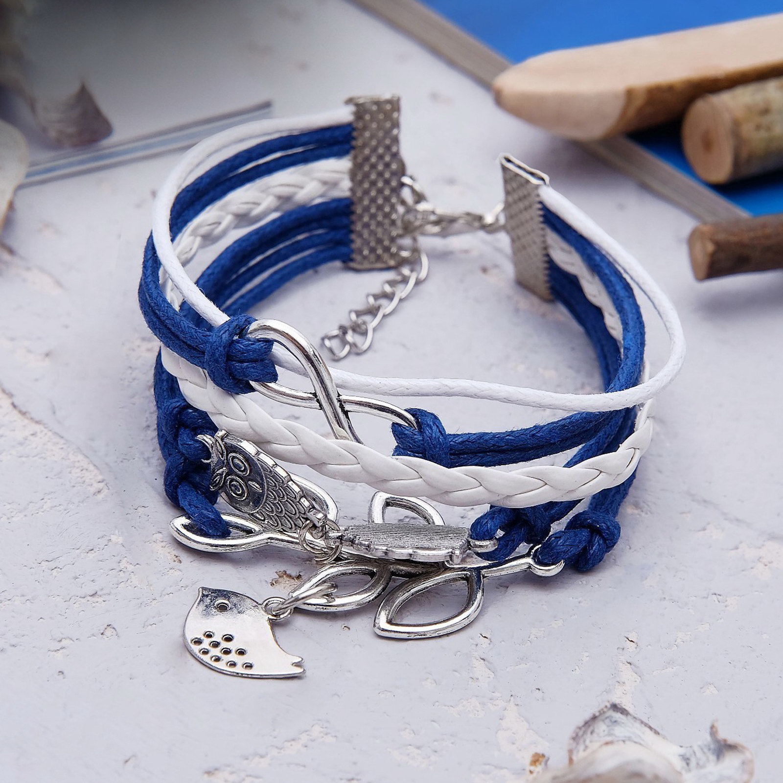 Браслет кожа "Магия знаков" совушки, 5 нитей, бело-синий, L=20 см, 3x20x0.5 см., QF, Китай