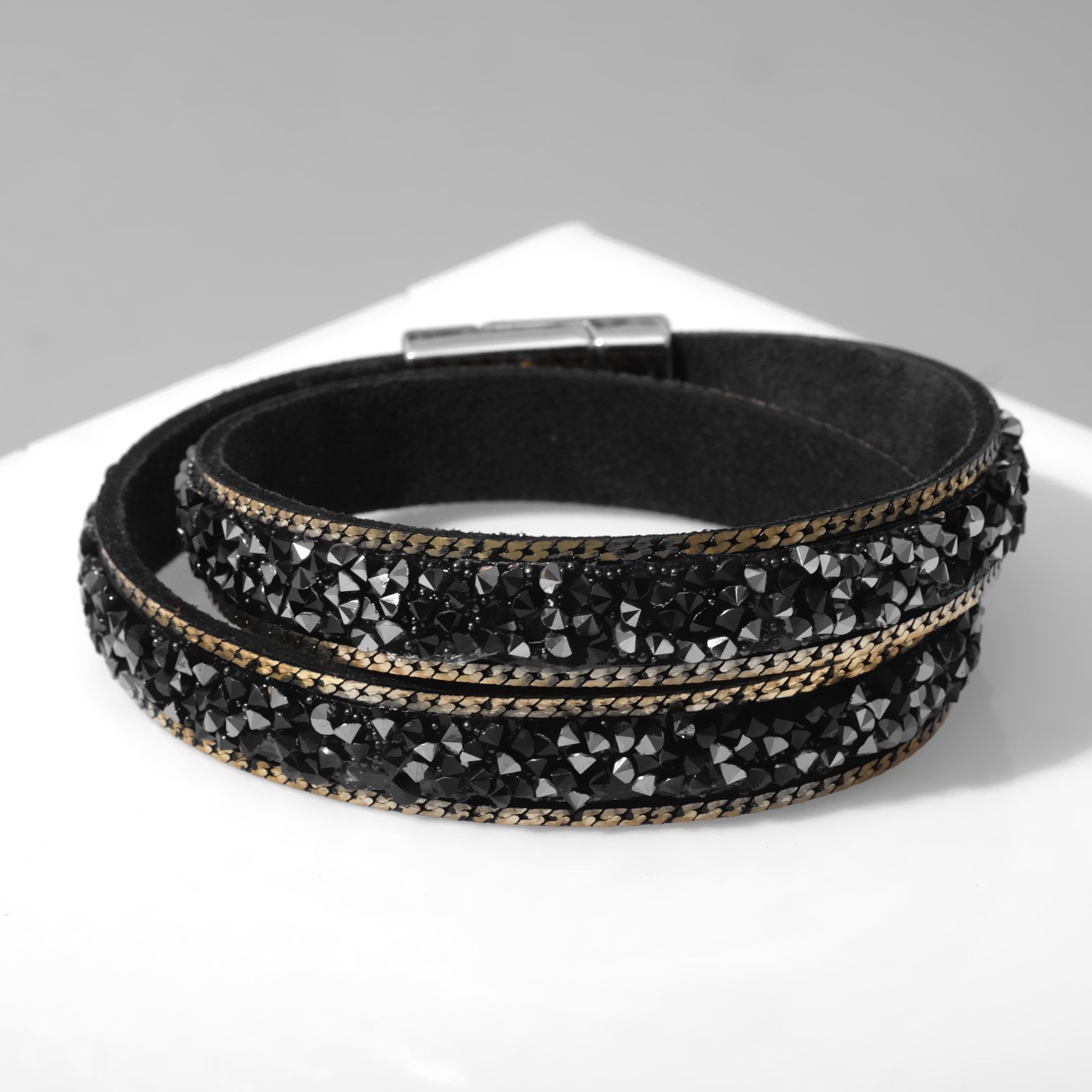 Вид: Браслет, Браслет-обод Размер упаковки: 1.7 x 0.5 x 37 см. Цвет фурнитуры: Серебряный Длина, см: 37 Для кого: Для женщины Тематика праздника: Универсальная тематика Материал основания: Искусственная кожа Бижутерия с открыткой: Нет Цвет: Чёрный Вставка/Подвеска: Стразы Набор: Нет Температурное ограничение: Нет Вид застёжки: Складная застёжка tnved: 7117900000 Тематика: Кристаллы Материал основы: Искусственная кожа Серый браслет-обод длиной 37 см сочетает в себе современную элегантность и утончённость благодаря искусственной коже и изящной отделке стразами. Его лаконичный дизайн с серебристой фурнитурой создаёт эффект россыпи камней, придавая образу лёгкую мерцающую динамику и стильный акцент. Складная застёжка обеспечивает удобство и надёжность фиксации, позволяя легко надевать и снимать украшение, а универсальная тематика делает браслет подходящим для любого повода от повседневных дел до праздничных мероприятий.