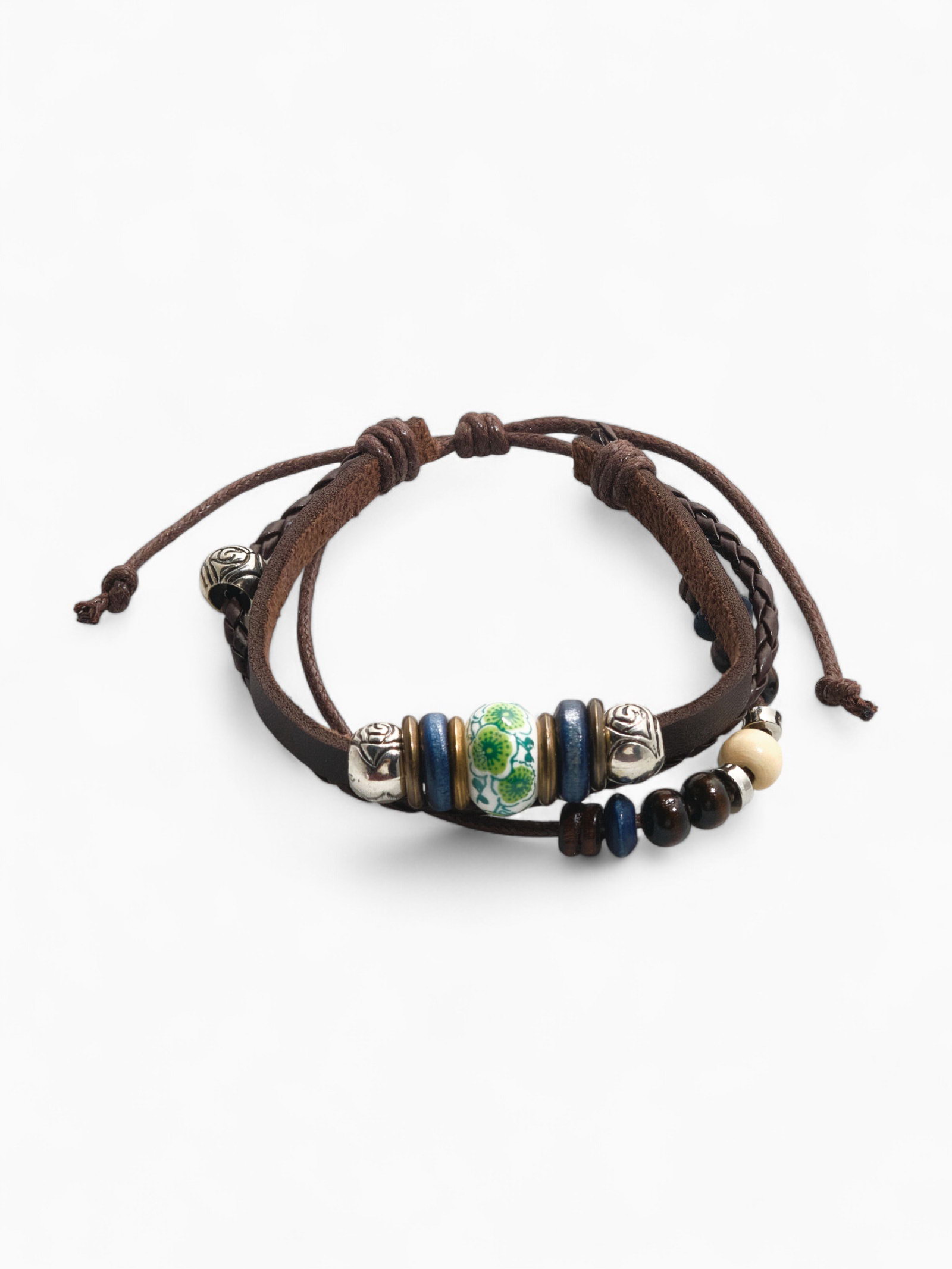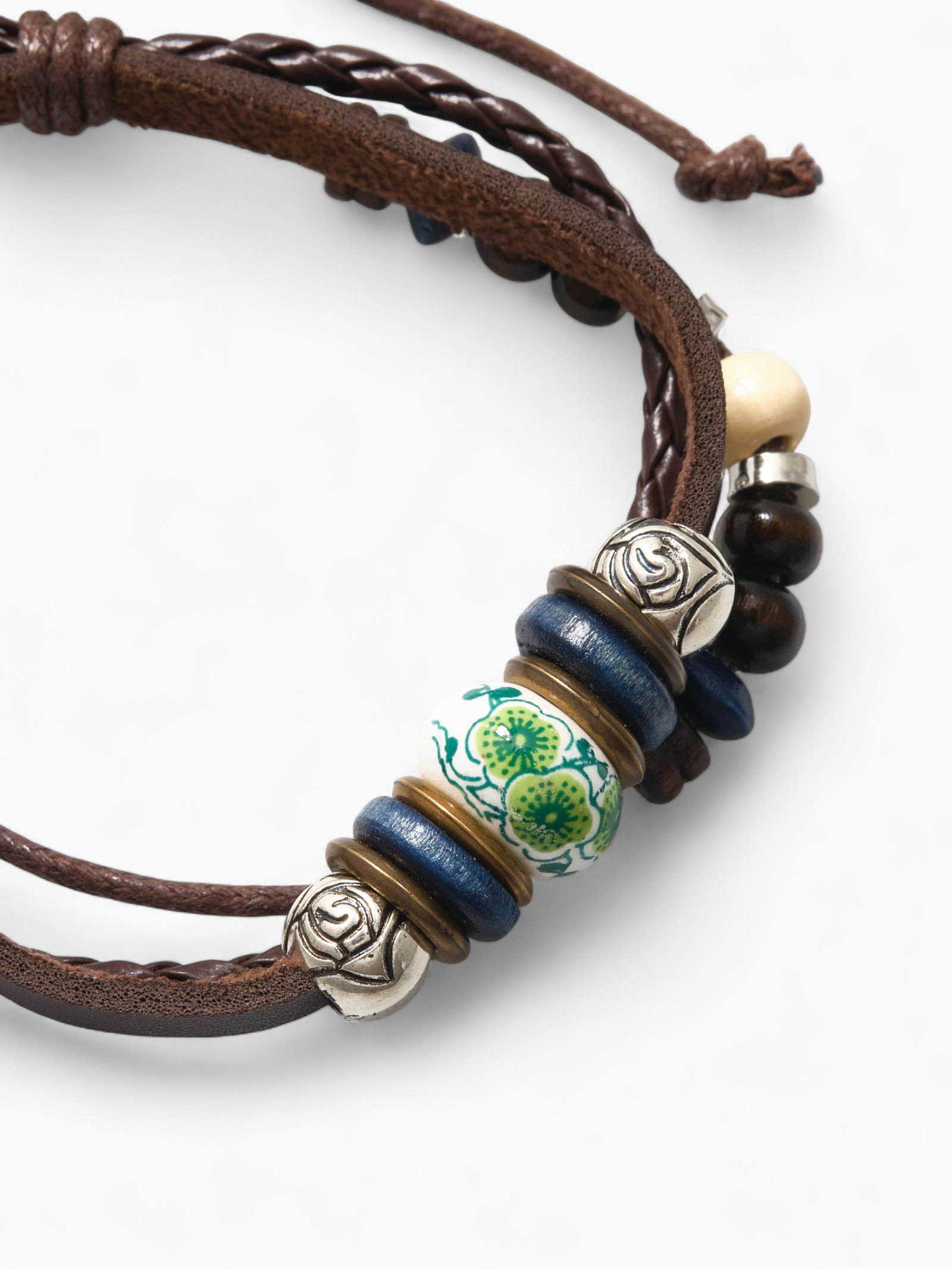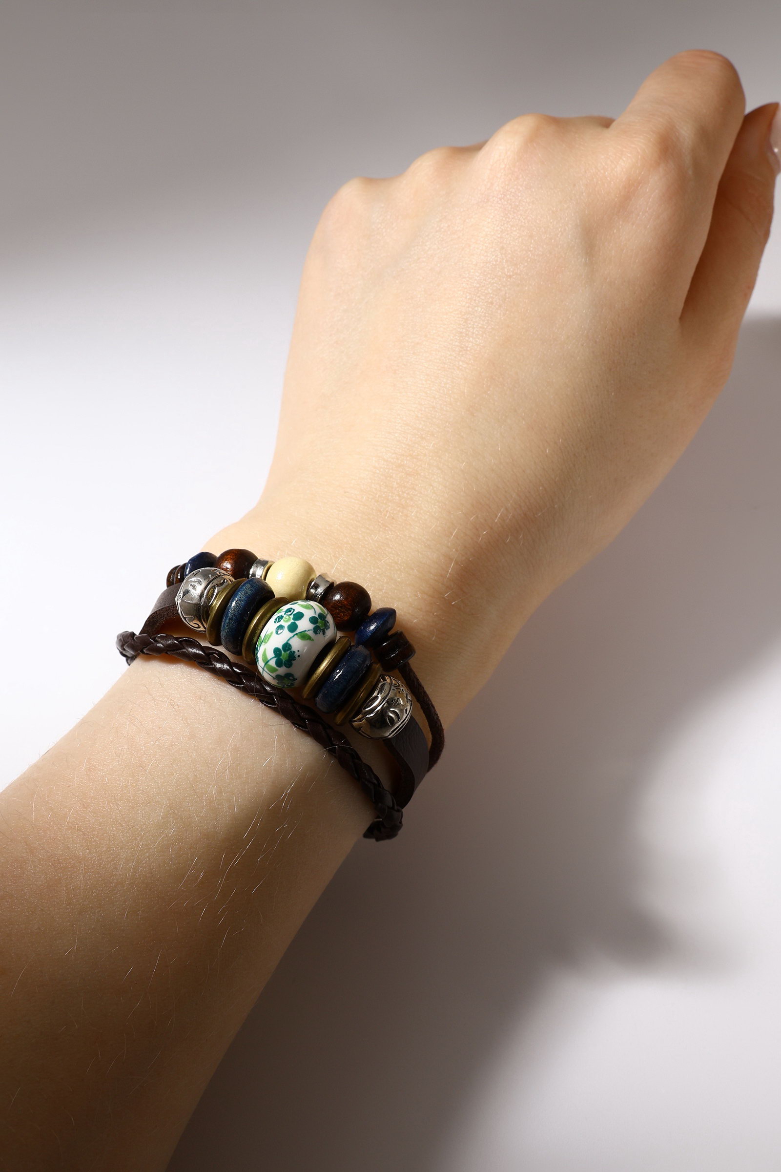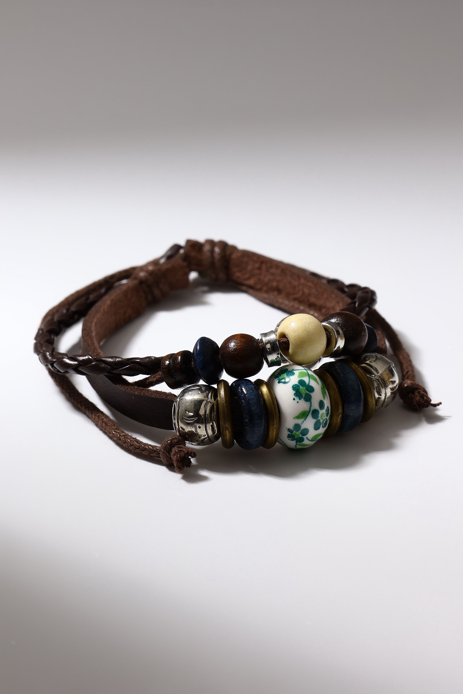 Браслет кожа "Хиппи" бусина, коричневый, d=6 см, 2x6x1 см., QF, Китай