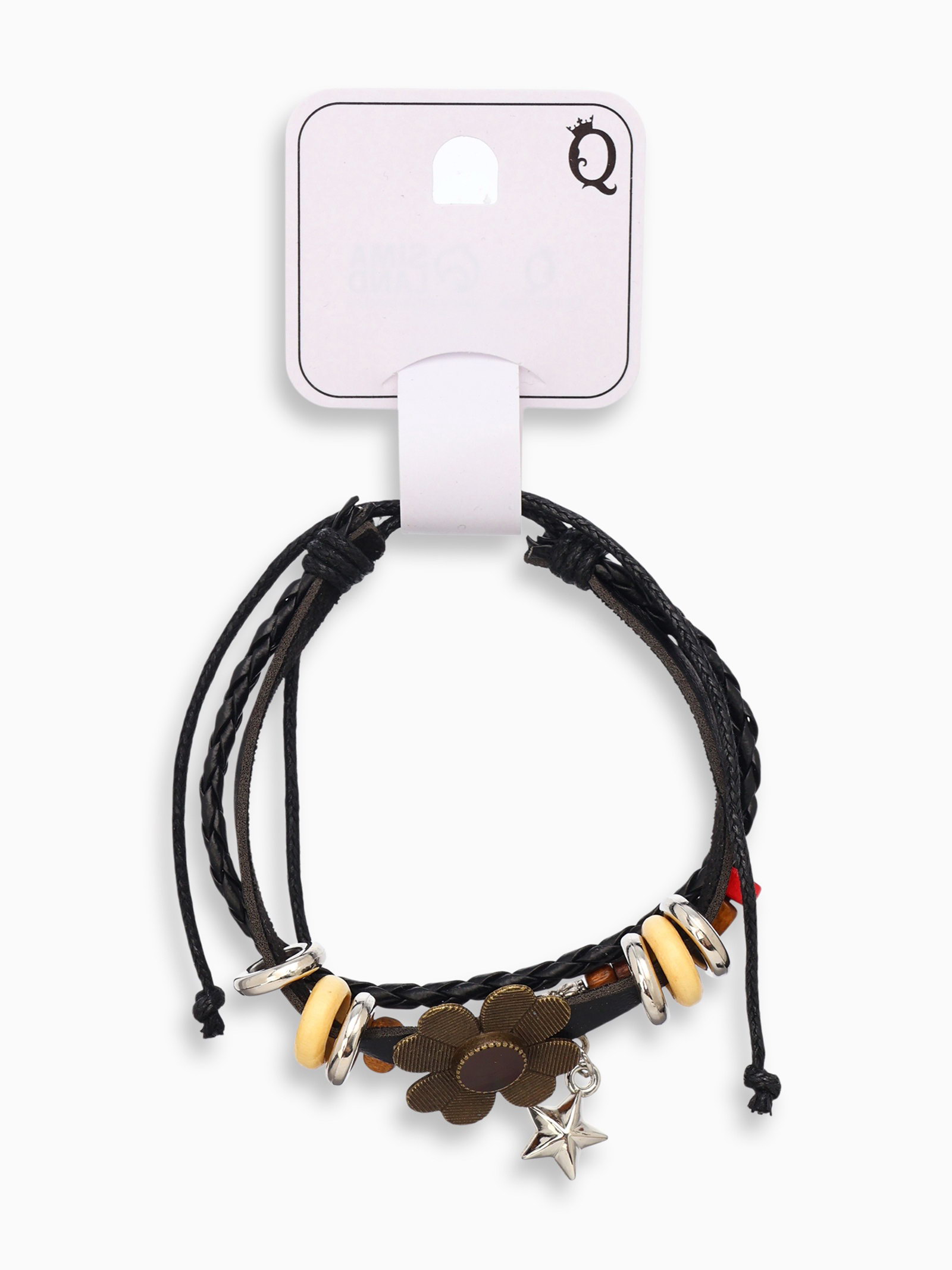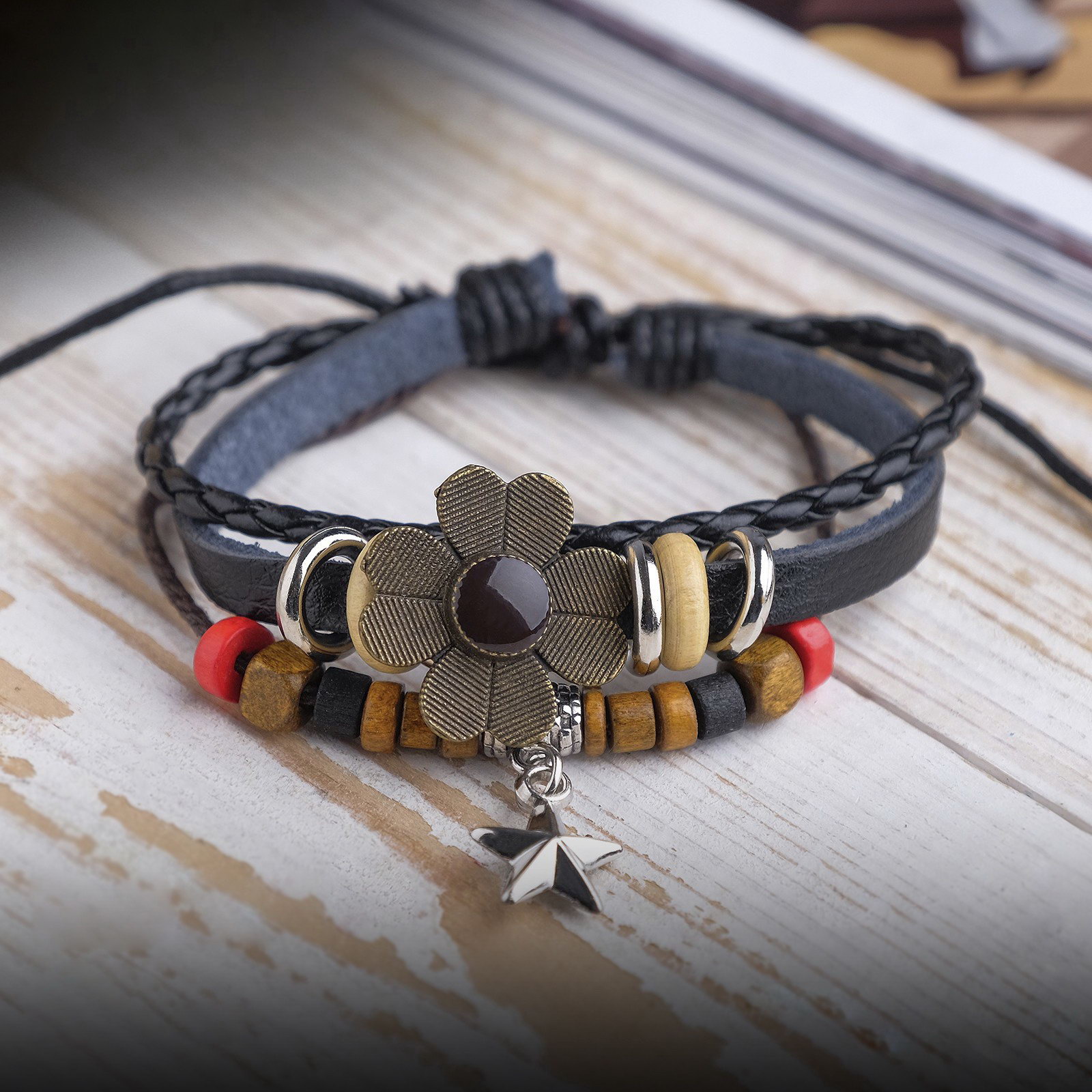 Браслет кожа "Цветок со звездочкой" хиппи, коричнево-чёрный, 6 см, 3.5x6x0.5 см., QF, Китай