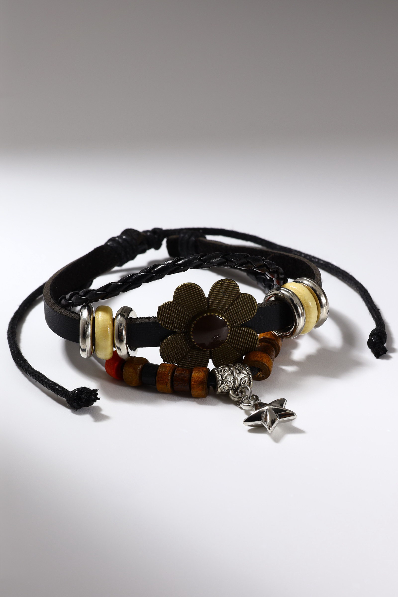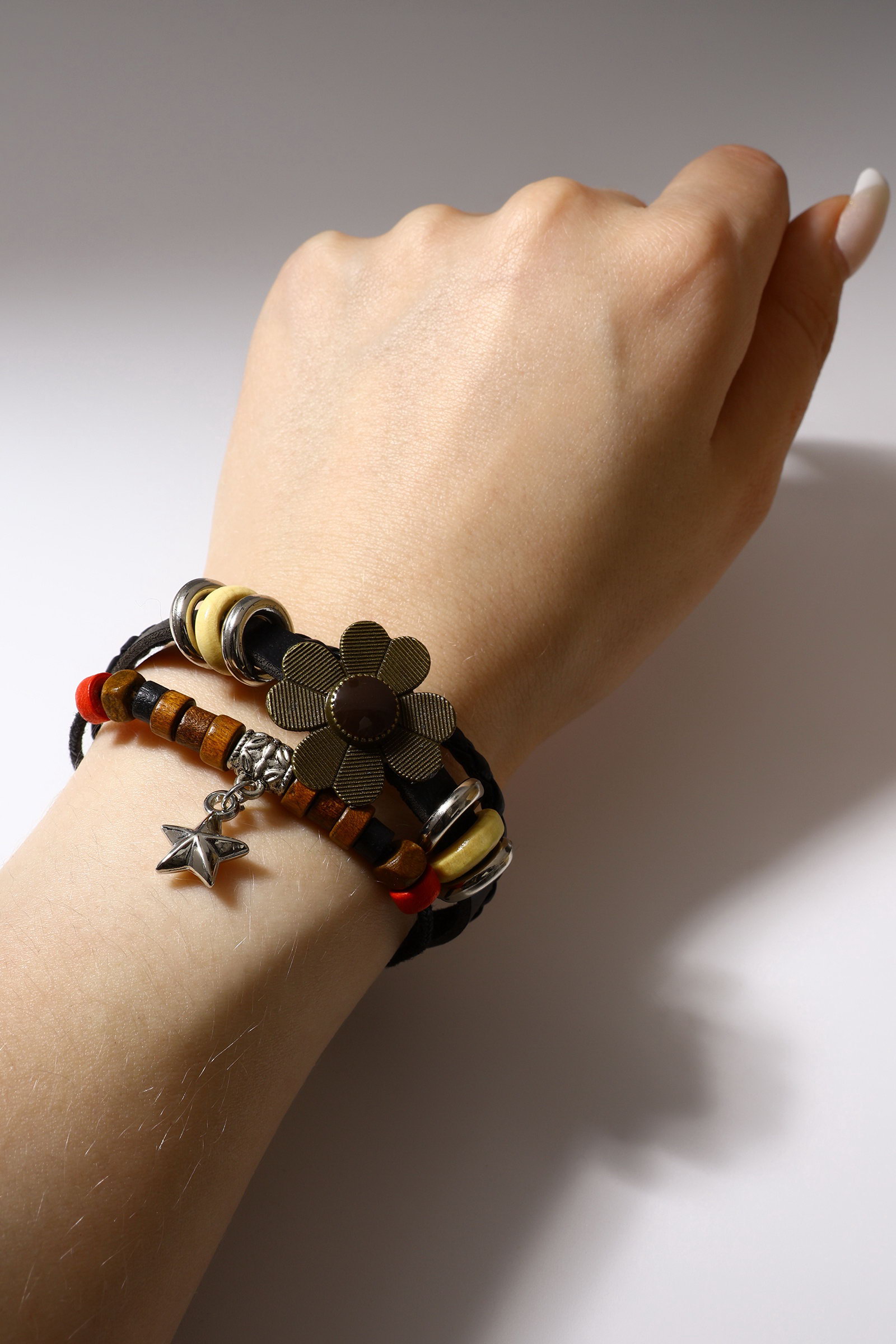 Браслет кожа "Цветок со звездочкой" хиппи, коричнево-чёрный, 6 см, 3.5x6x0.5 см., QF, Китай