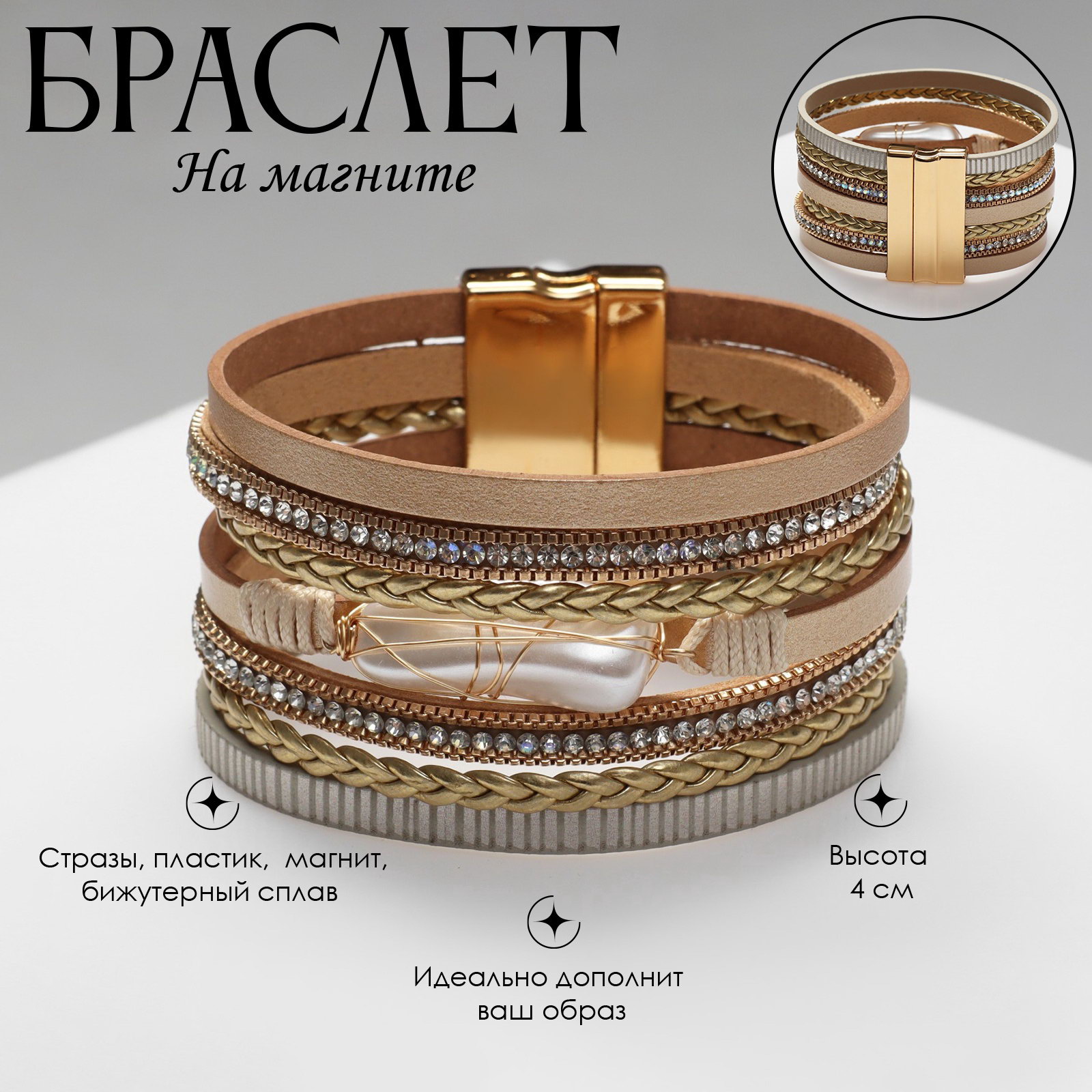 Вид: Браслет, Браслет-обод, Браслеты Вставка/Подвеска: Магнит, Металл, Пластик, Стразы Размер упаковки: 4.5 x 0.5 x 19.5 см. Температурное ограничение: Нет Для кого: Для женщины Материал основания: Искусственная кожа В наборе, шт.: 1 Тематика праздника: Универсальная тематика Цвет: Бежевый Цвет вставки: Белый Бижутерия с открыткой: Нет Вид застёжки: Магнитный замок tnved: 7117900000 Тематика: Восточная Длина, см: 19.5 Материал основы: Искусственная кожа Цвет фурнитуры: Золотой Набор: Нет Откройте для себя великолепие украшений с браслетом на магните, который выступает в роли изысканного аксессуара и символа стиля. Нежные бело-бежевые оттенки в сочетании с золотой фурнитурой создают атмосферу элегантности, подчеркивая вашу индивидуальность на любом мероприятии. Изготовленный из качественной искусственной кожи, браслет отличается прочностью и комфортом. С длиной 19,5 см он идеально облегает запястье, а магнитный замок обеспечивает надежное и простое закрытие, что делает его идеальным выбором для ежедневного ношения.