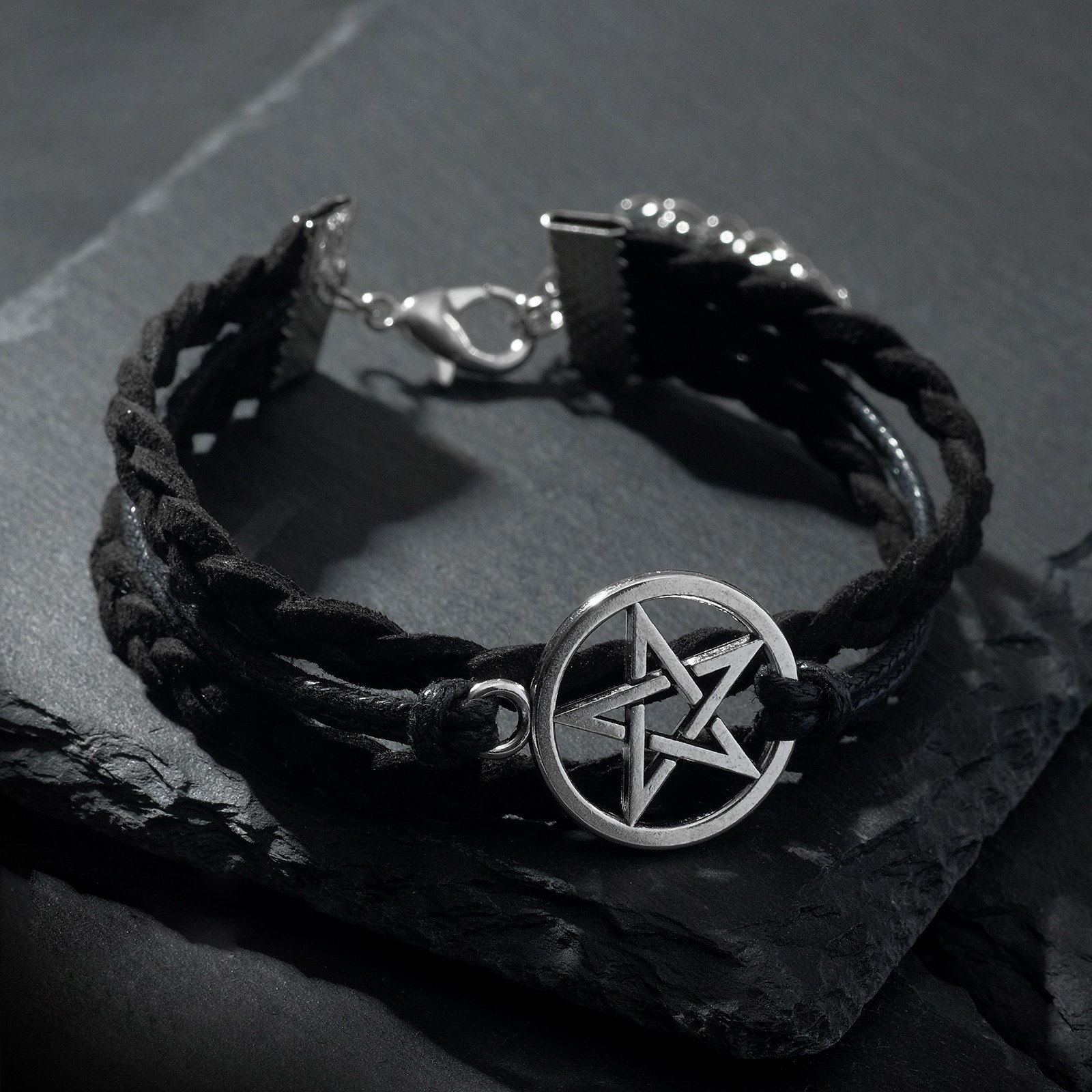 Браслет кожа "Пентаграмма" защита, цвет чёрный в серебре, L=17 см, 1.5x17x0.5 см., QF, Китай