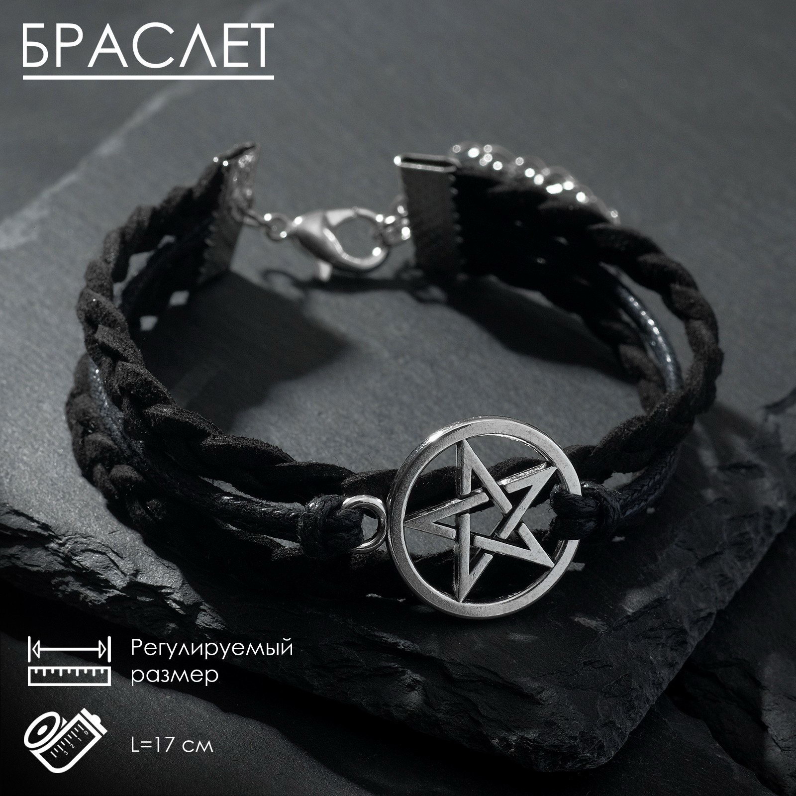 Для кого: Для женщины, Для мужчины, Унисекс Вид: Браслет, Браслеты, Фенечка Материал основы: Искусственная кожа, Текстиль Размер упаковки: 6 x 1 x 6 см. Длина, см: 17 Материал основания: Искусственная кожа Тематика праздника: Универсальная тематика Температурное ограничение: Нет Вид застёжки: Карабин Бижутерия с открыткой: Нет Цвет вставки: Серебристый tnved: 7117190000 Тематика: Готическая Цвет: Чёрный Цвет фурнитуры: Серебряный Вставка/Подвеска: Металл Набор: Нет Этот браслет с пентаграммой символ защиты и внутренней силы, объединяющий в себе стиль и глубокий смысл. Изготовленный из искусственной кожи с серебристой фурнитурой, он идеально подходит для тех, кто ценит индивидуальность и ищет гармонию между эстетикой и энергетикой. Длина 17 см делает его универсальным аксессуаром для мужчин и женщин, а застёжка-карабин обеспечивает надёжную фиксацию на руке. Вставка из металла с изображением пентаграммы служит мощным талисманом, придающим уверенности и защищённости в любой ситуации. Такой браслет станет не только стильным дополнением к вашему образу, но и символом личной силы и гармонии.