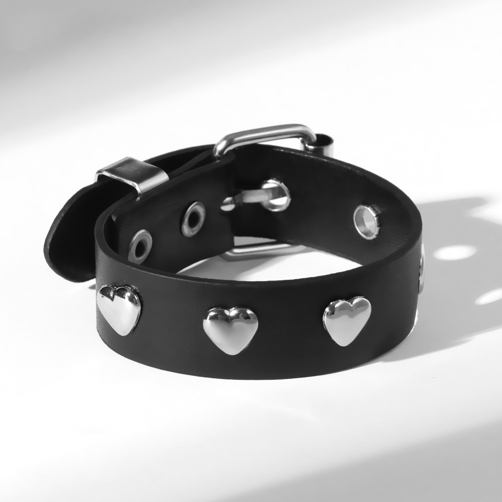 Браслет кожа "Хардкор" сердца, чёрный в серебре, 2.5x23x1.3 см., QF, Китай