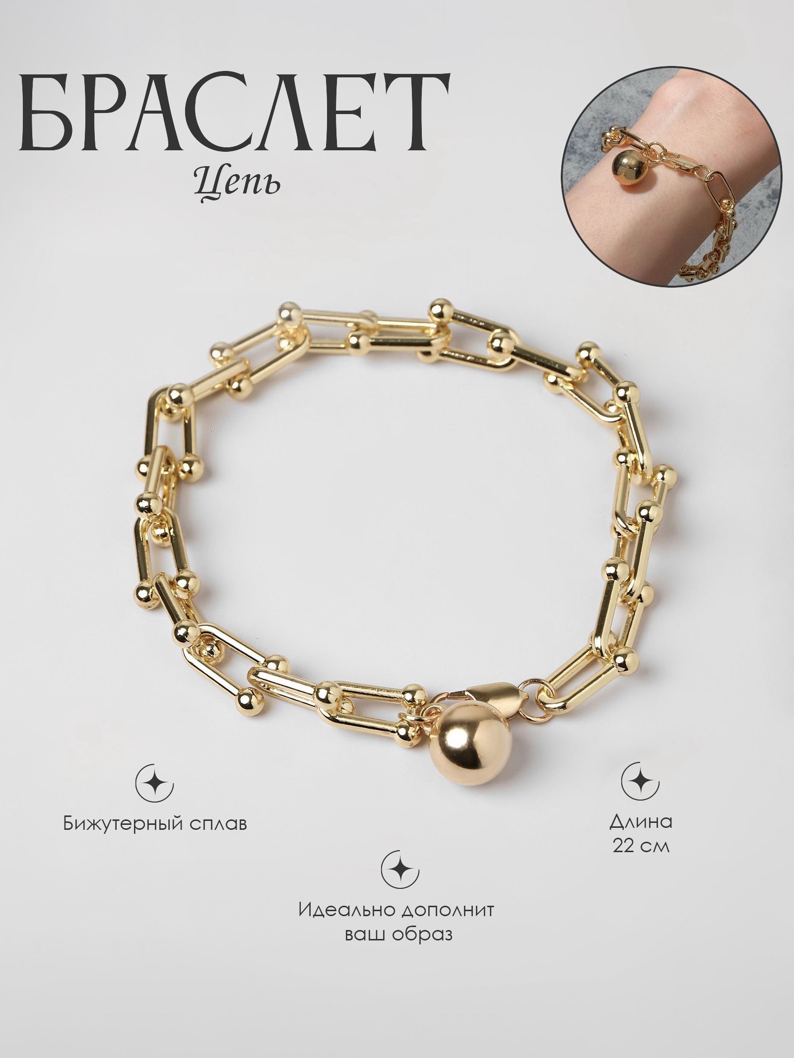 Вид: Браслет, Цепочка Тематика праздника: День рождения, Универсальная тематика Вид упаковки: Пакет, Подложка Размер упаковки: 6 x 1.5 x 7.5 см. Температурное ограничение: Нет Для кого: Для женщины Вид застёжки: Карабин Набор: Нет Адресат: Подруге tnved: 7117190000 Тематика: Минимализм Длина, см: 22 Цвет: Золотистый Вставка/Подвеска: Без вставок Цвет фурнитуры: Золотой Материал основы: Металл Золотистый металлический браслет длиной 22 см представляет собой элегантное украшение, способное стать ярким акцентом в любом образе. Его лаконичный дизайн в виде цепочки с шарообразными звеньями подчёркивает утончённость и женственность, придавая образу лёгкую роскошь и современный стиль. Надёжный карабин обеспечивает удобство и безопасность в носке, а качественный металл гарантирует долговечность и сохранение блеска даже при ежедневном использовании. Этот браслет универсален и отлично впишется как в повседневный гардероб, так и в праздничный ансамбль.