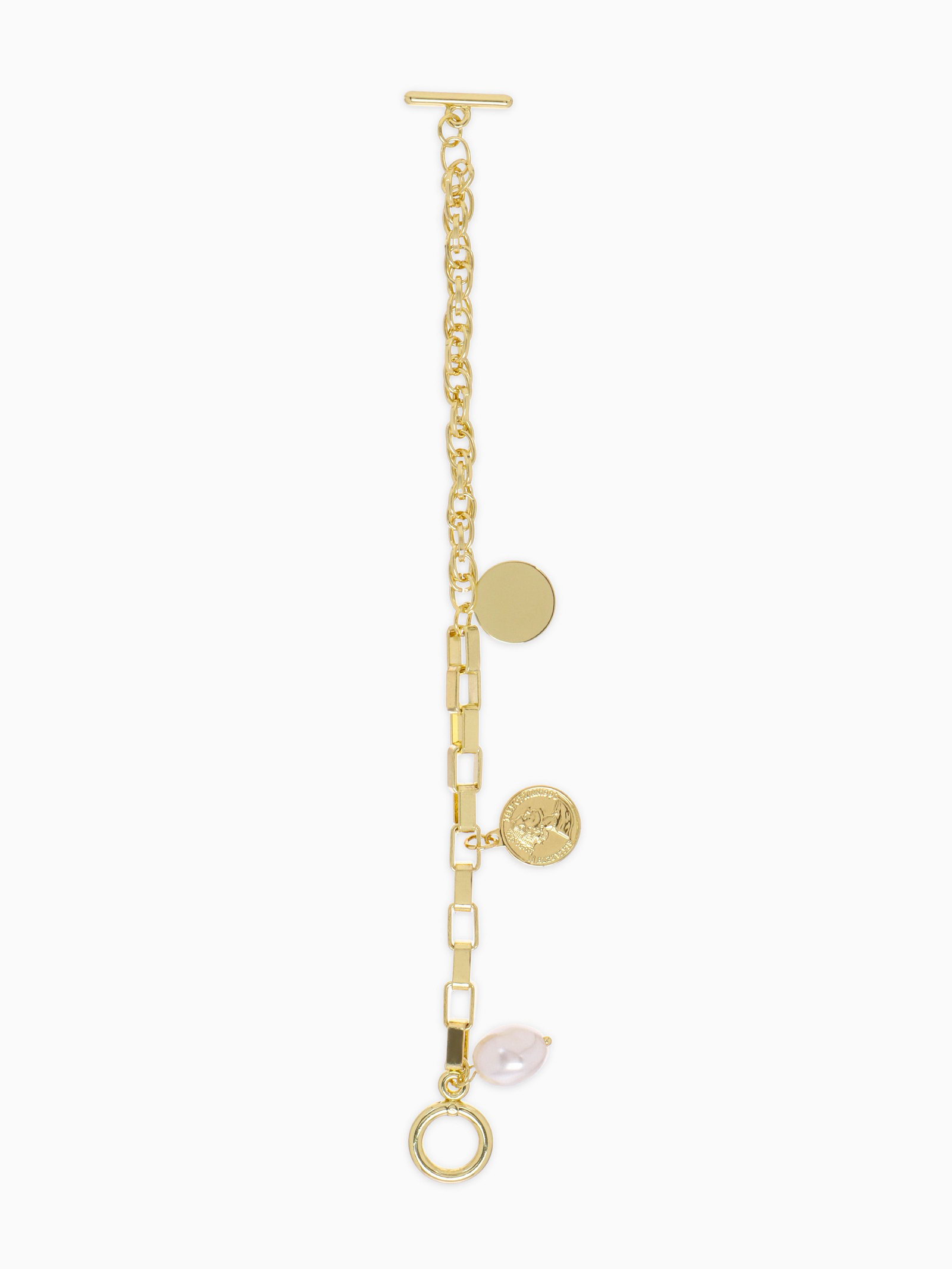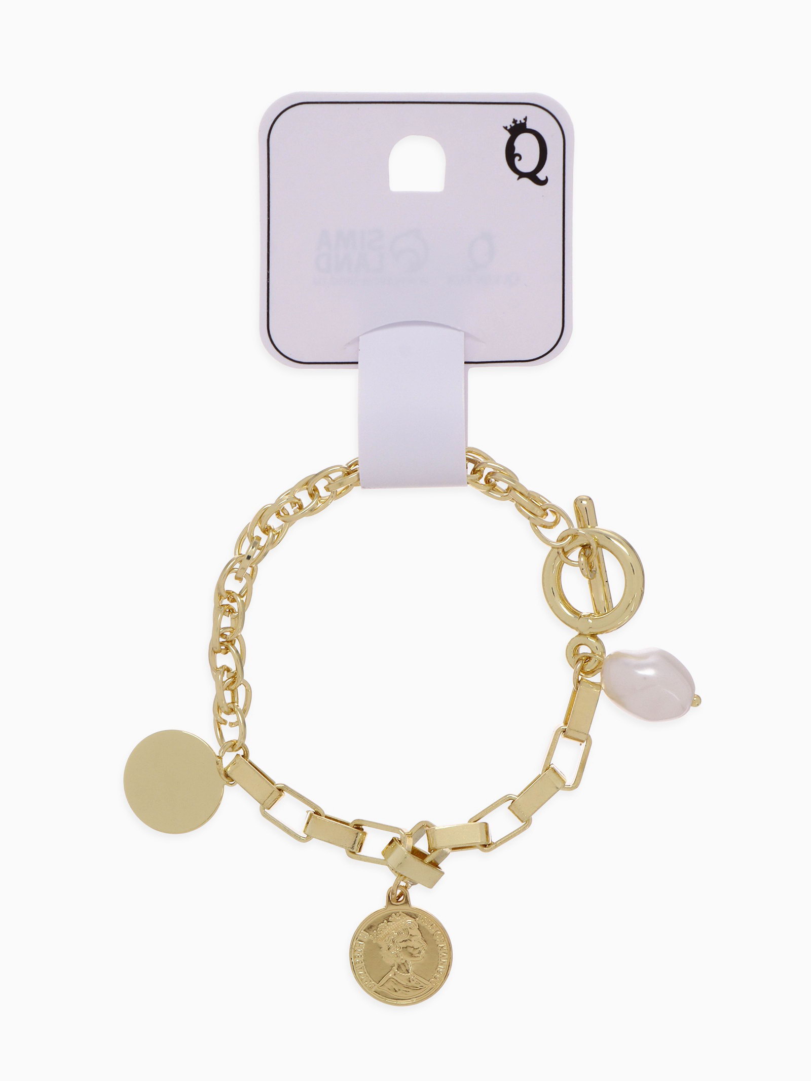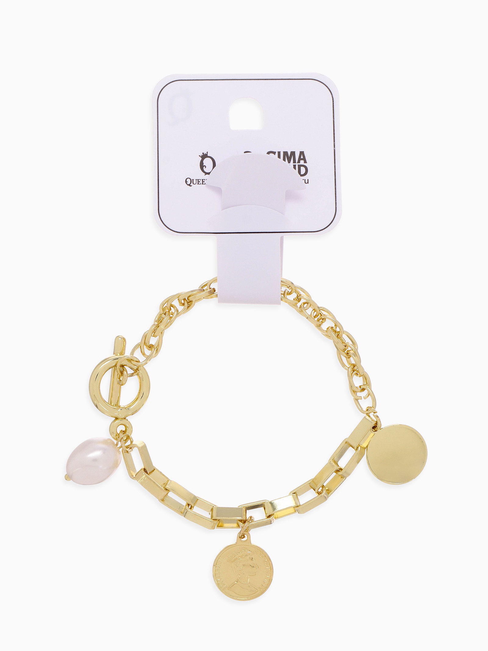 Браслет цепочка "Жемчуг и медальон", L=20 см, белый в золоте, 3x20x1 см., QF, Китай