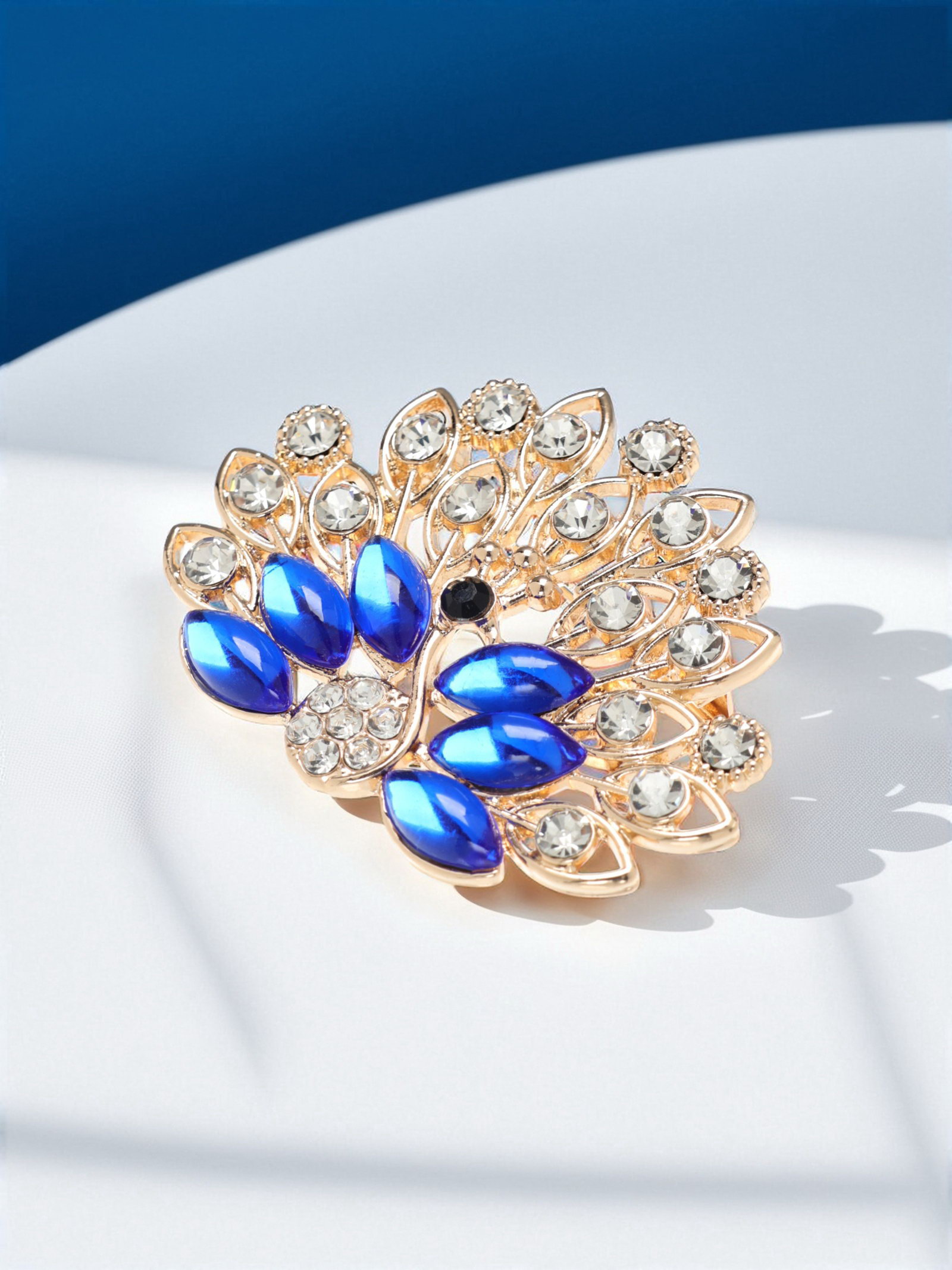 Брошь "Павлин" с пушистым хвостом, цвет синий в золоте, 4x5.4x0.8 см., QF, Китай