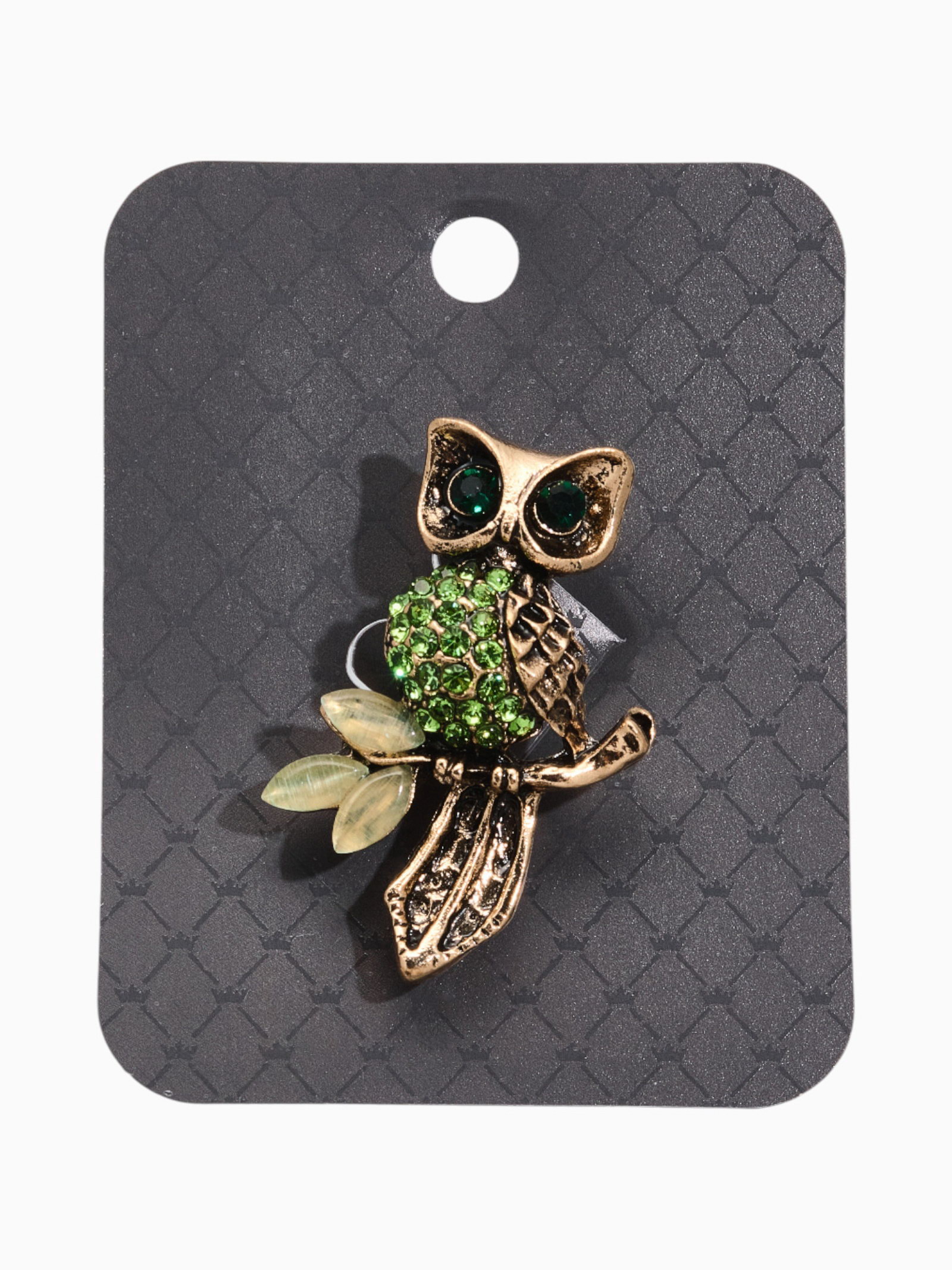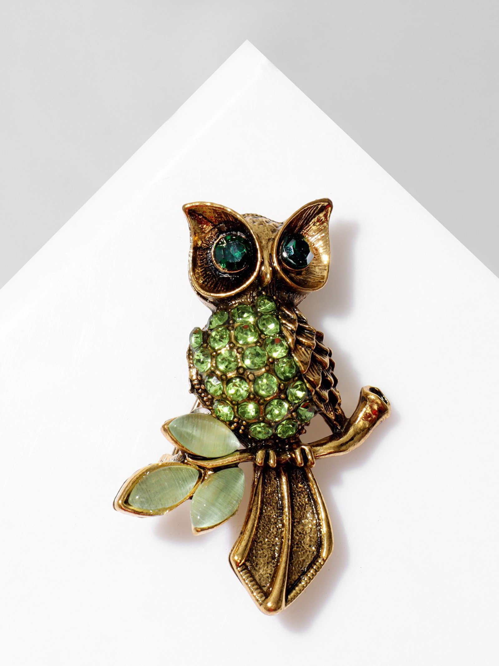 Брошь "Сова на ветке", цвет зелёный в чернёном золоте, 2x5x1 см., QF, Китай