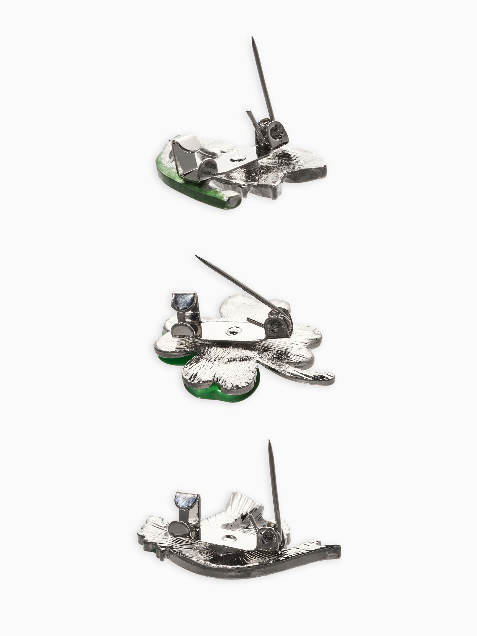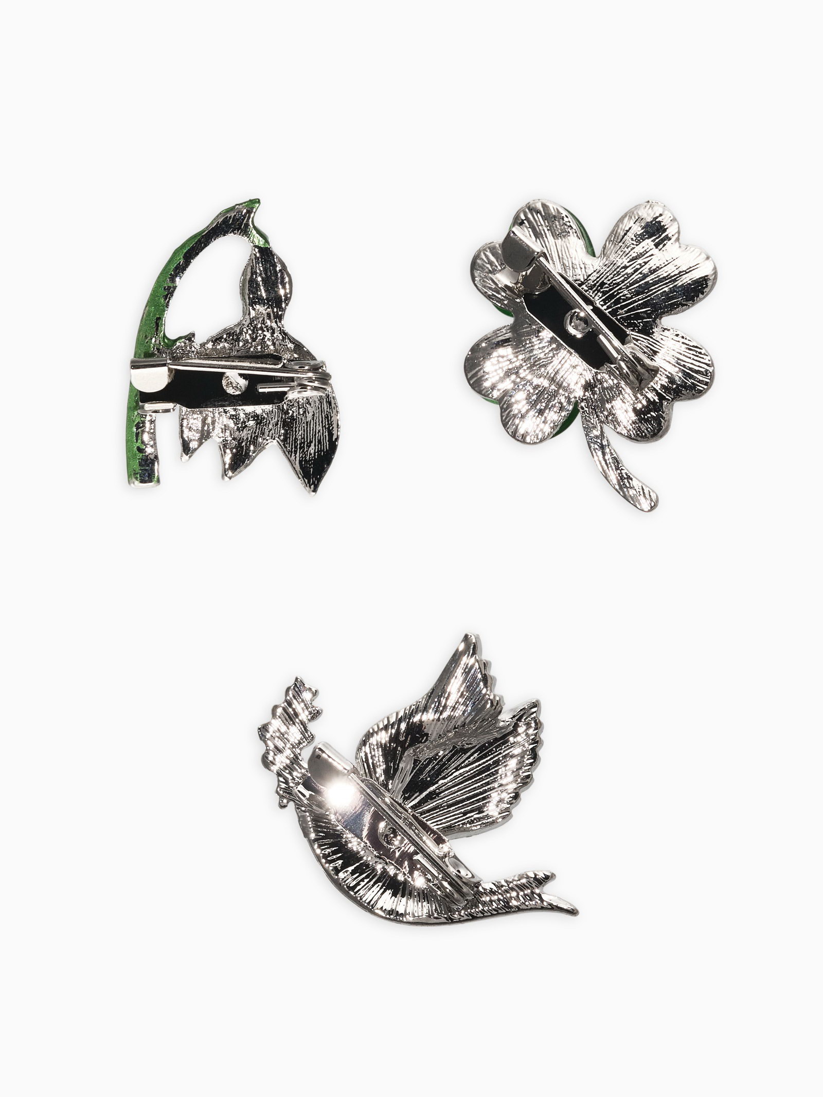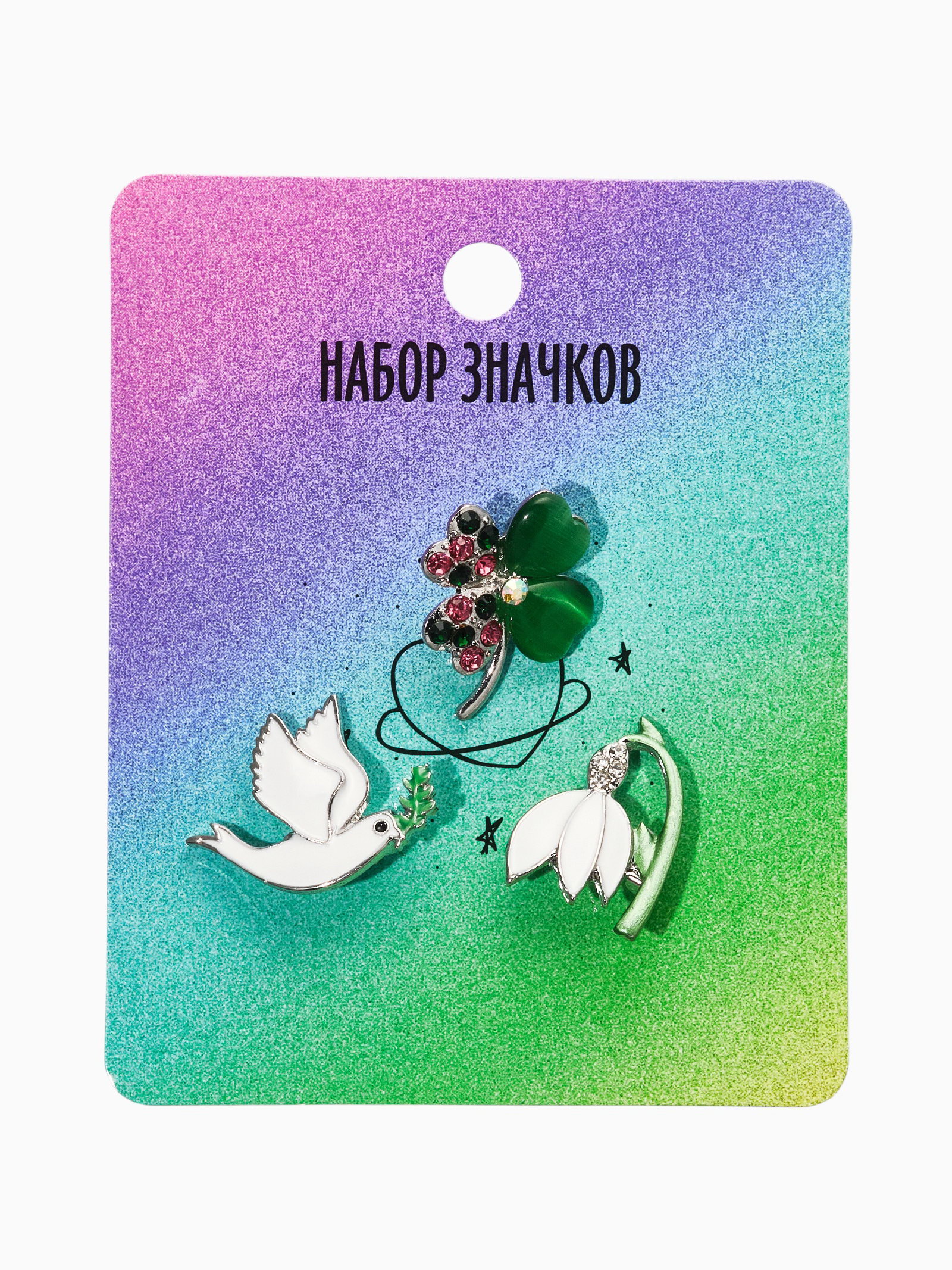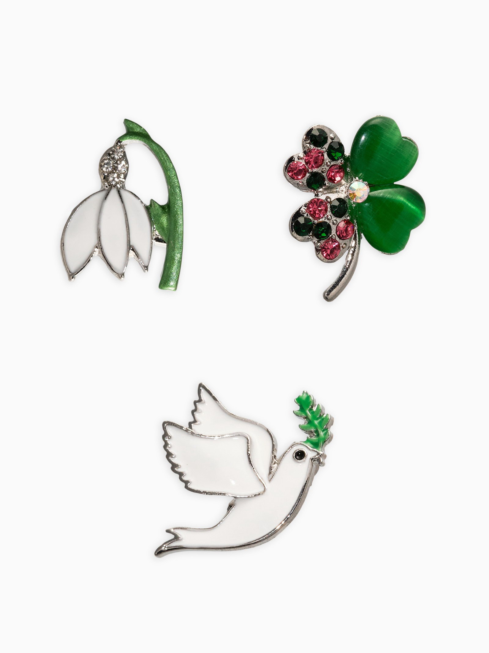 Броши "Голубь, клевер, подснежник", набор 3 шт. цветной в серебре, 7x8x1 см., QF, Китай