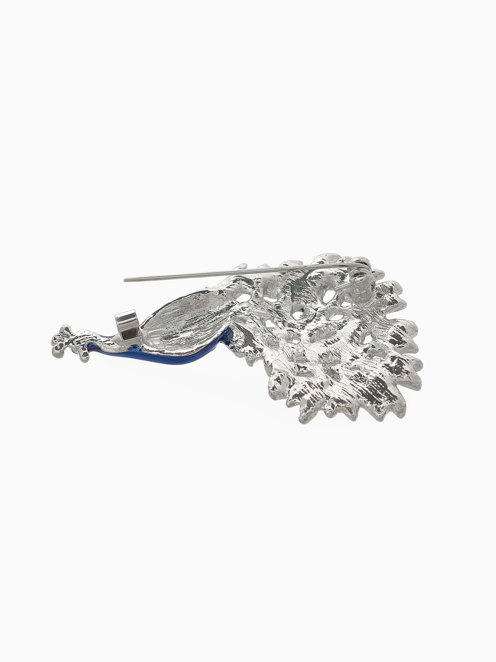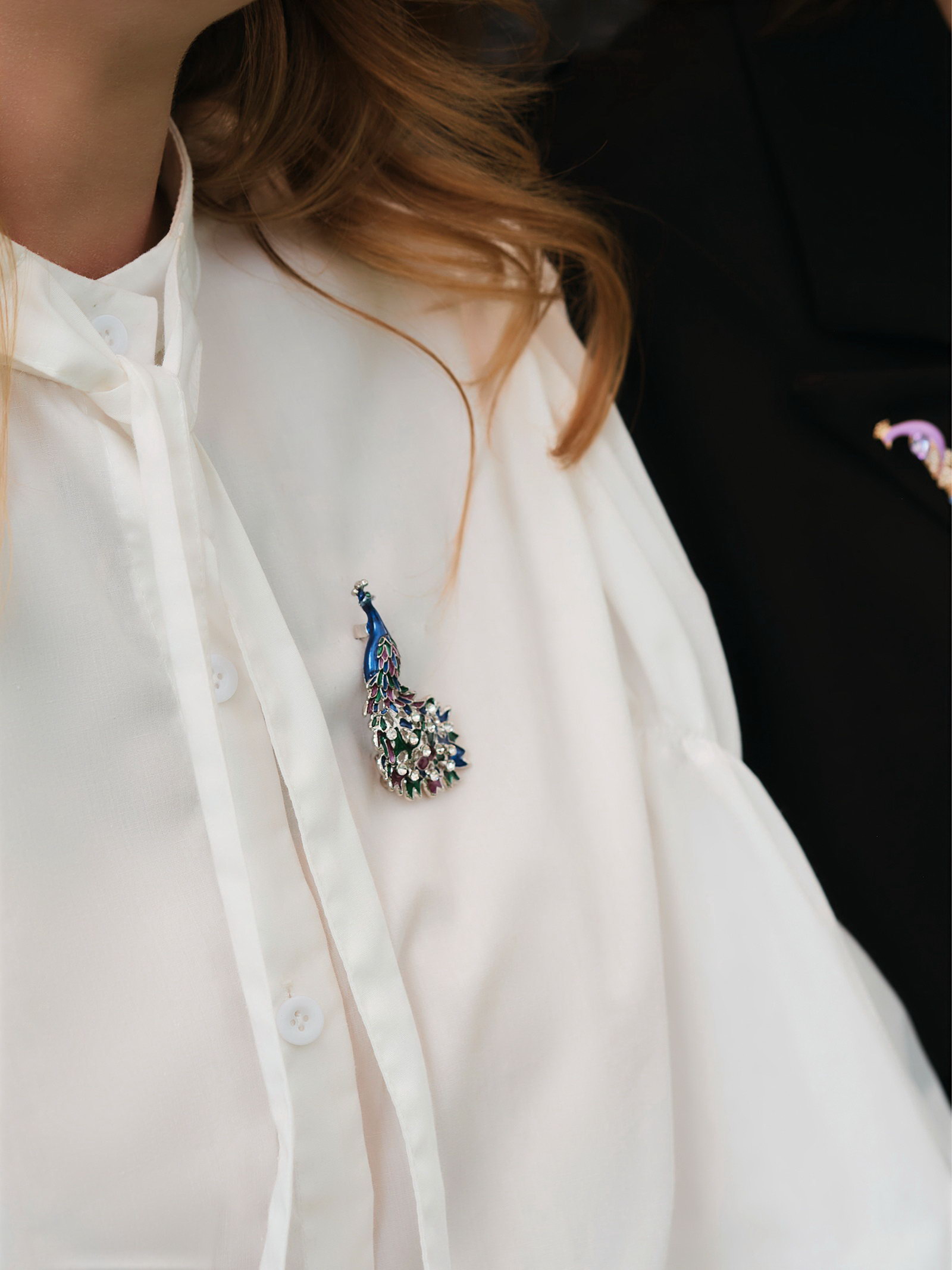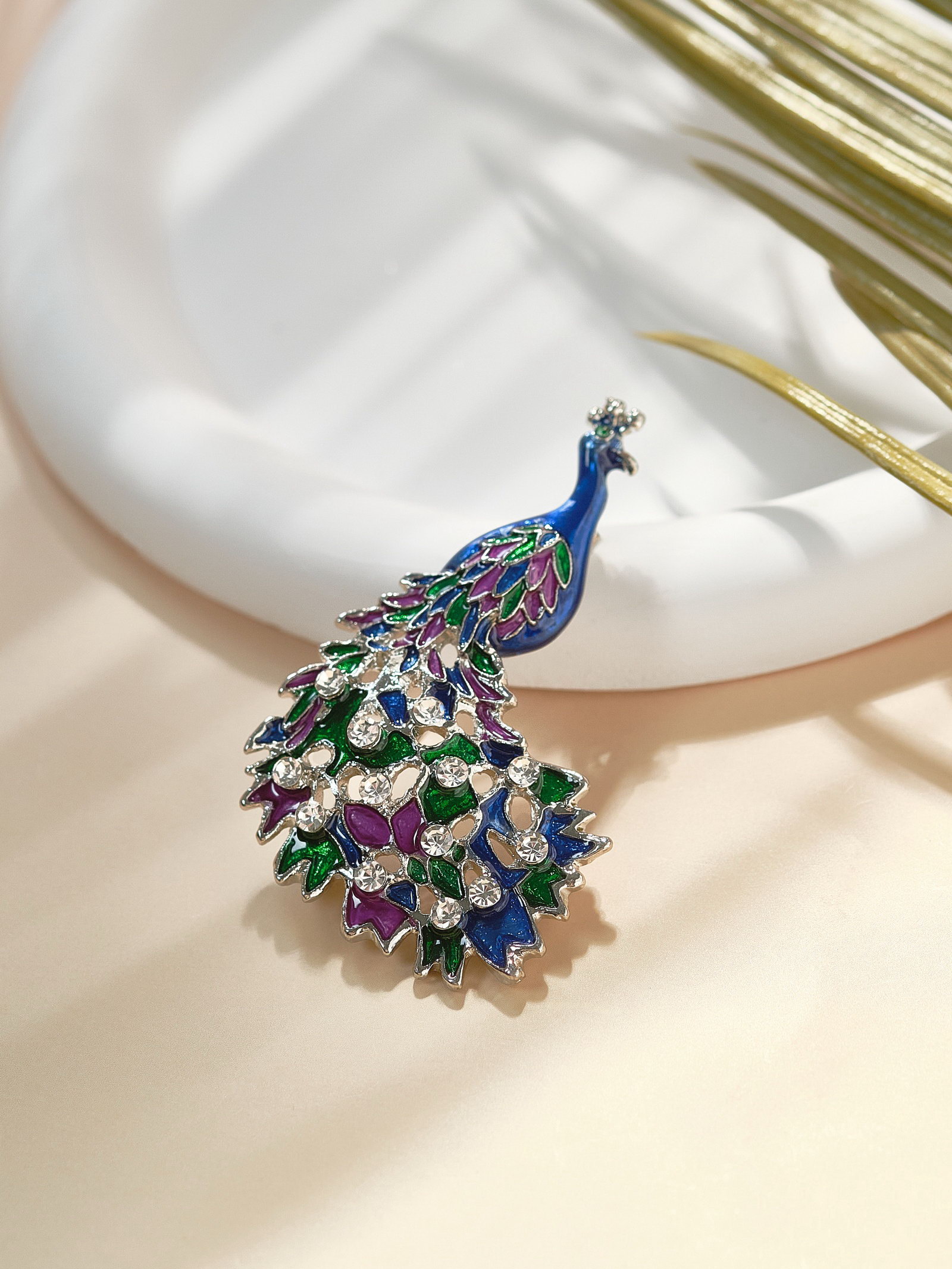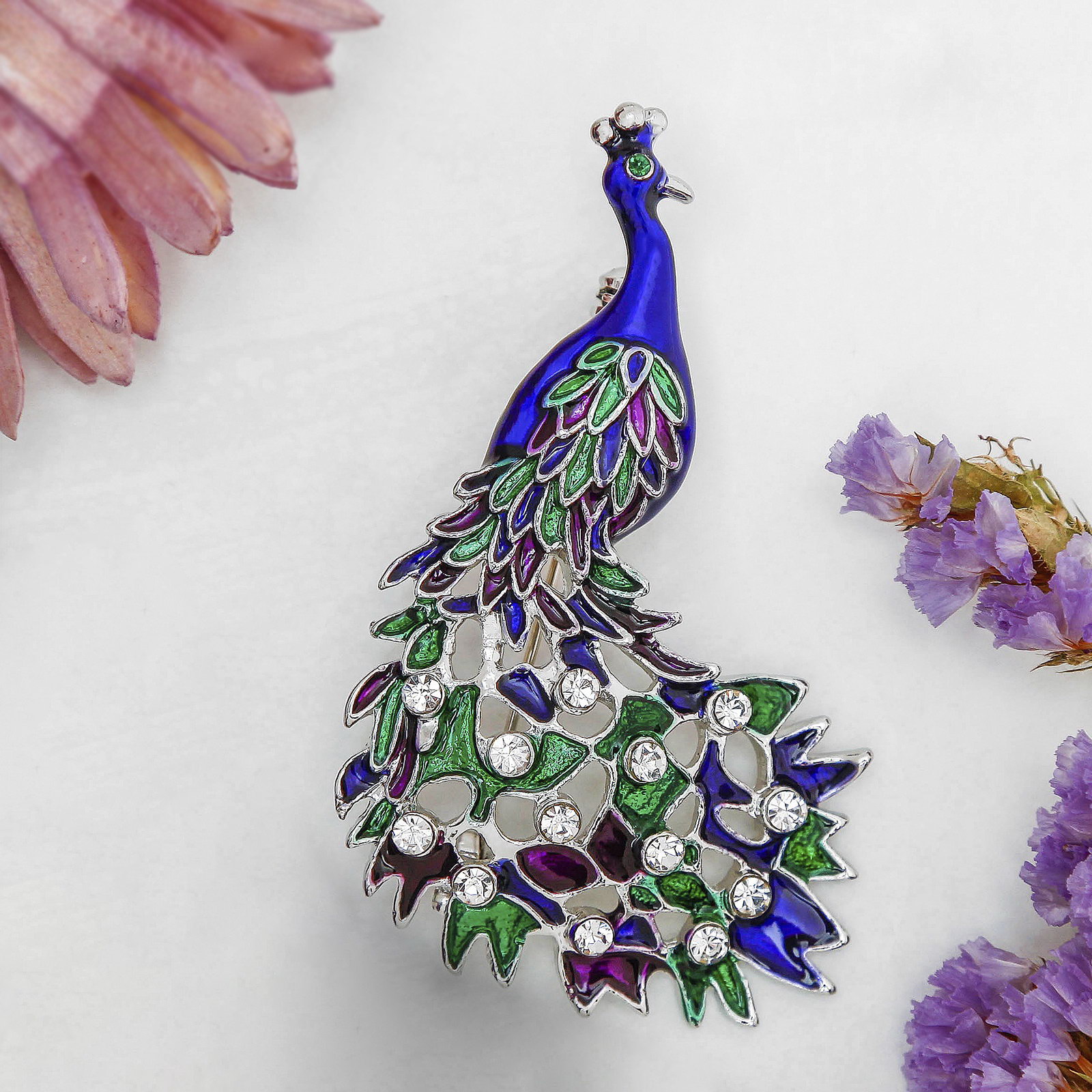 Брошь "Павлин роскошный", цветная в серебре, 4x6.5x1 см., QF, Китай